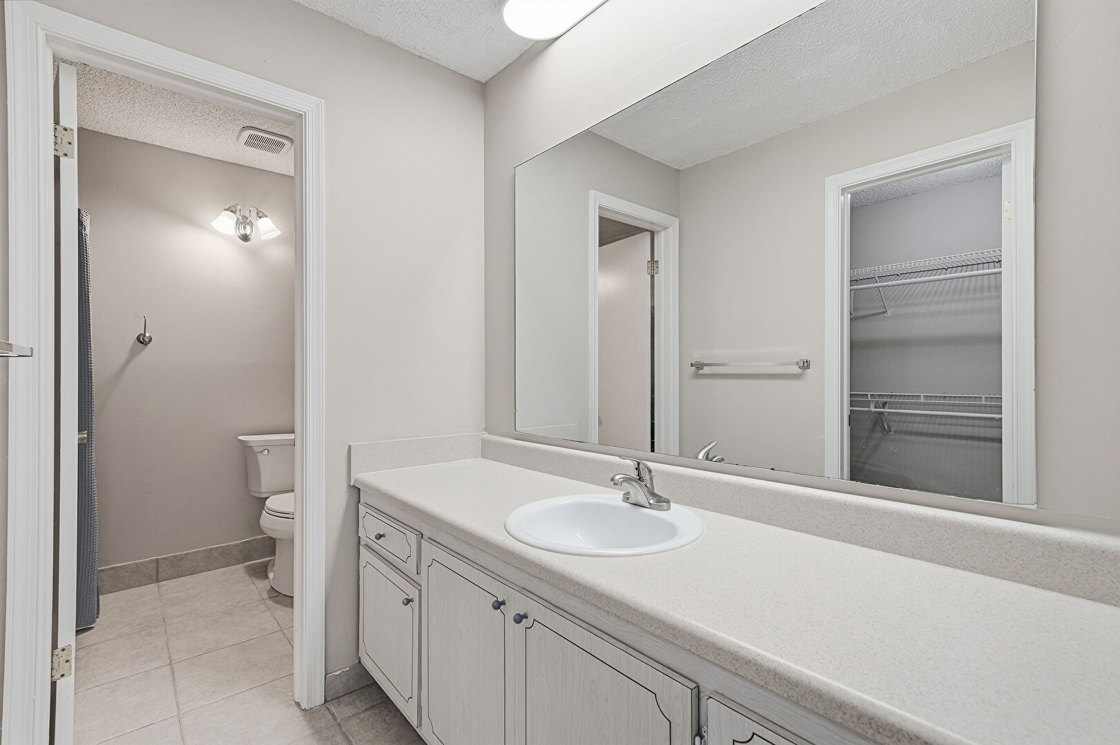Baseboards Wall, Drywall, Full Bathroom, Textured Ceiling, Vanity, Vent, Tile Floor