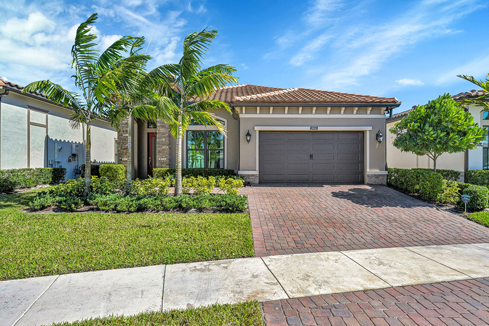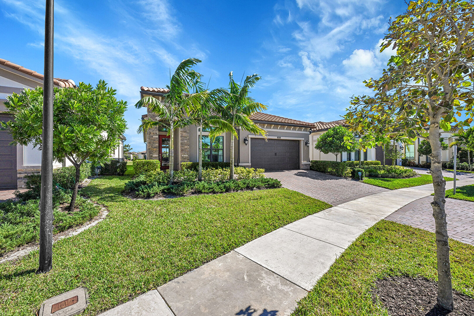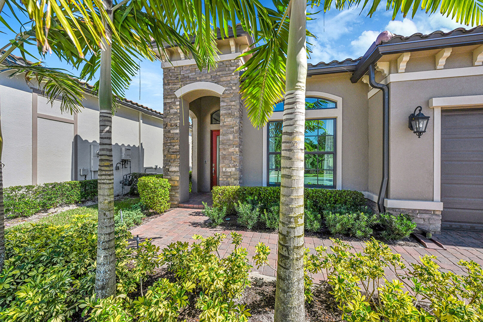 Downspout, Driveway, Lawn, Residential View, Stone Siding, Stucco Siding, Tile Roof, Water Meter, Driveway, Gutters, Lawn, Stone Siding, Tile Roof