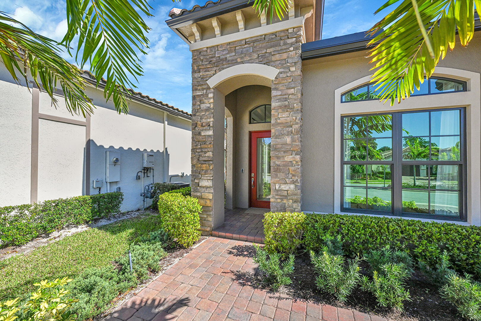 Downspout, Electric Meter, Gas Meter, Gutters, Stucco Siding, Tile Roof, Stone Siding