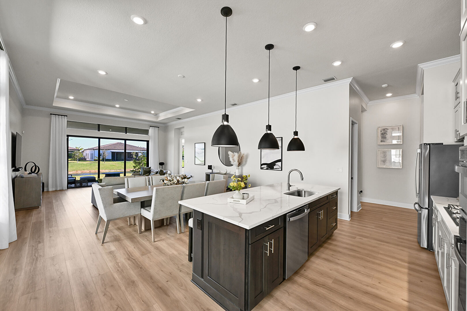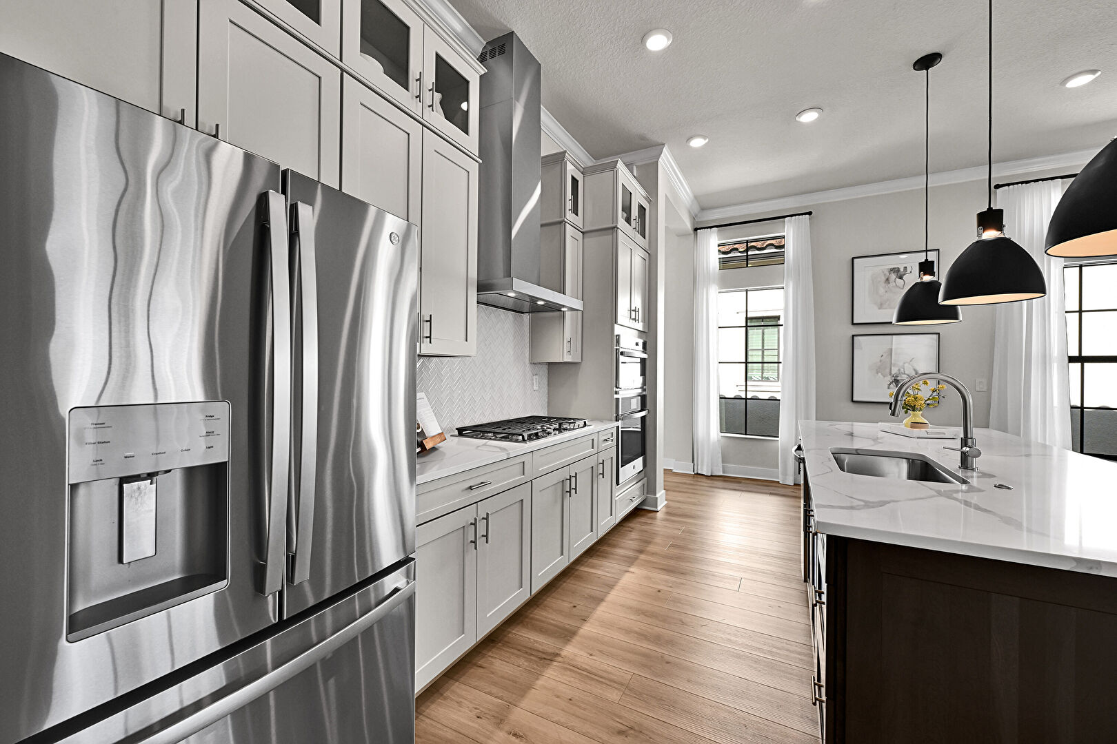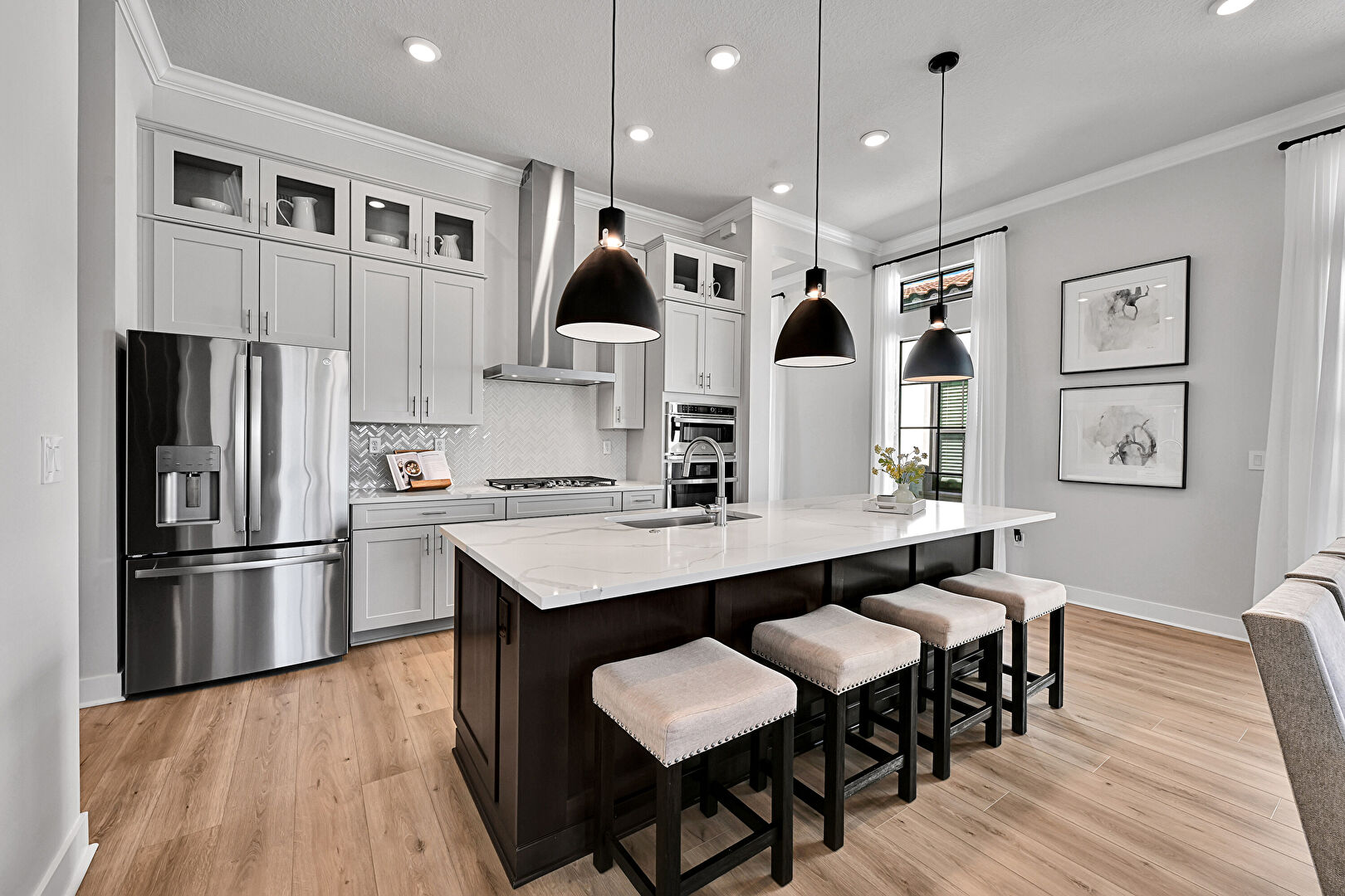Baseboards Wall, Black Cabinets, Crown Molding, Crown Molding Cabinets, Dark Brown Cabinets, Double Oven, Drywall, Glass Insert Cabinets, Gray Cabinets, Kitchen Bar, Kitchen Island, Natural Light, One Wall Kitchen, Opens To Living Area, Pendant Lighting, Recessed Lighting, Shaker Cabinets, Stone Countertops, Tray Ceiling, Vent, Wood Finish Floor, Crown Molding, Crown Molding Cabinets, Double Oven, Natural Light, Opens To Living Area, Recessed Lighting, Shaker Cabinets, Wood Finish Floor
