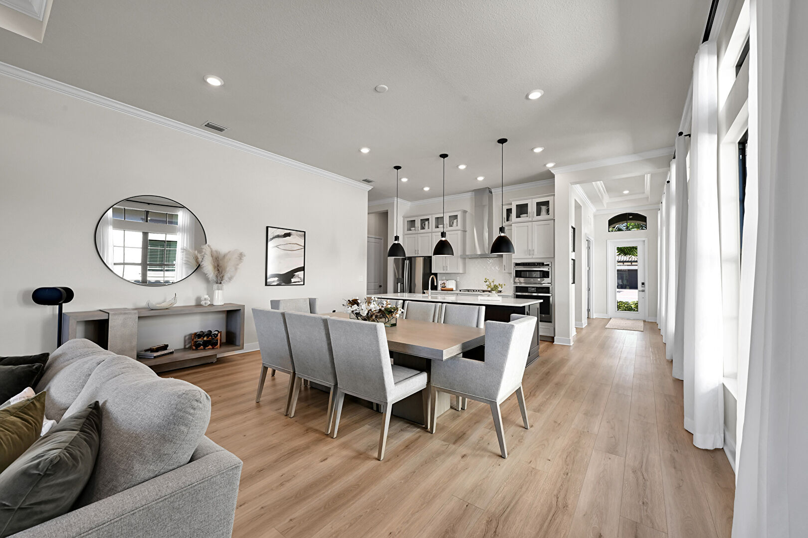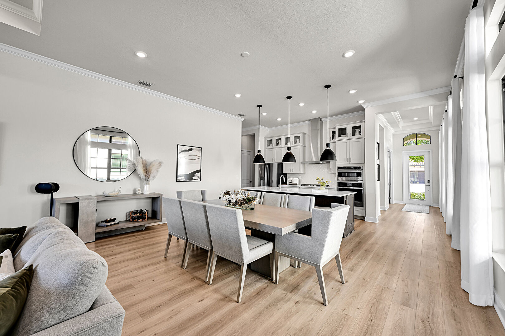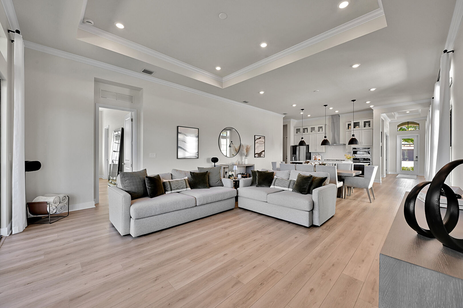 Baseboards Wall, Black Cabinets, Crown Molding, Crown Molding Cabinets, Dark Brown Cabinets, Double Oven, Drywall, Glass Insert Cabinets, Gray Cabinets, Kitchen Bar, Kitchen Island, Natural Light, One Wall Kitchen, Opens To Living Area, Pendant Lighting, Recessed Lighting, Shaker Cabinets, Stone Countertops, Tray Ceiling, Vent, Wood Finish Floor, Crown Molding, Crown Molding Cabinets, Double Oven, Natural Light, Opens To Living Area, Recessed Lighting, Shaker Cabinets, Wood Finish Floor