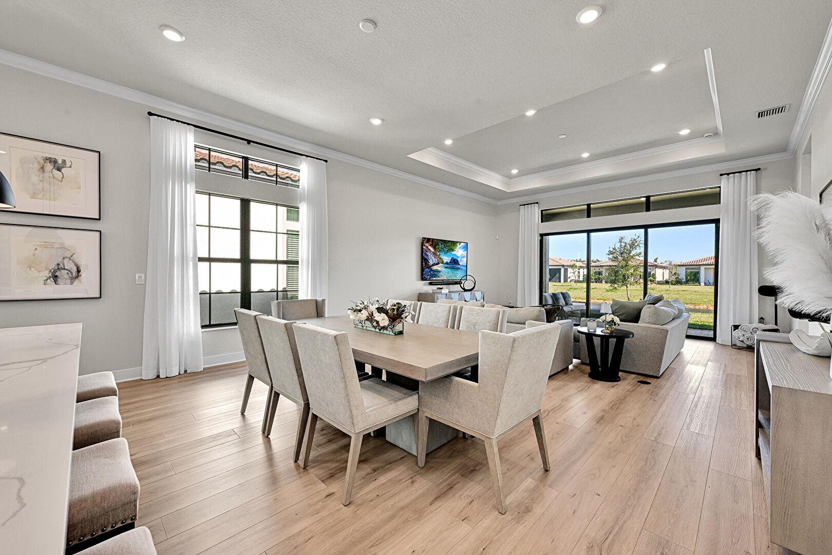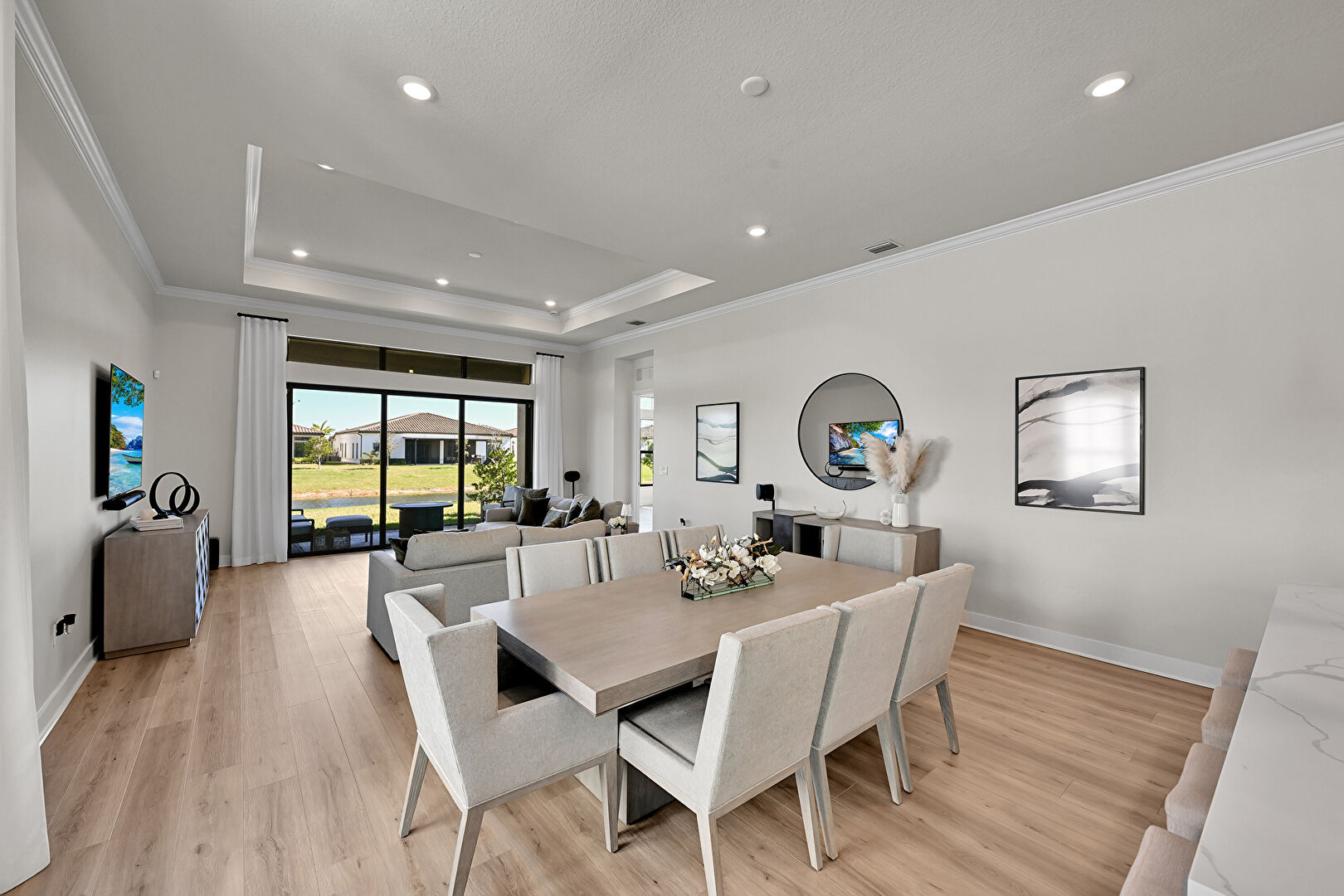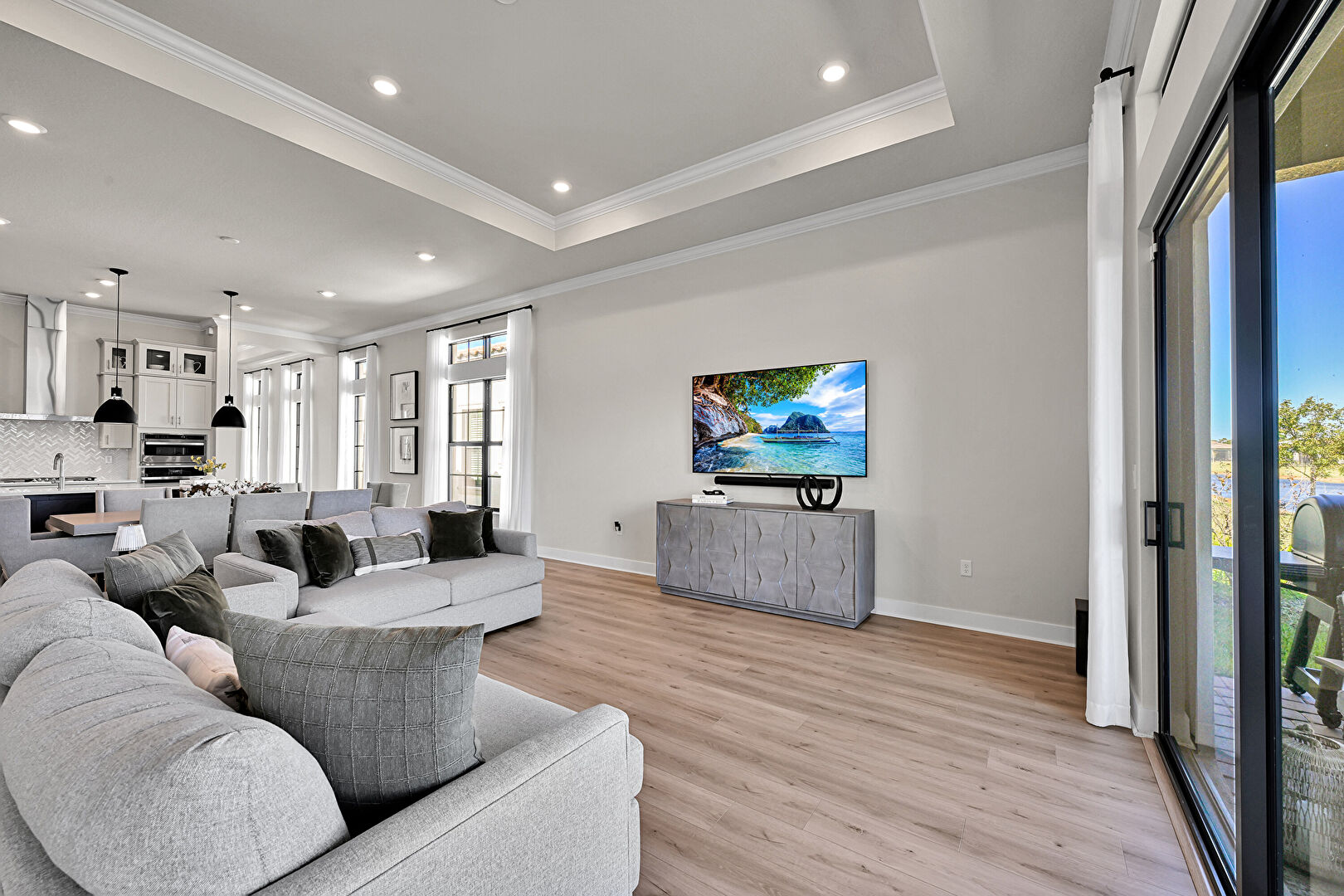 Baseboards Wall, Crown Molding, Double Oven, Drywall, L Shaped Kitchen, Natural Light, Recessed Lighting, Residential View, Tray Ceiling, Vent, Waterfront, Wood Finish Floor, Baseboards Wall, Double Oven, Drywall, Natural Light, Recessed Lighting, Wood Finish Floor