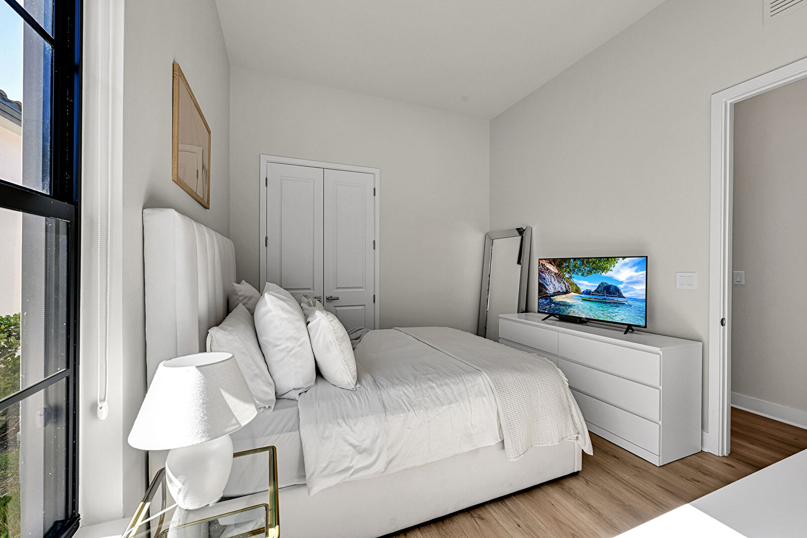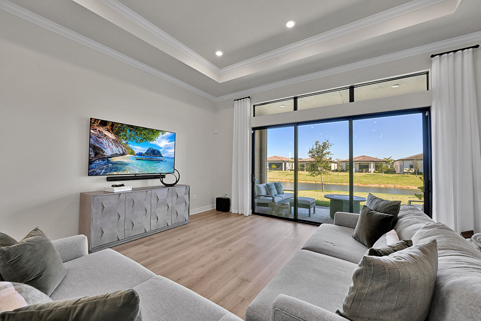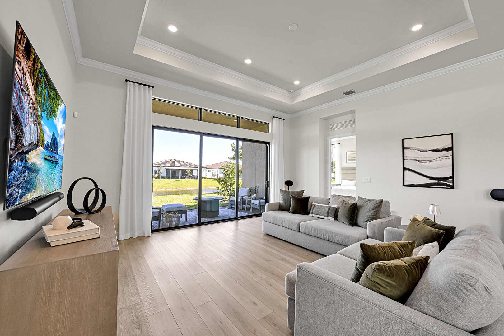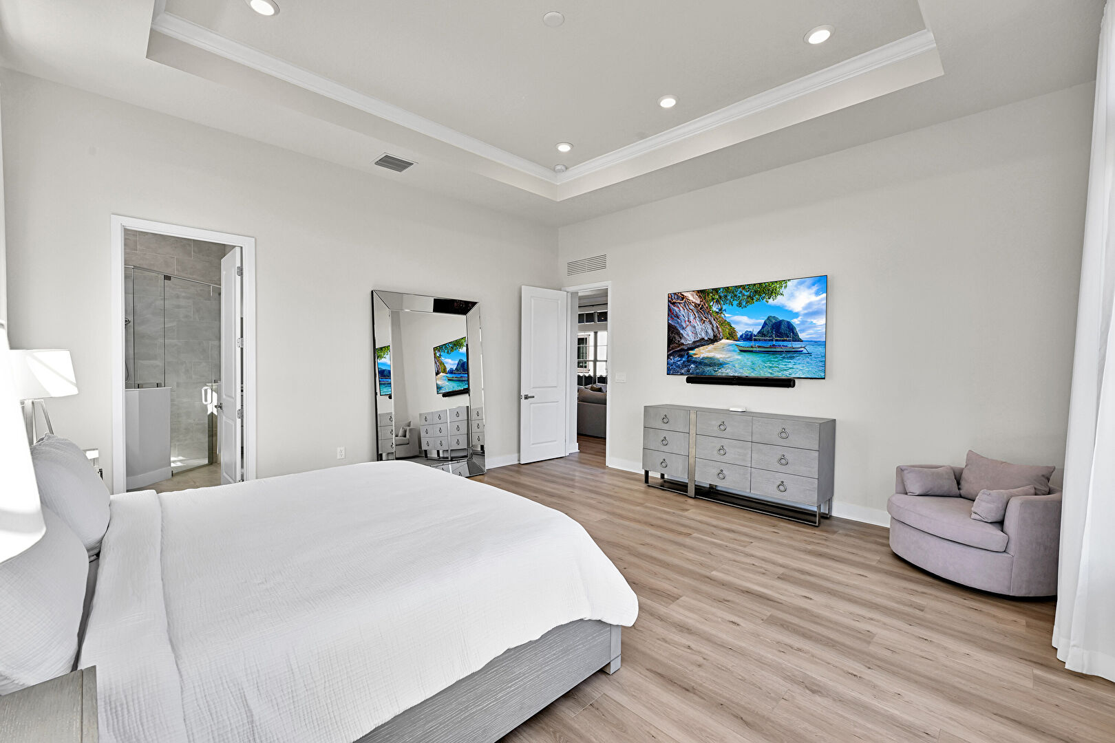 Baseboards Wall, Crown Molding, Drywall, Ensuite Bathroom, Natural Light, Recessed Lighting, Tray Ceiling, Vent, Water View, Waterfront, Wood Finish Floor, Closet, Crown Molding, Tray Ceiling