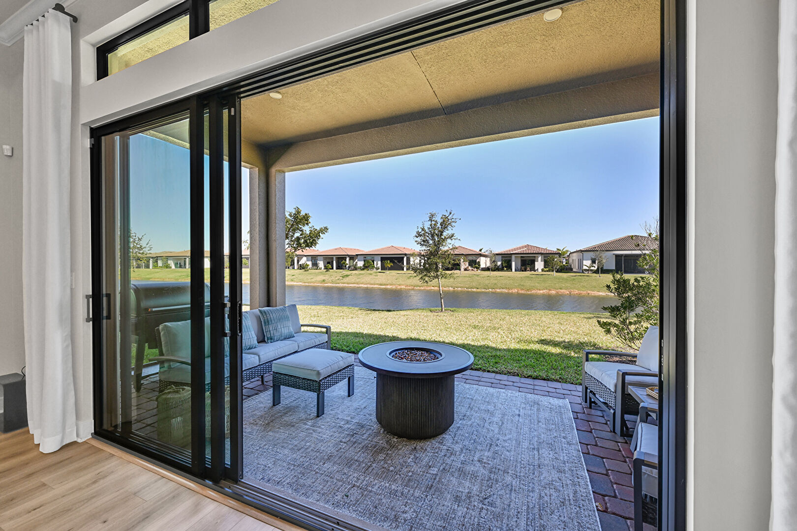 Fire Pit, Lawn, Outdoor Living Space, Patio, Pondfront, Residential View, Water View, Waterfront, Patio, Waterfront