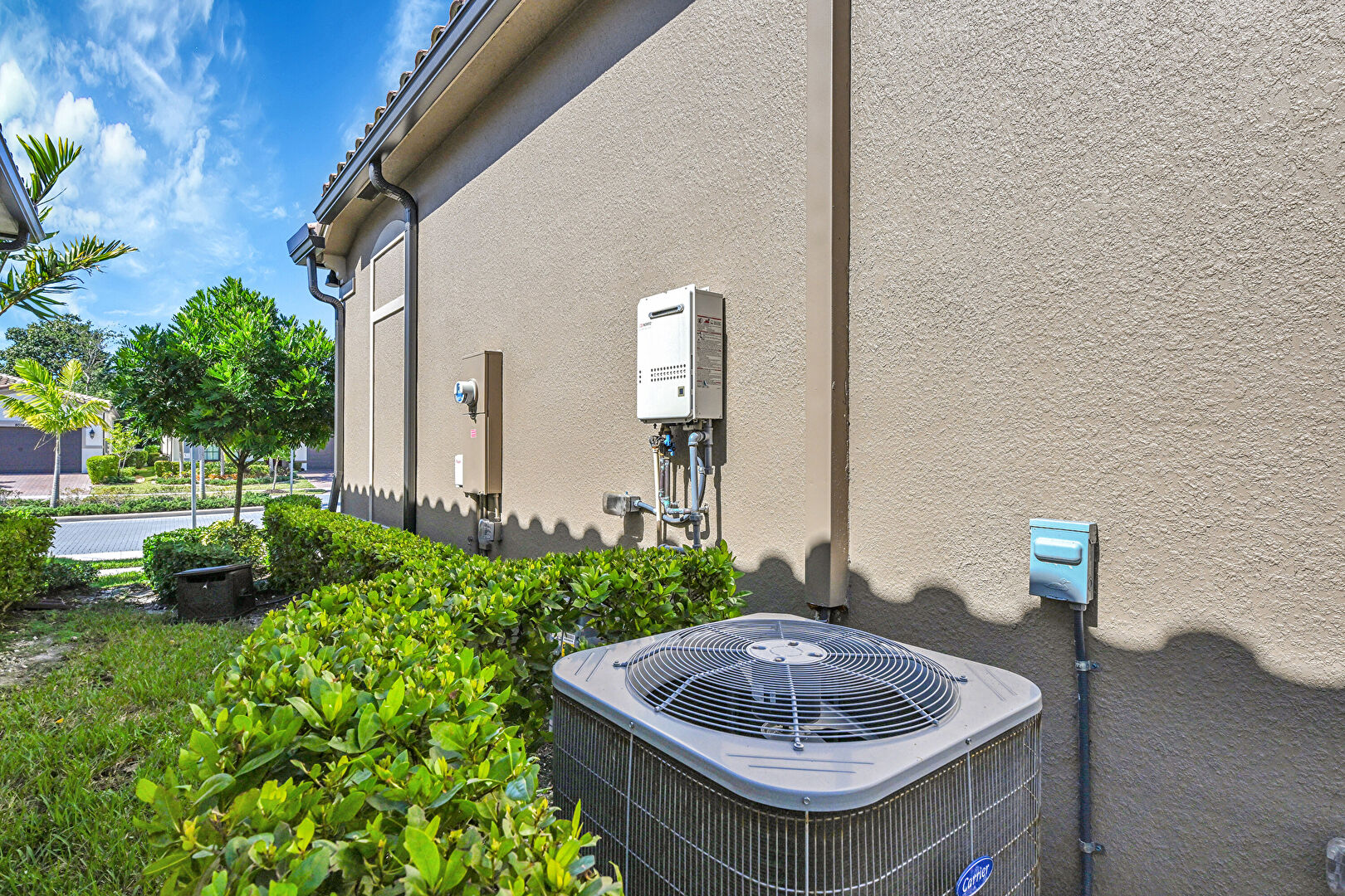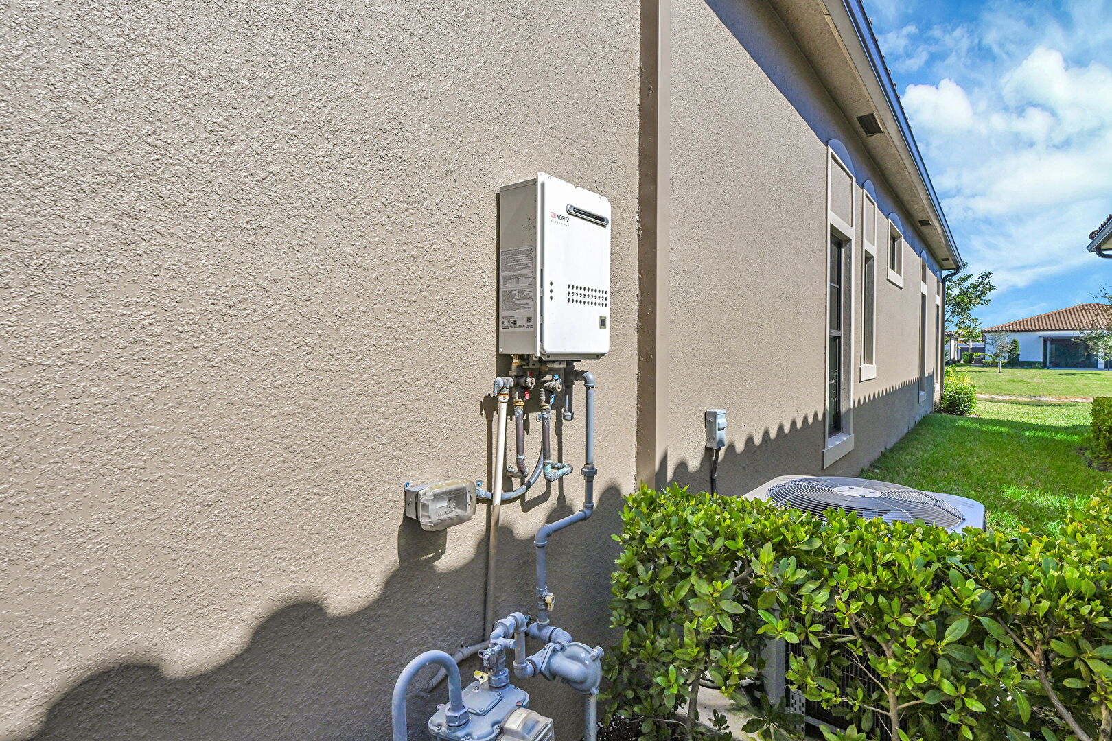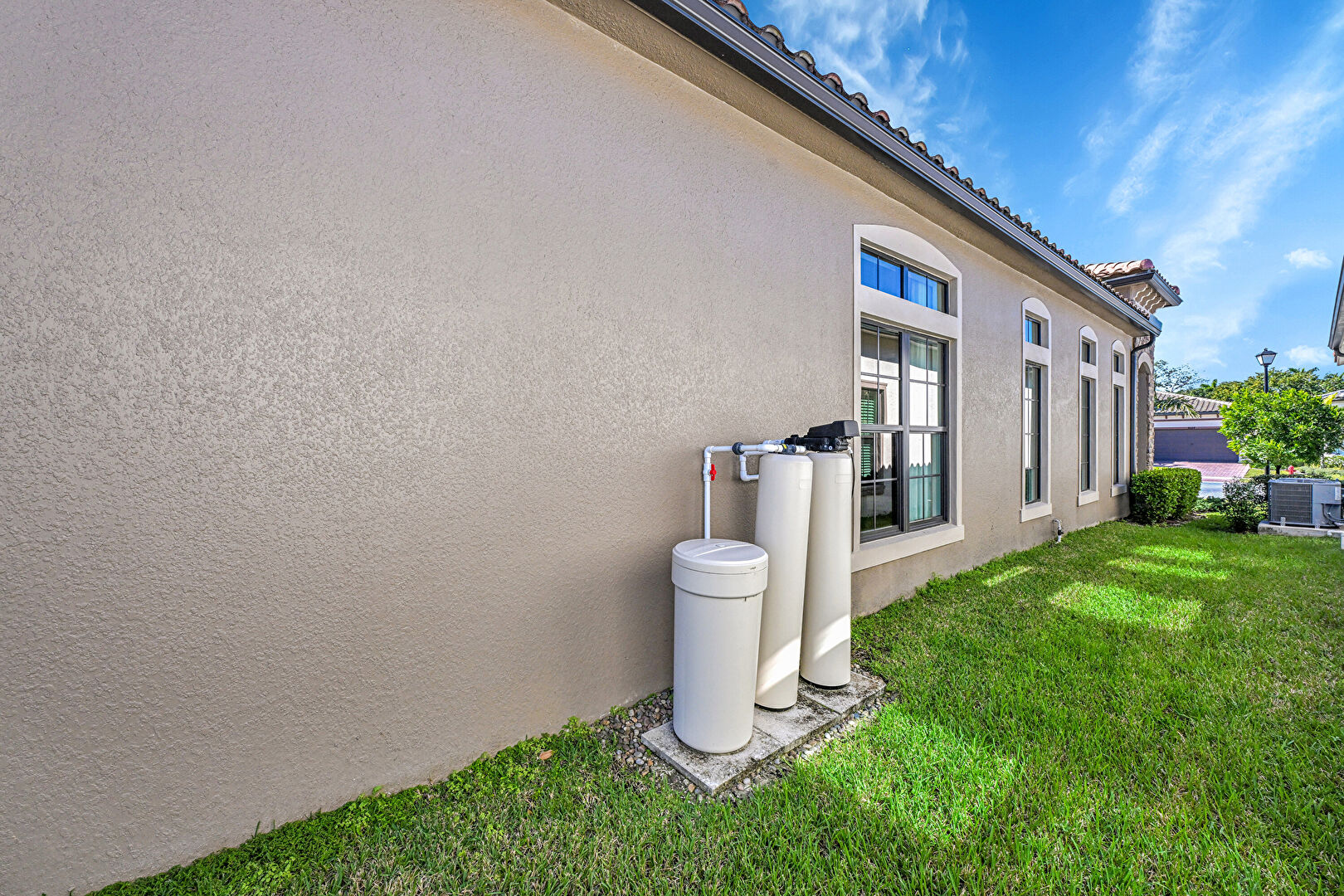 Central Ac, Downspout, Electric Meter, Gutters, Lawn, Stucco Siding, Tile Roof, Water Heater, Water Softener, Central Ac, Gas Meter, Lawn
