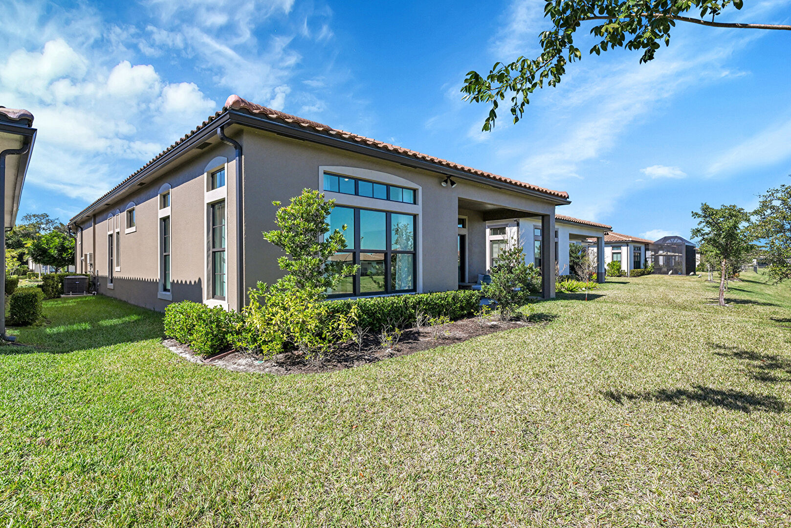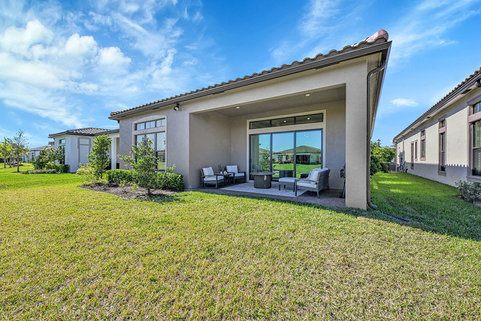 Downspout, Gutters, Lawn, Patio, Stucco Siding, Tile Roof, Central Ac