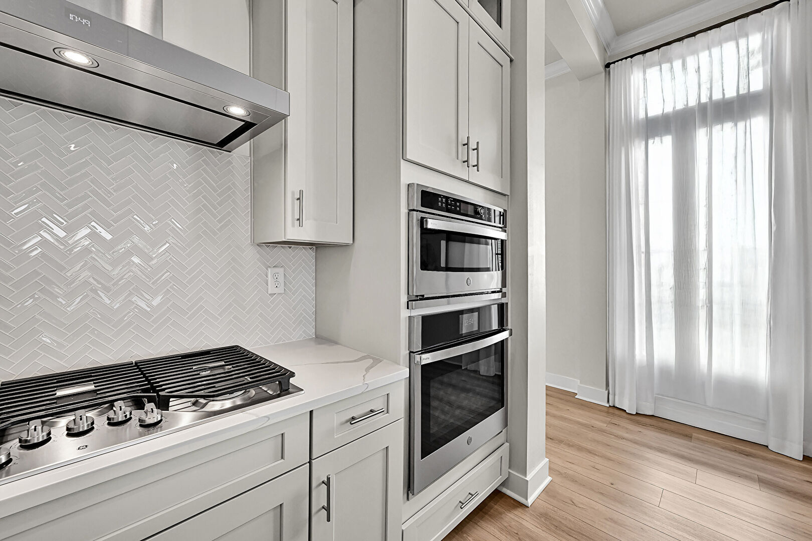 Baseboards Wall, Crown Molding, Double Oven, Drywall, L Shaped Kitchen, Natural Light, Recessed Lighting, Tray Ceiling, Vent, Wood Finish Floor, Baseboards Wall, Crown Molding, Double Oven, Vent, Wood Finish Floor