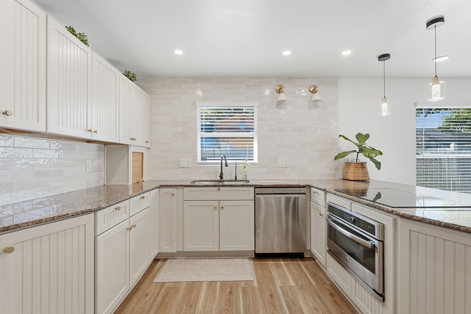 Arched Walkways, Baseboards Wall, Drywall, Kitchen Bar, Kitchen Island, Kitchen Peninsula, Natural Light, Pendant Lighting, Recessed Lighting, Shaker Cabinets, Stone Countertops, Vent, Wood Finish Floor, Kitchen Peninsula, Natural Light, Shaker Cabinets