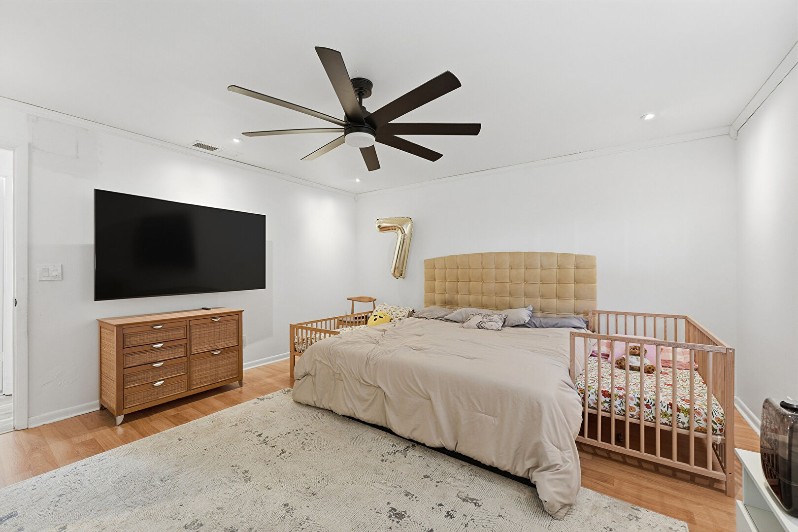Baseboards Wall, Ceiling Fan, Crown Molding, Drywall, Recessed Lighting, Vent, Wood Finish Floor, Ceiling Fan, Drywall