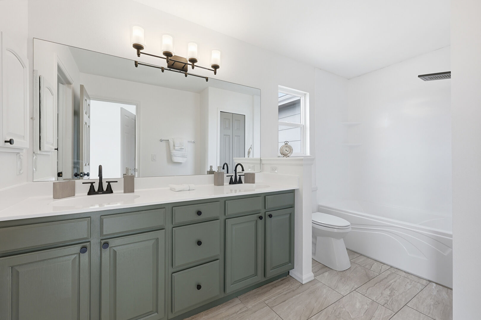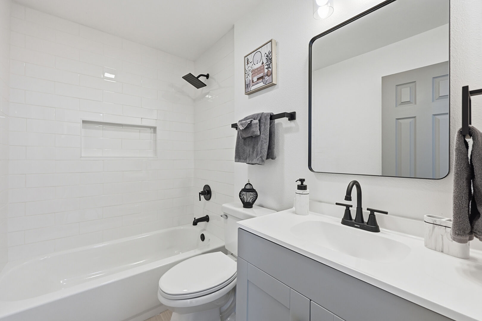 Combined Bath Shower, Drywall, Full Bathroom, Half Bathroom, Natural Light, Vanity, Wood Finish Floor, Baseboards Wall, Combined Bath Shower