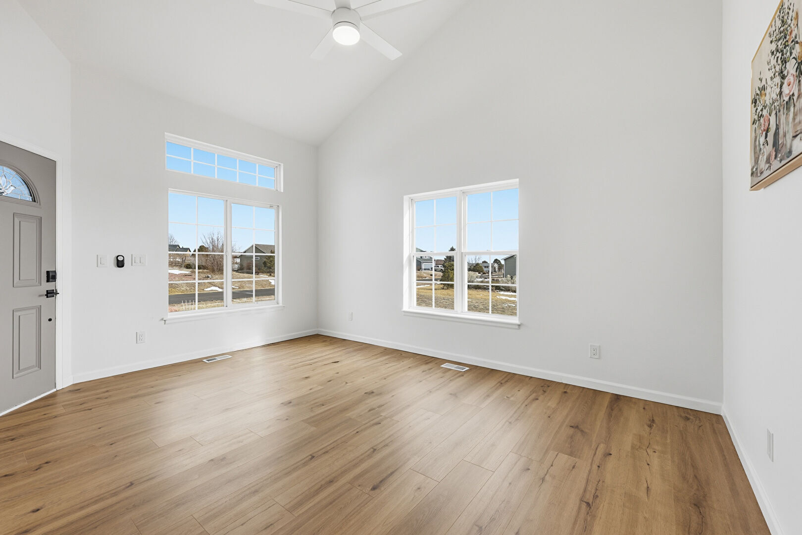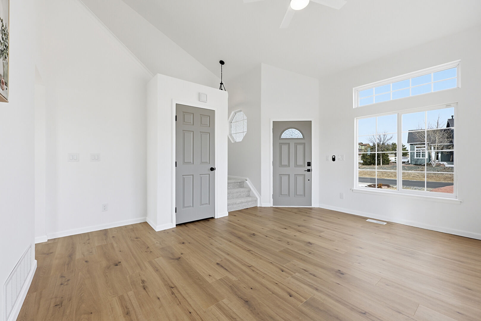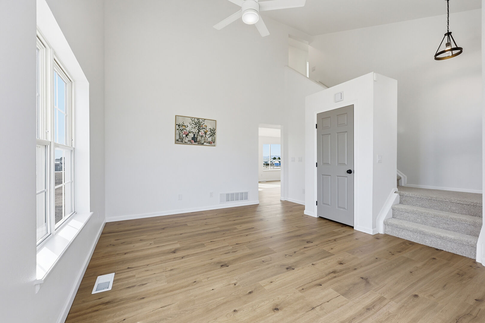Baseboards Wall, Ceiling Fan, Drywall, High Ceiling, Natural Light, Stairs, Vaulted Ceiling, Vent, Wood Finish Floor, Baseboards Wall, Drywall, High Ceiling
