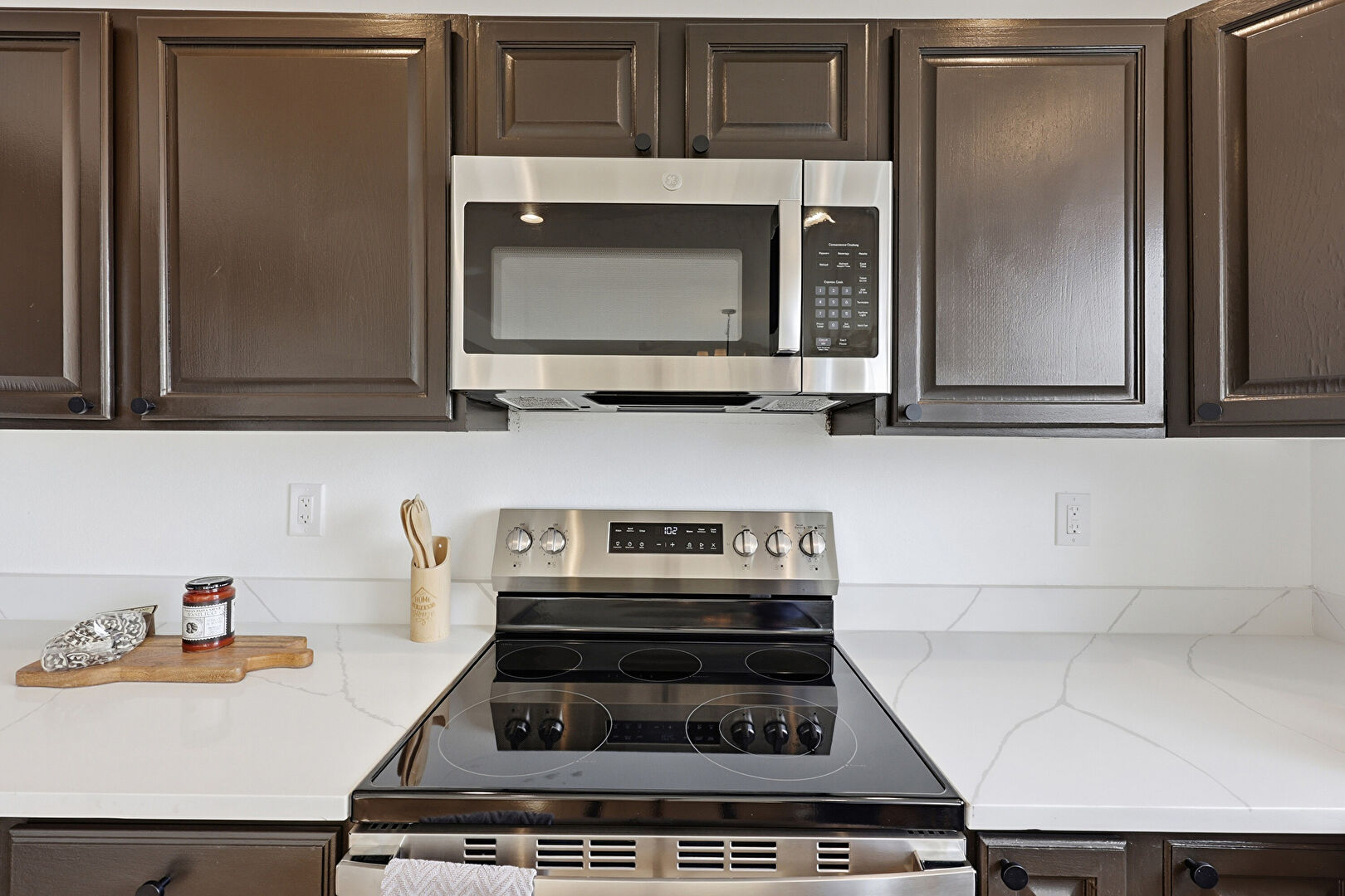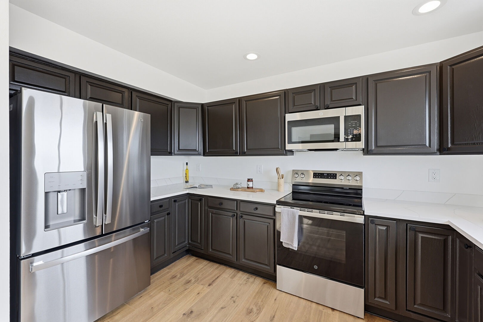 Accent Wall, Baseboards Wall, Dark Brown Cabinets, Drywall, Fireplace, Natural Light, Notable Chandelier, Opens To Living Area, Pendant Lighting, Raised Cabinets, Recessed Lighting, Smoke Carbon Monoxide Detector, Stone Countertops, Vent, Wood Finish Floor, Wood Wall, Dark Brown Cabinets, Raised Cabinets, Stone Countertops, U Shaped Kitchen, Wood Finish Floor
