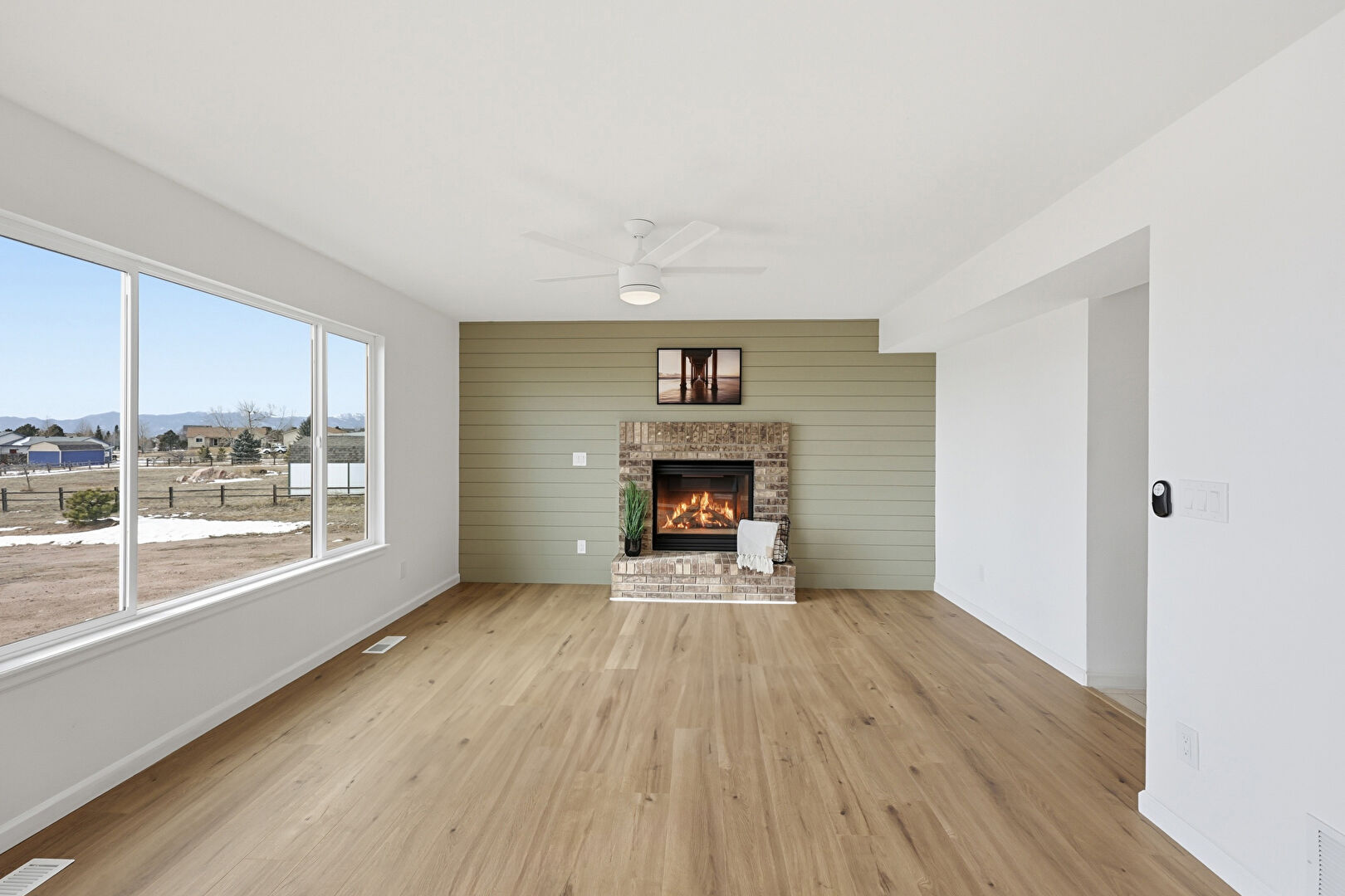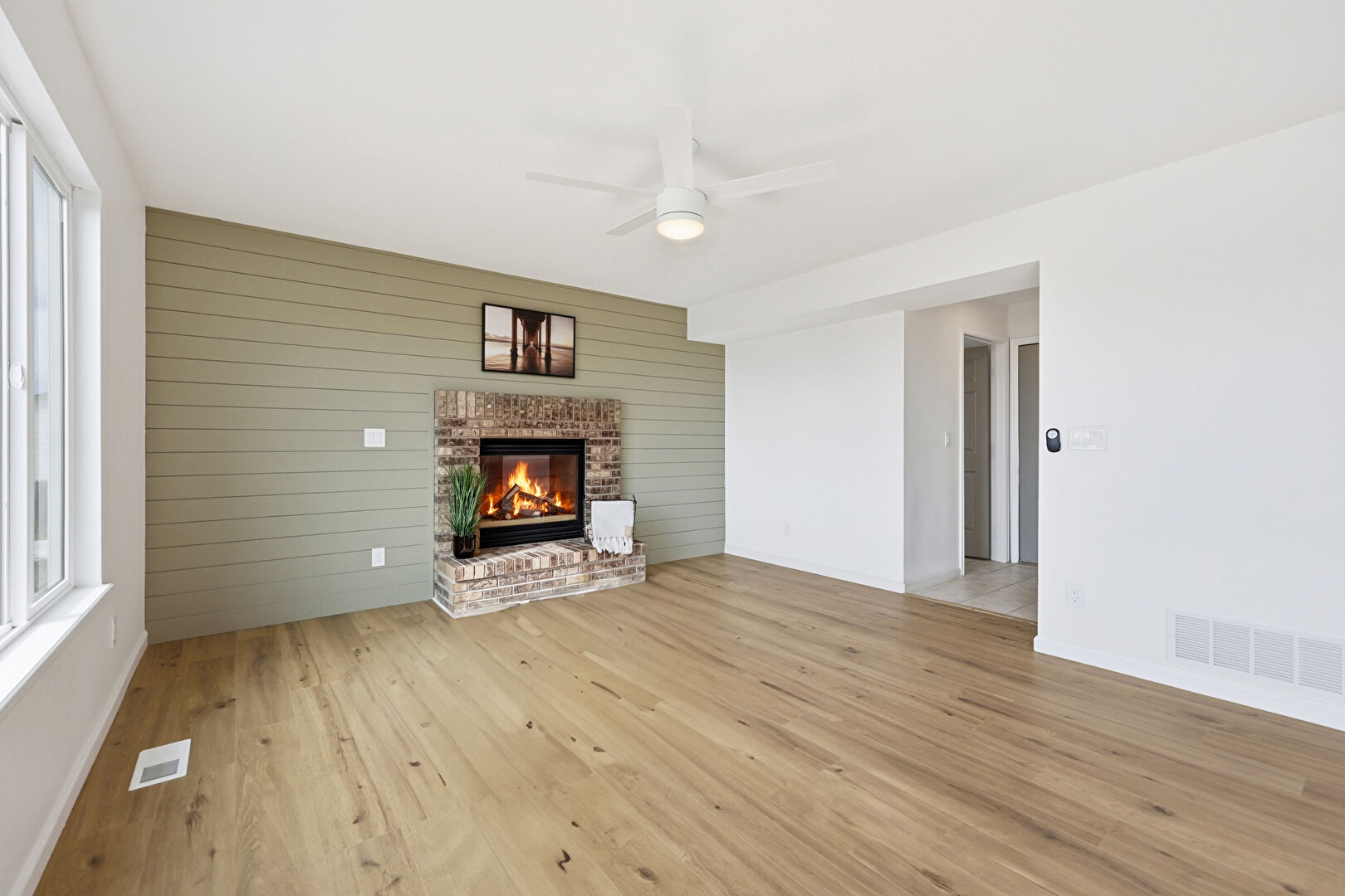 Accent Wall, Baseboards Wall, Ceiling Fan, Drywall, Fireplace, Natural Light, Notable Chandelier, Recessed Lighting, Vent, Wood Finish Floor, Wood Wall, Ceiling Fan, Drywall, Wood Wall
