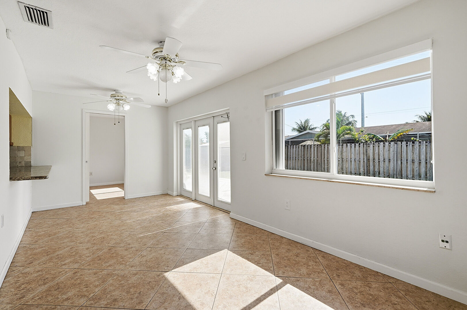 Baseboards Wall, Ceiling Fan, Drywall, Natural Light, Tile Floor, Vent, French Doors