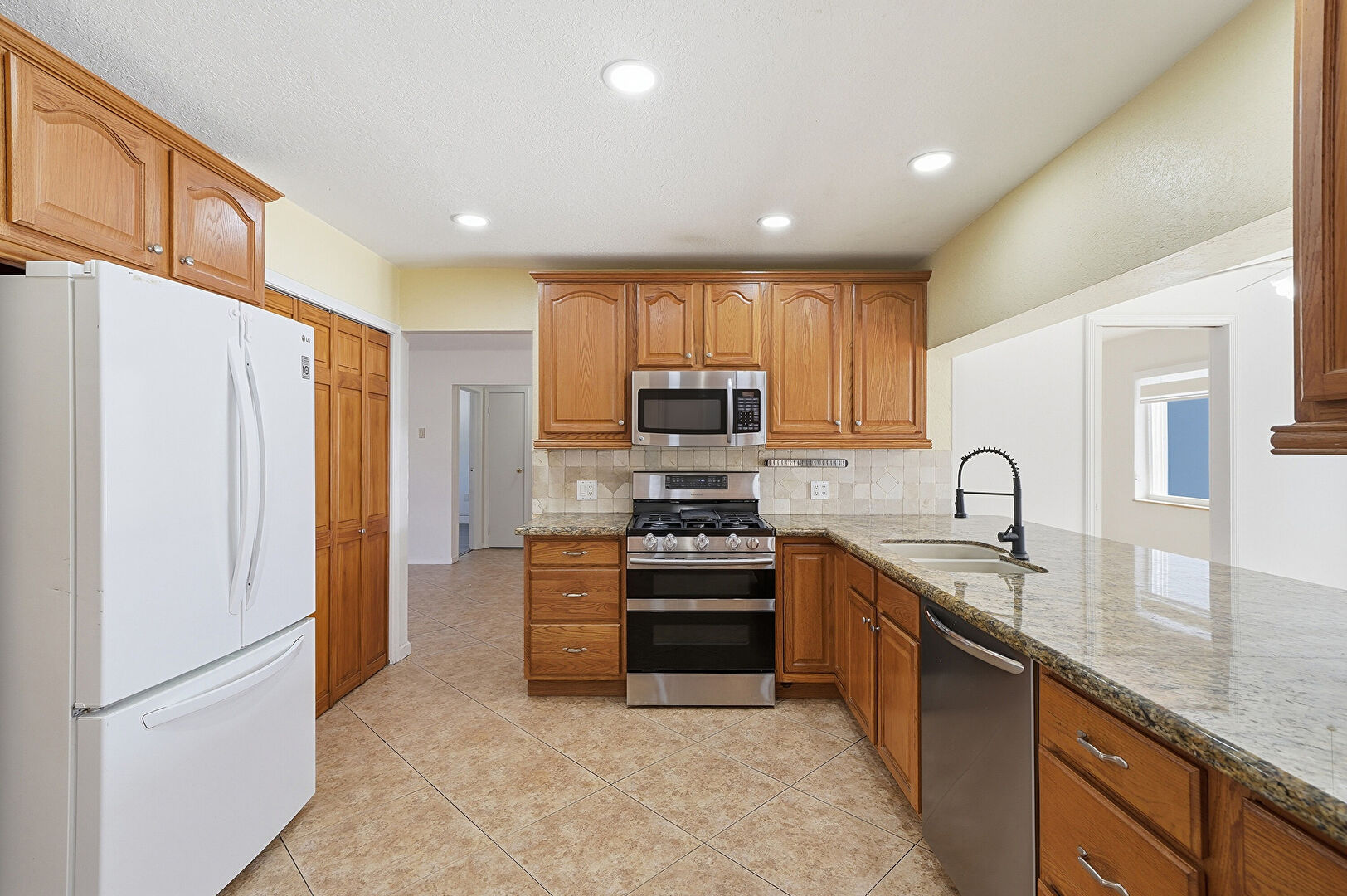 Arched Cabinets, Baseboards Wall, Ceiling Fan, Crown Molding Cabinets, Drywall, French Doors, Glass Insert Cabinets, Kitchen Peninsula, Medium Brown Cabinets, Natural Light, Notable Chandelier, Pass Through Window, Raised Cabinets, Recessed Lighting, Stone Countertops, Textured Ceiling, Tile Floor, Vent, Arched Cabinets, Baseboards Wall, Ceiling Fan, Natural Light, Recessed Lighting