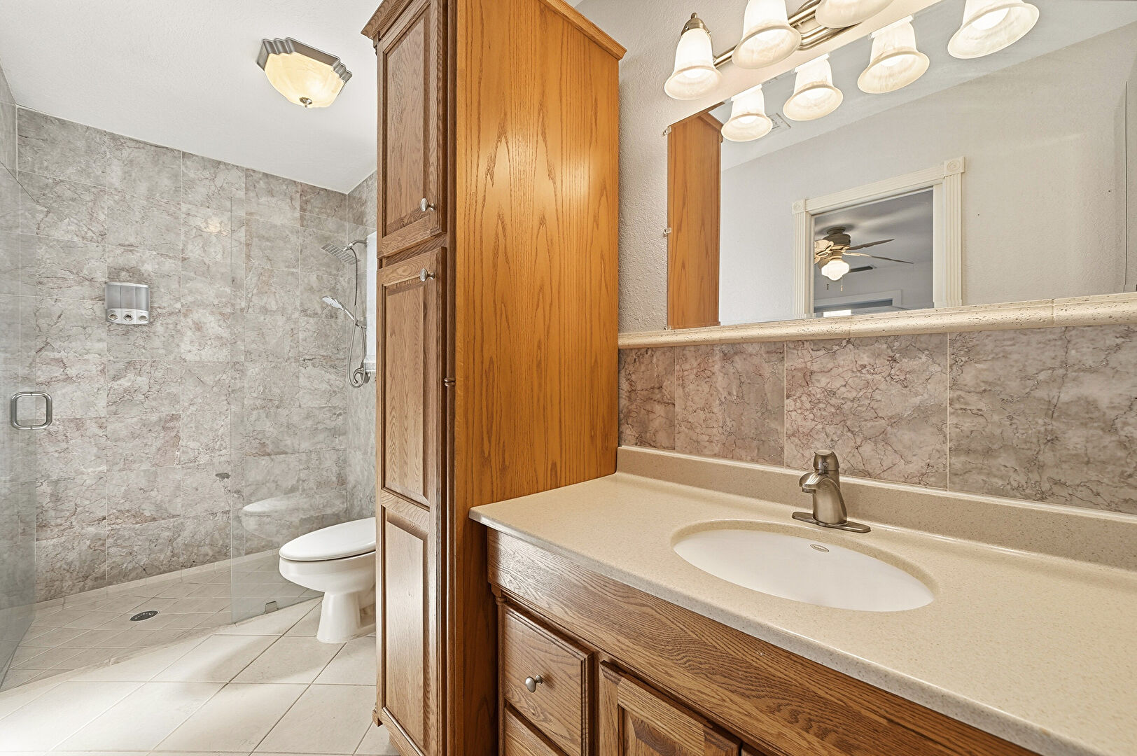 Ceiling Fan, Tile Floor, Tile Wall, Vanity, Full Bathroom