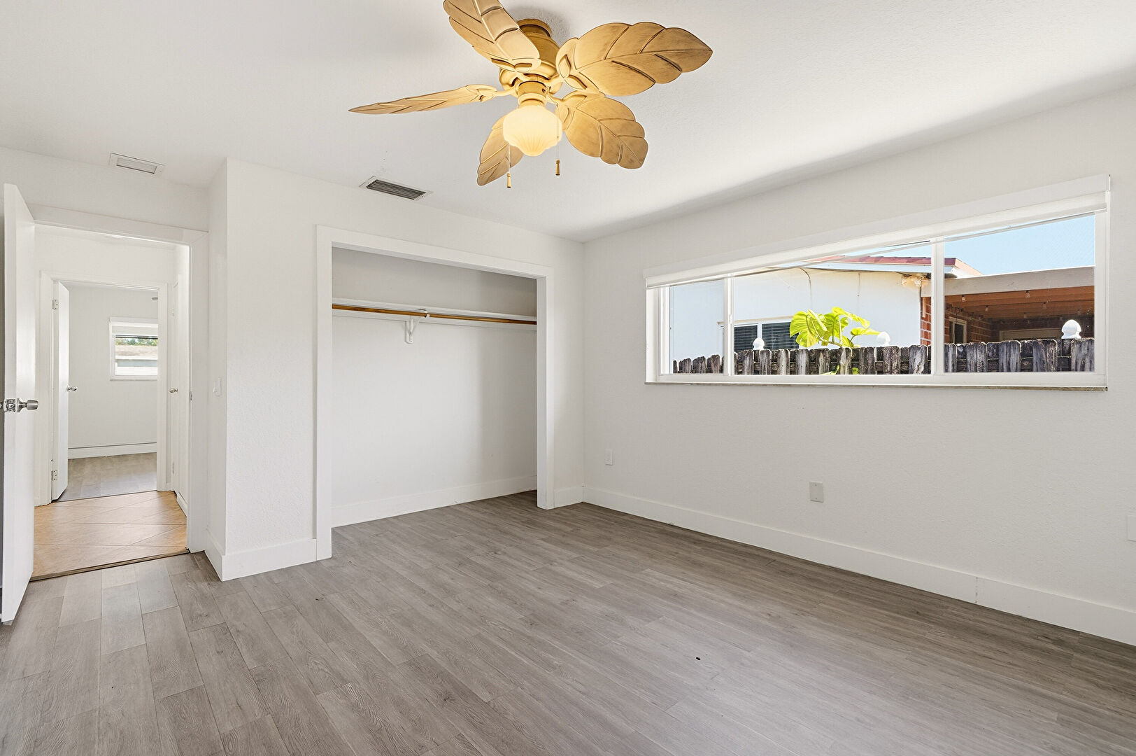Baseboards Wall, Ceiling Fan, Closet, Drywall, Natural Light, Textured Ceiling, Vent, Wood Finish Floor, Baseboards Wall, Ceiling Fan