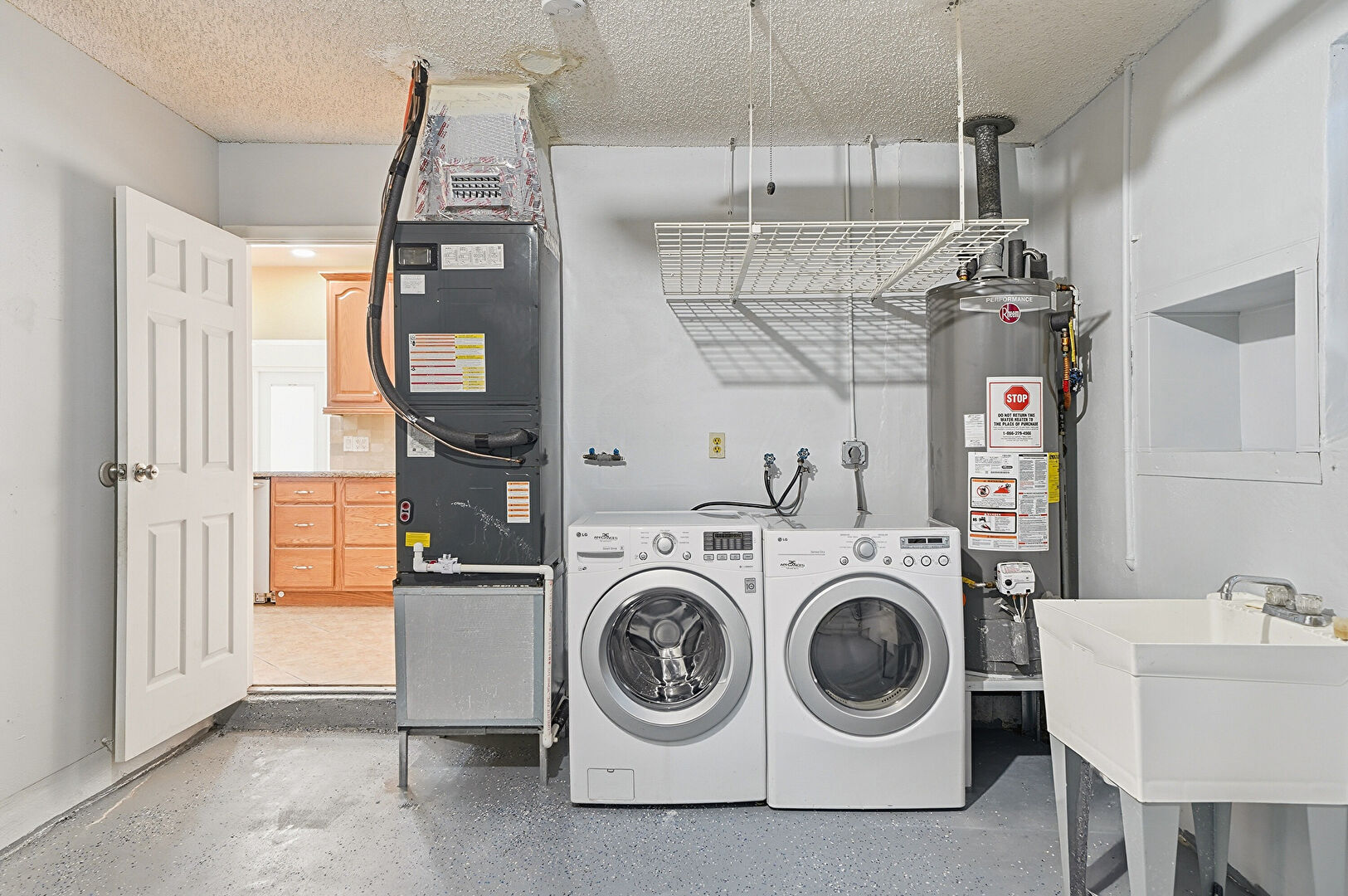 Drywall, Electric Dryer Hookup, Furnace, Laundry, Textured Ceiling, Washer Hookup, Water Heater, Concrete Floor