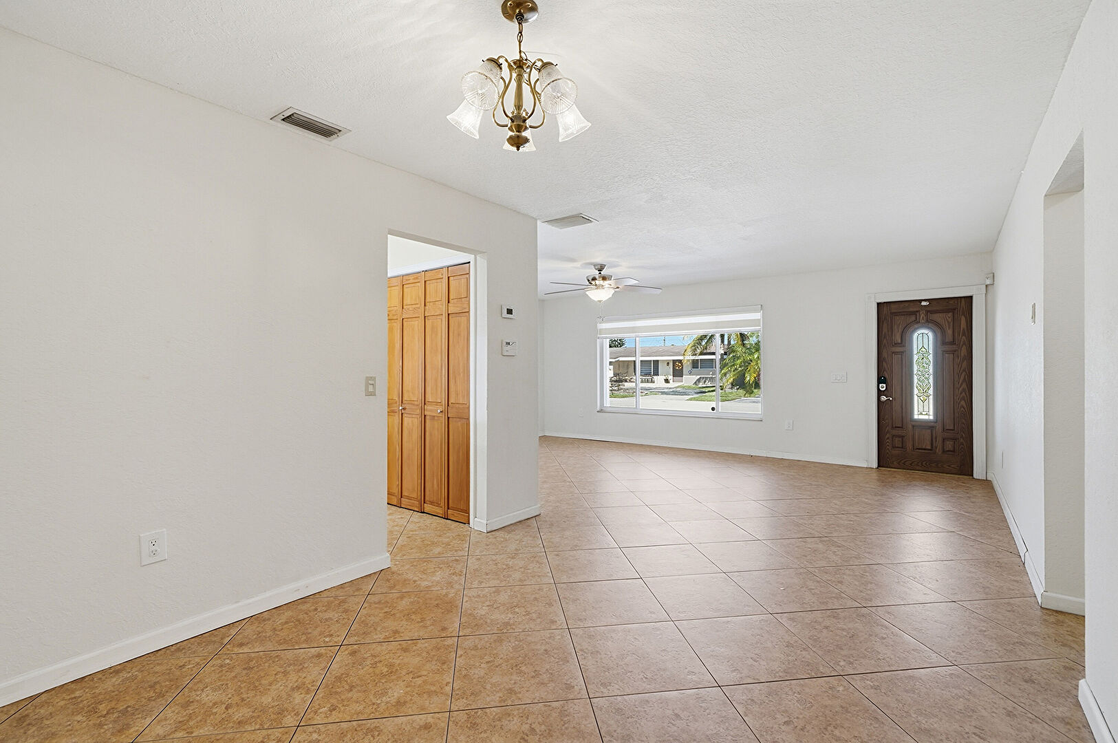 Baseboards Wall, Ceiling Fan, Drywall, Natural Light, Notable Chandelier, Tile Floor, Vent, Natural Light, Textured Ceiling, Vent