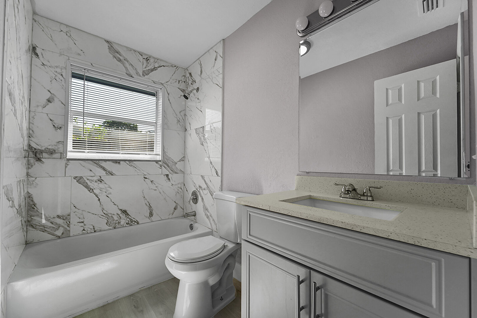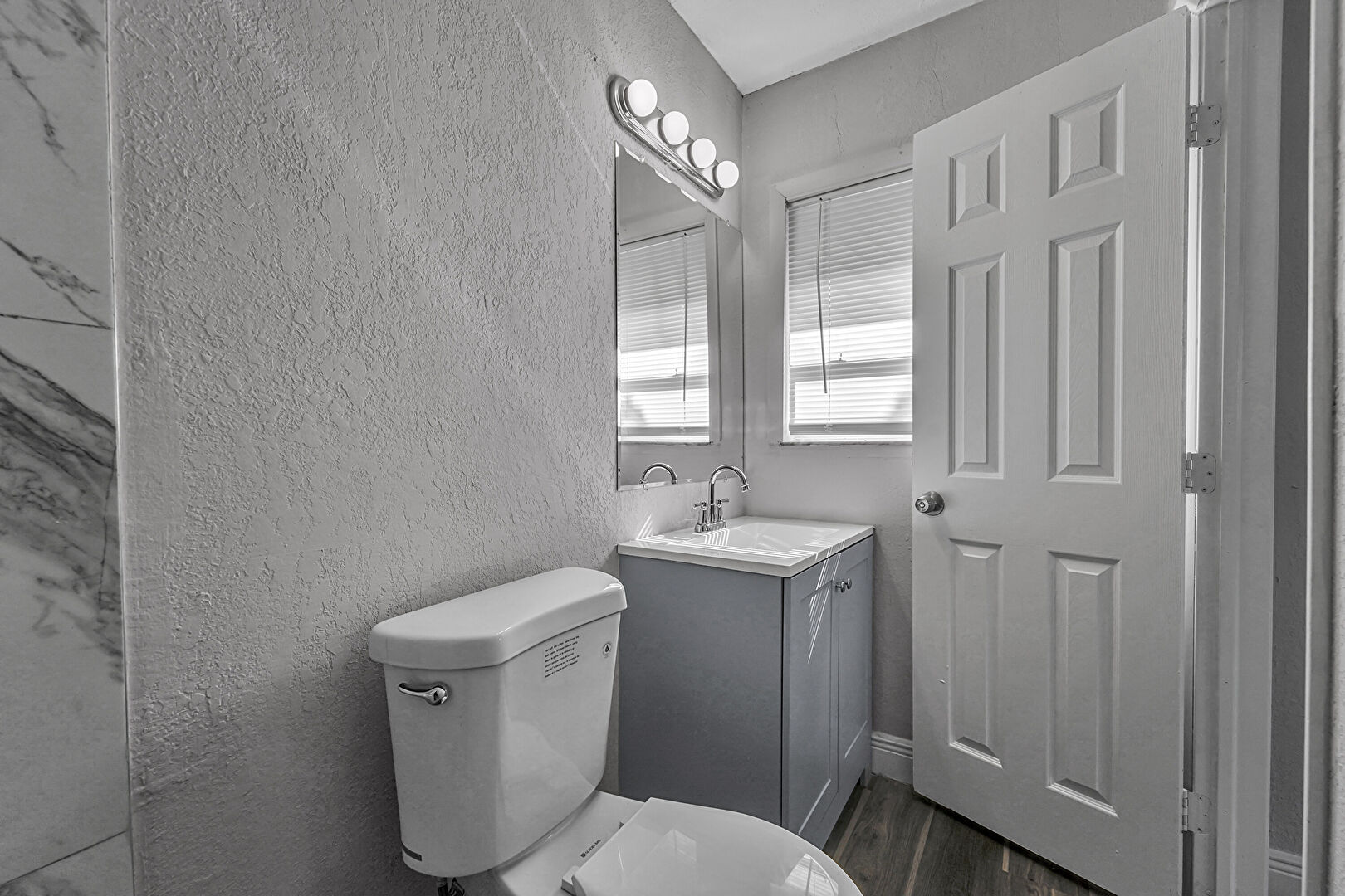 Baseboards Wall, Full Bathroom, Half Bathroom, Natural Light, Textured Wall, Vanity, Wood Finish Floor, Vanity, Wood Finish Floor