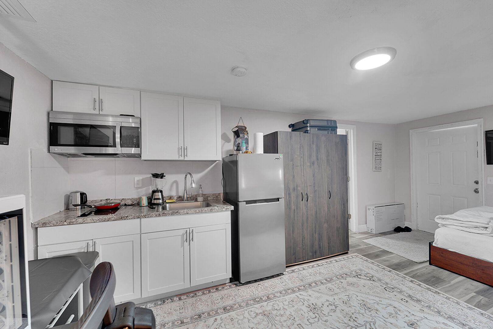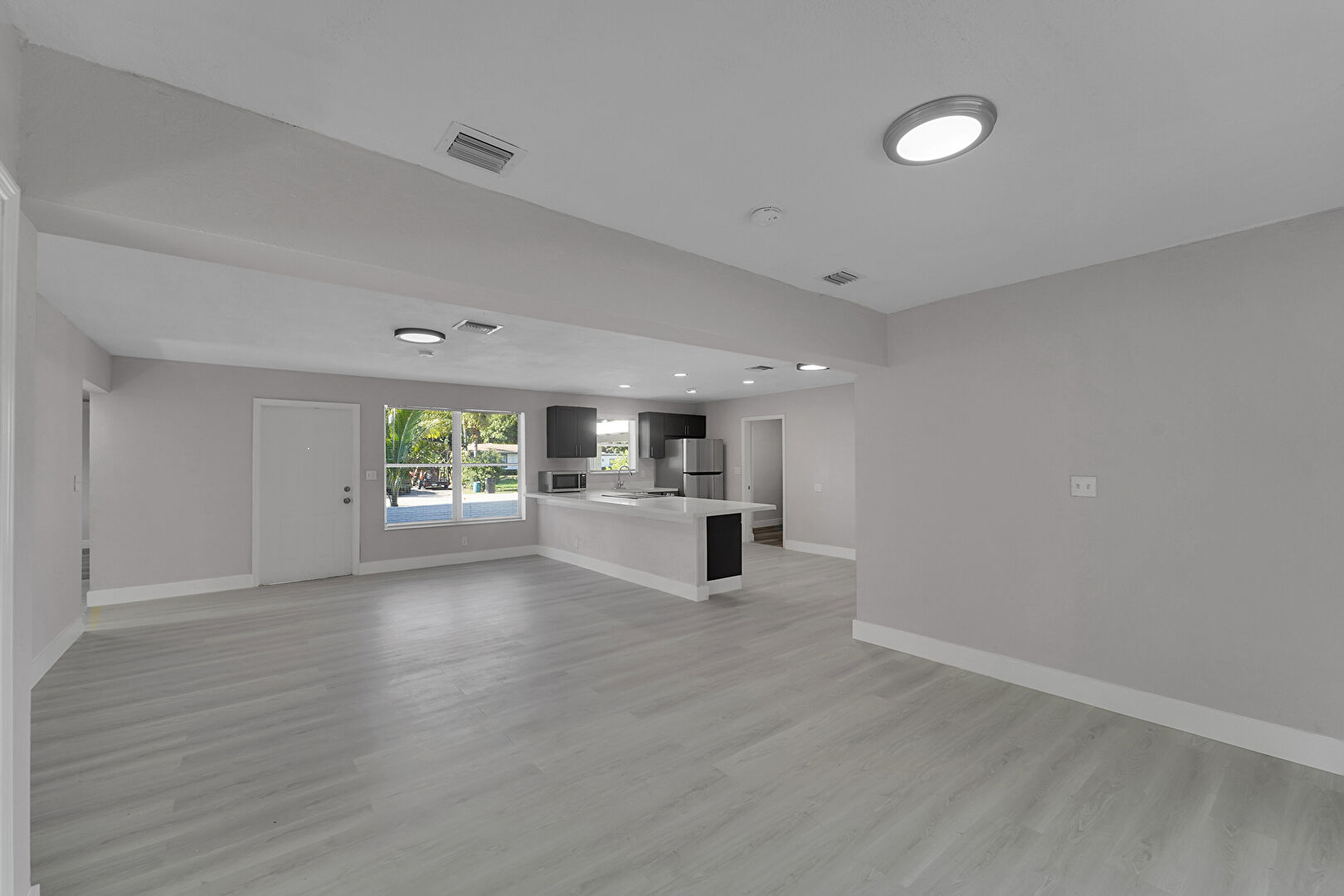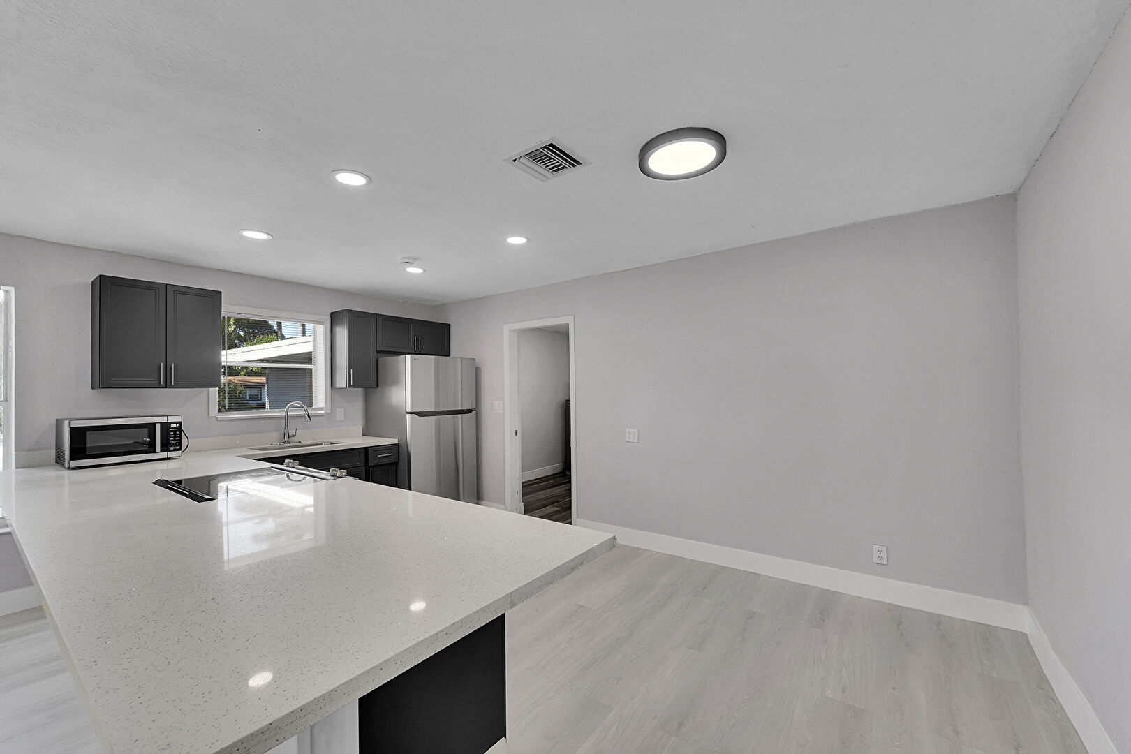 Baseboards Wall, Drywall, Gray Cabinets, Kitchen Peninsula, L Shaped Kitchen, Natural Light, Opens To Living Area, Recessed Lighting, Shaker Cabinets, Smoke Carbon Monoxide Detector, Stone Countertops, Vent, Wood Finish Floor, Black Cabinets, Natural Light, Opens To Living Area