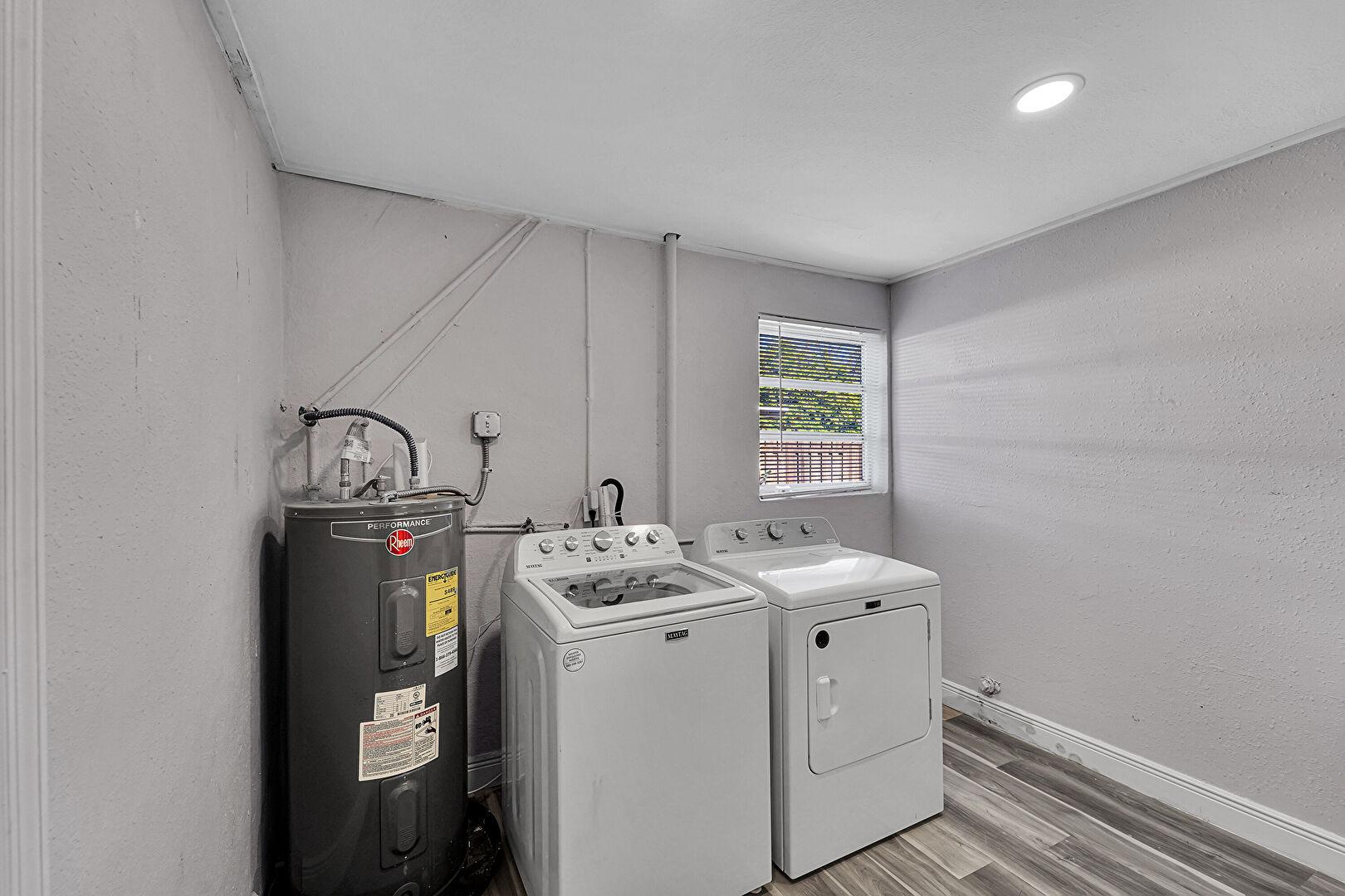 Laundry, Natural Light, Recessed Lighting, Textured Wall, Water Heater, Wood Finish Floor, Baseboards Wall