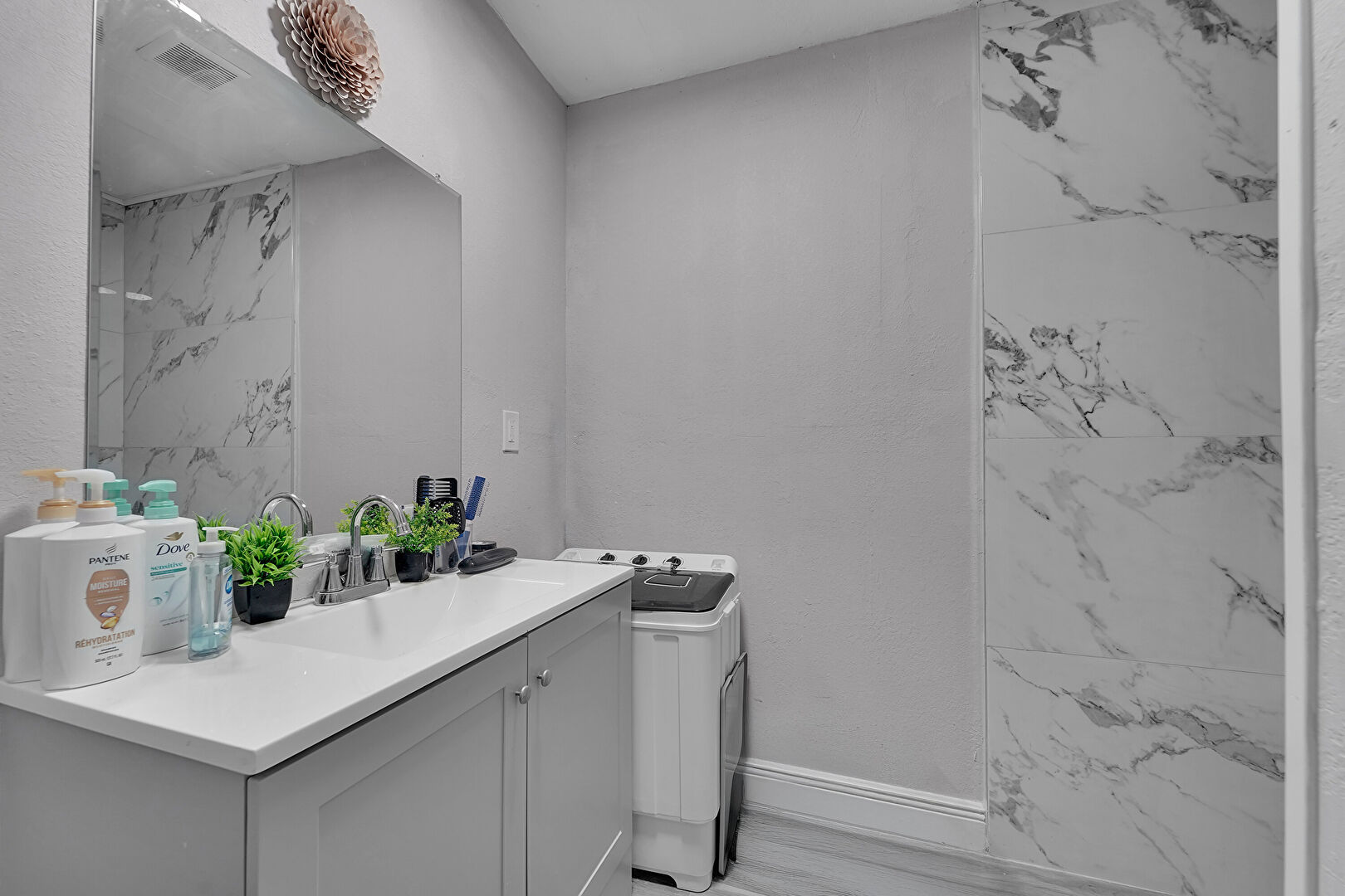 Combined Bath Shower, Drywall, Full Bathroom, Laundry, Natural Light, Textured Wall, Vanity, Vent, Washer Dryer, Wood Finish Floor, Baseboards Wall, Drywall, Full Bathroom