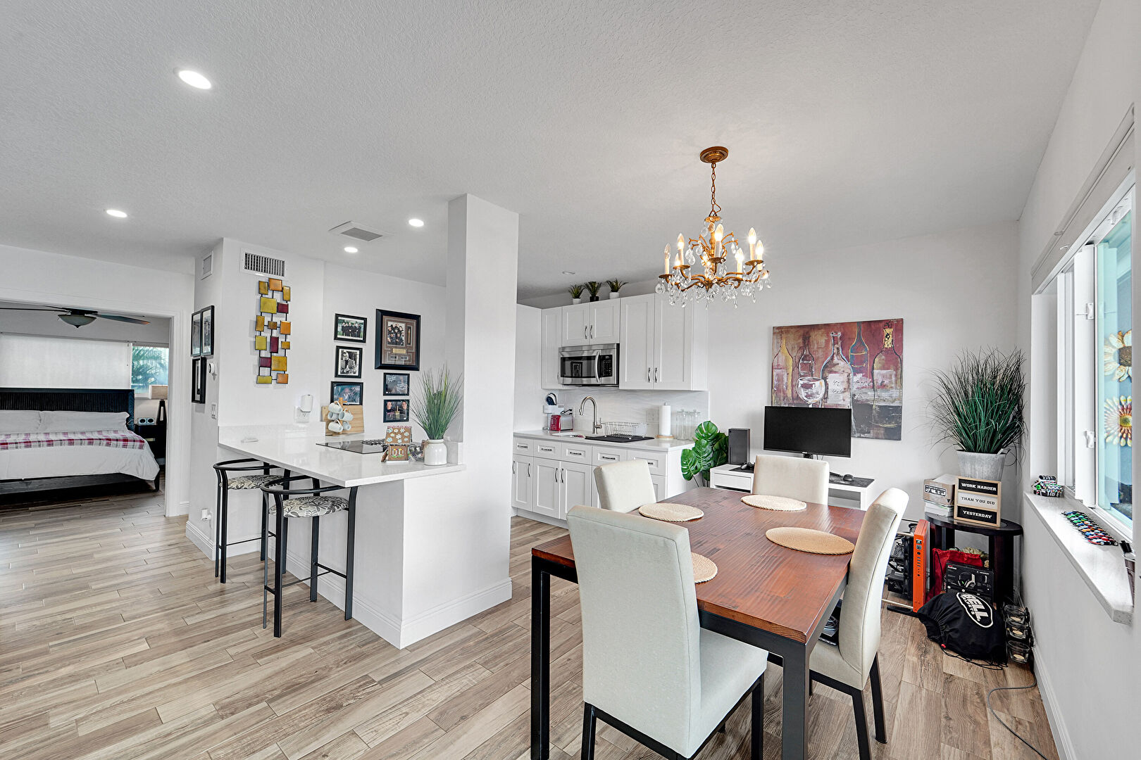 Baseboards Wall, Ceiling Fan, Drywall, Natural Light, Notable Chandelier, Recessed Lighting, Textured Ceiling, U Shaped Kitchen, Vent, Wood Finish Floor, Notable Chandelier, Recessed Lighting