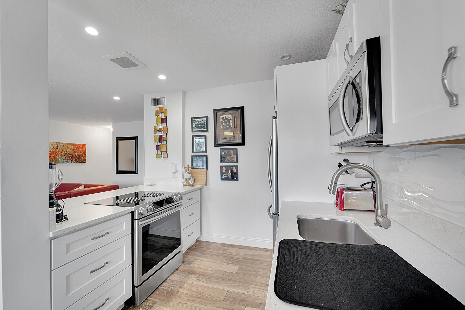 Baseboards Wall, Ceiling Fan, Drywall, Natural Light, Notable Chandelier, Recessed Lighting, Textured Ceiling, U Shaped Kitchen, Vent, Waterfront, Wood Finish Floor, Drywall, Natural Light, Textured Ceiling, Vent, Waterfront