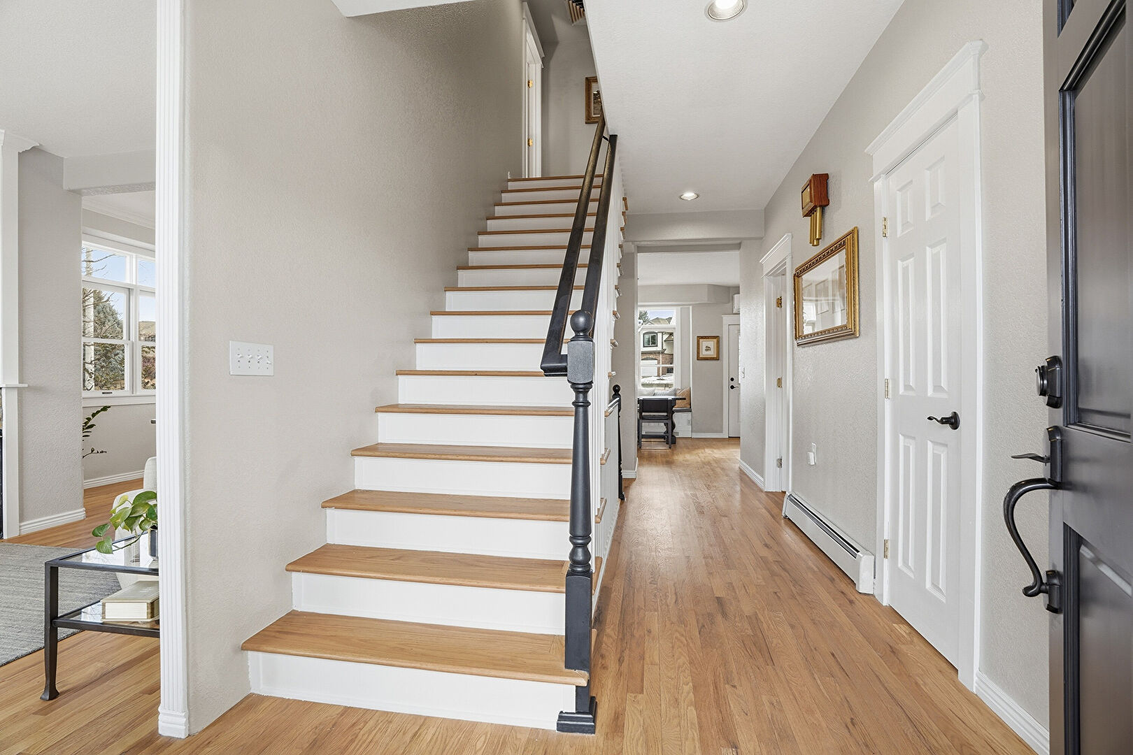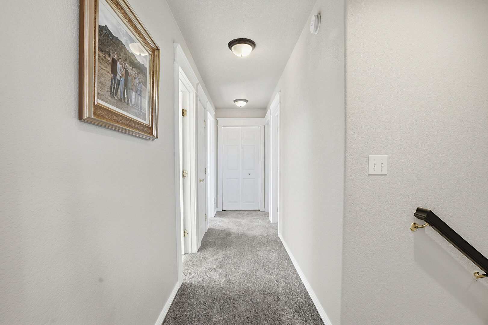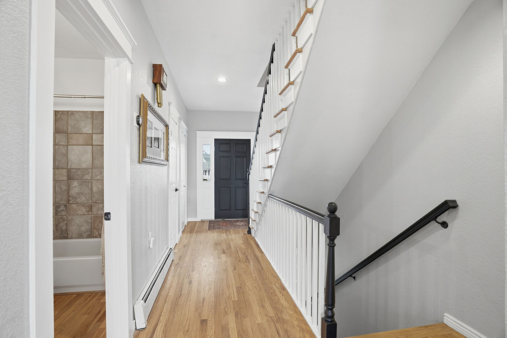 Baseboard Radiator, Baseboards Wall, Drywall, Natural Light, Recessed Lighting, Textured Wall, Wood Finish Floor, Stairs, Upstairs Landing