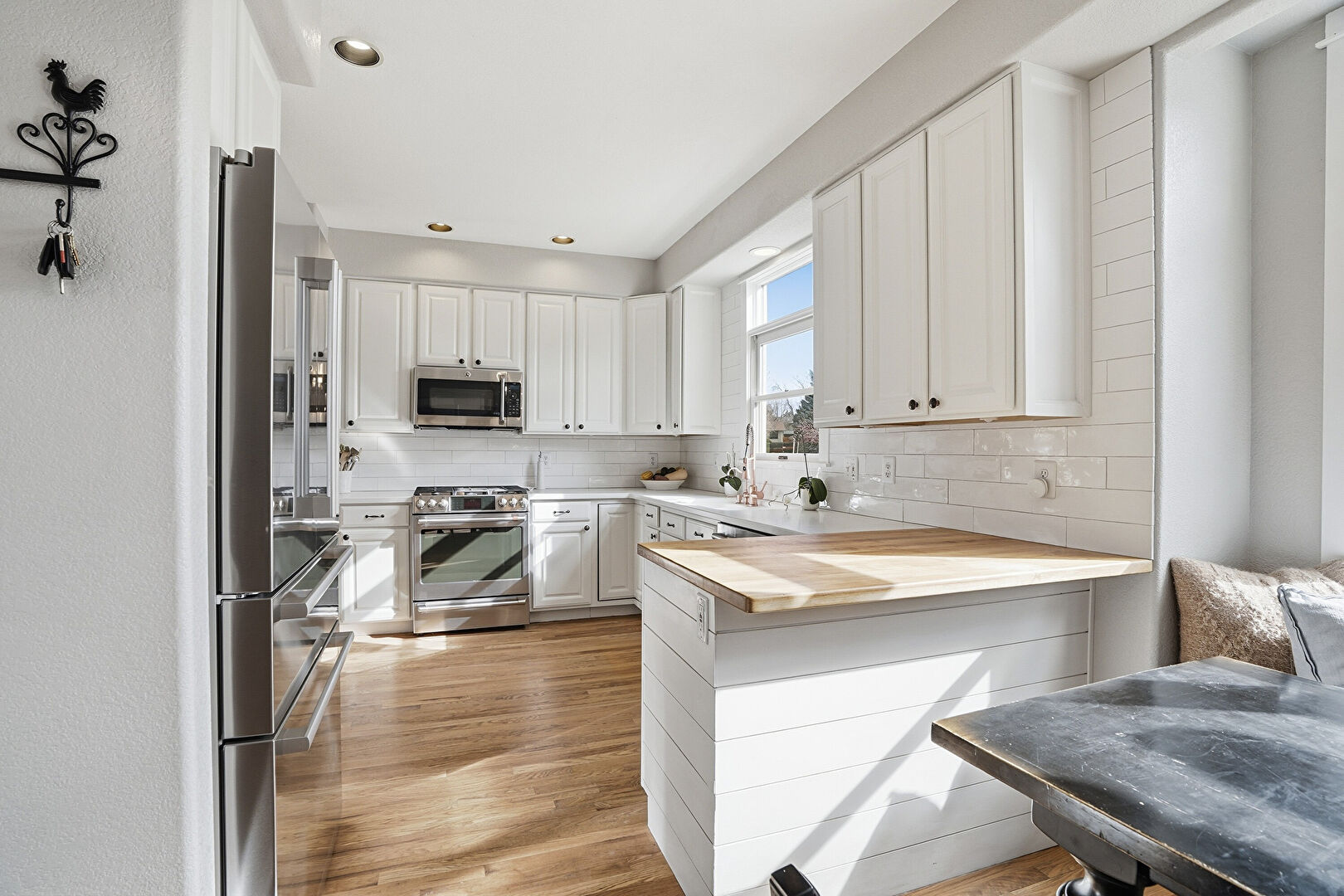 Baseboards Wall, Butcher Block Countertops, Crown Molding, Drywall, G Shaped Kitchen, Kitchen Peninsula, Natural Light, Open Shelves, Pendant Lighting, Raised Cabinets, Recessed Lighting, Stone Countertops, Vent, Wall Mounted Ac, Wood Finish Floor, Baseboards Wall, Natural Light, Opens To Living Area, Raised Cabinets, Recessed Lighting, Textured Wall