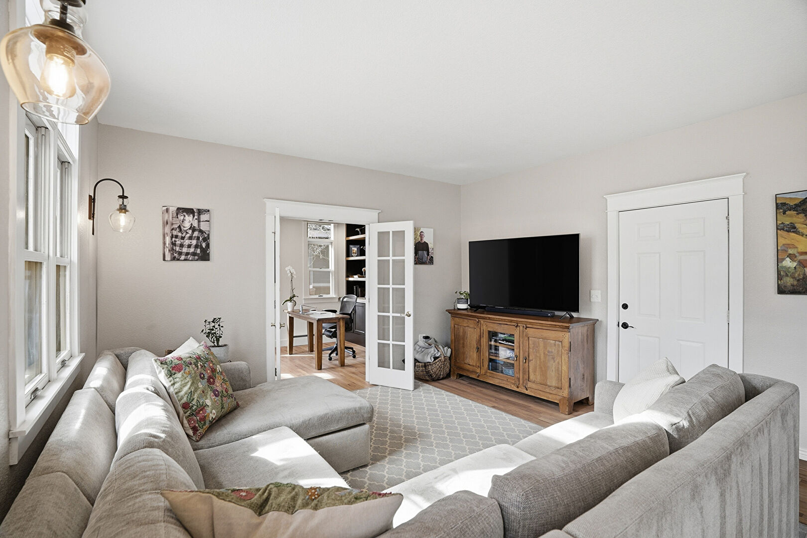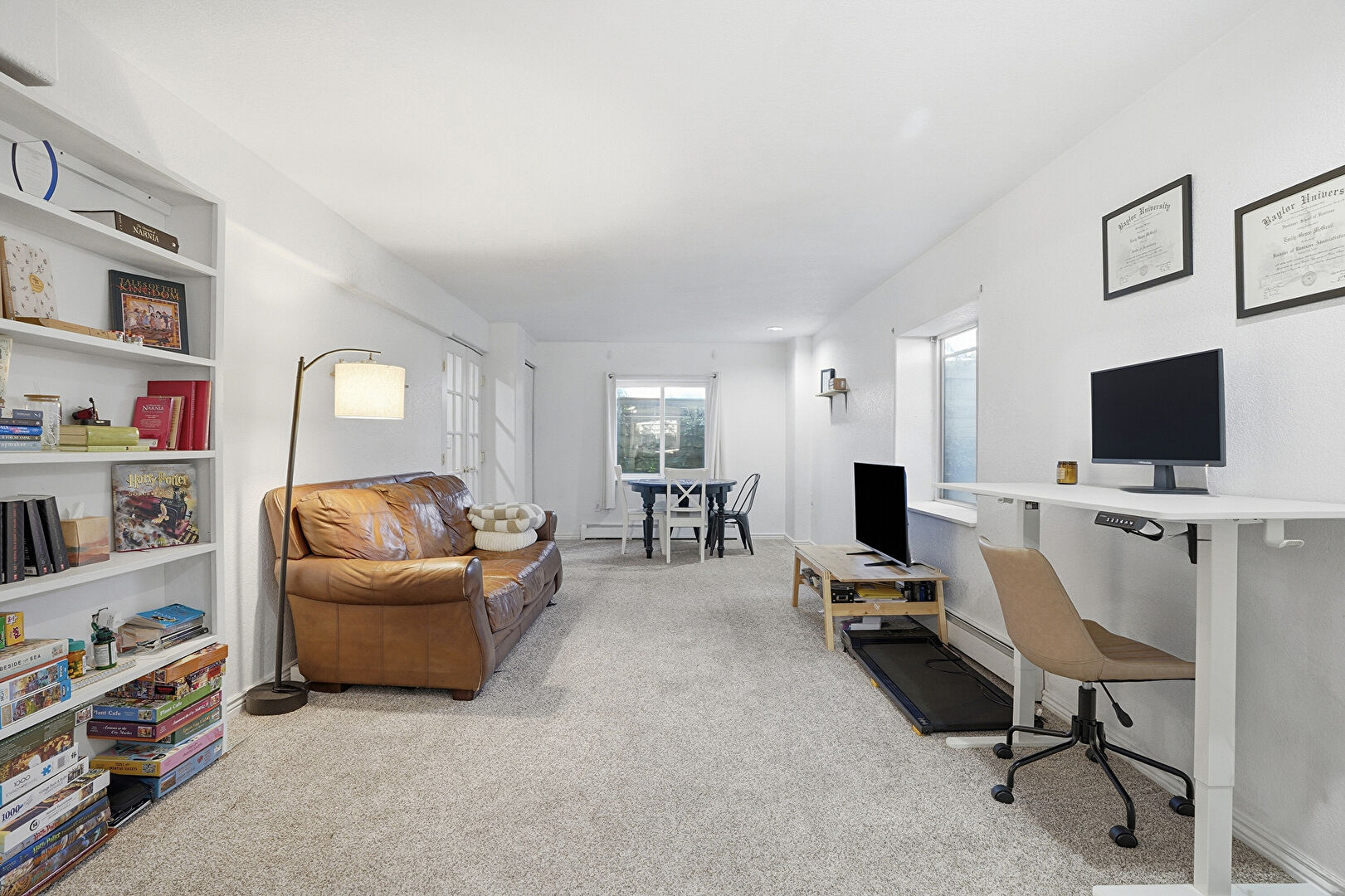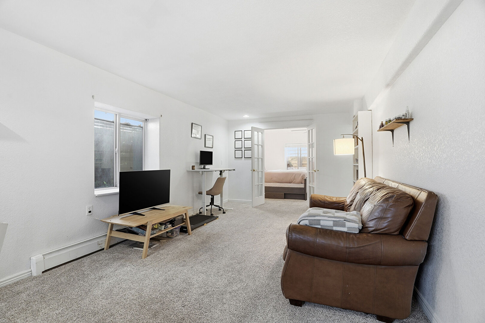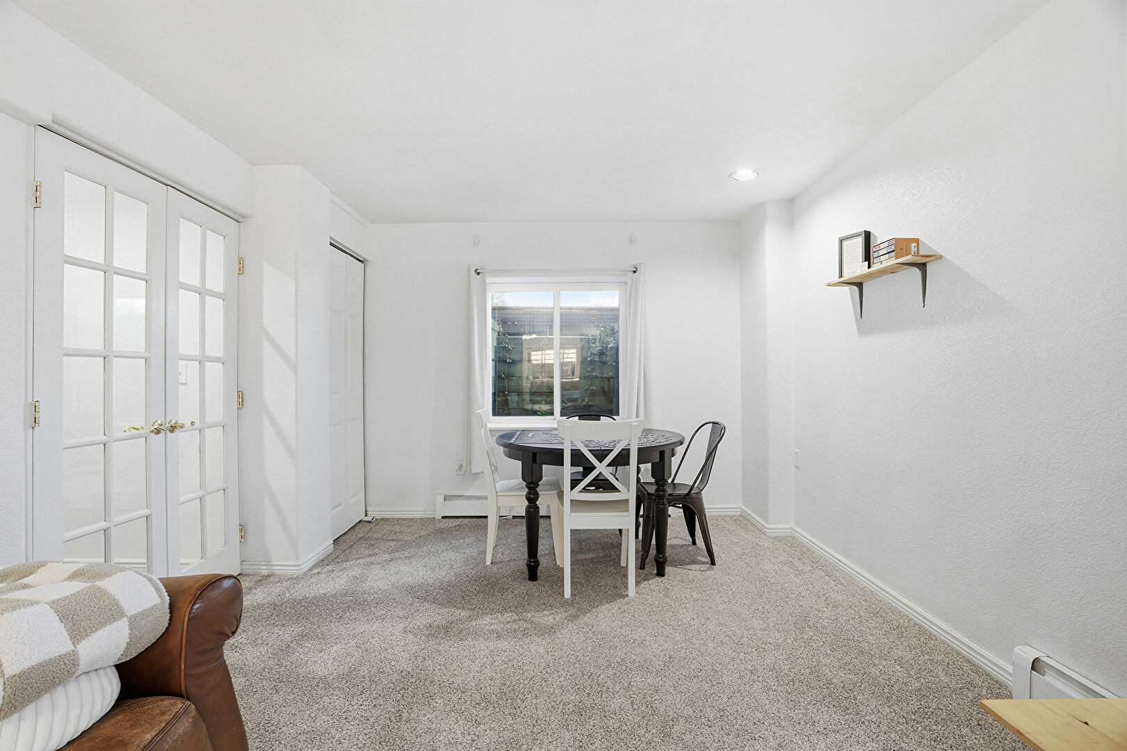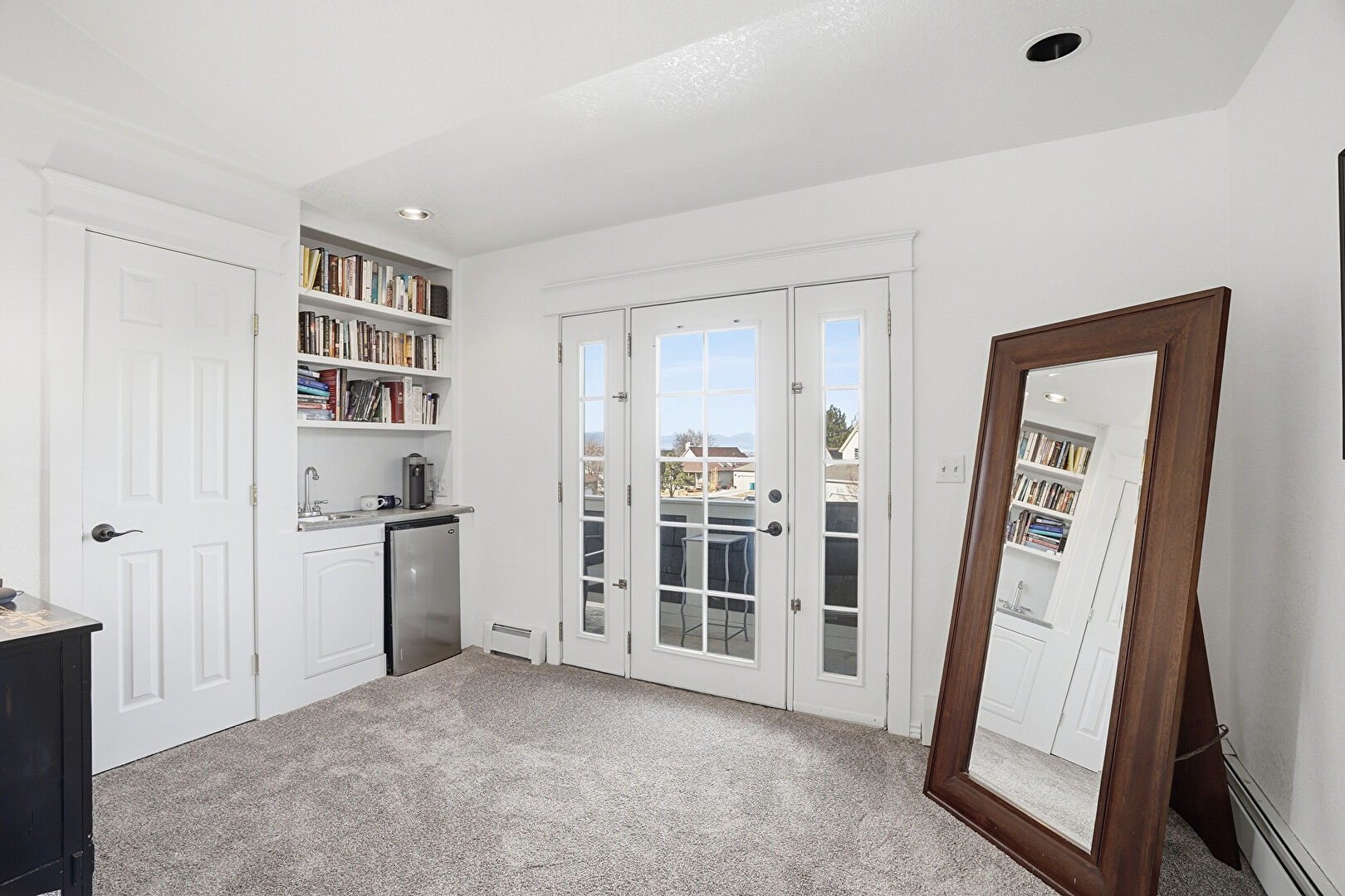 Baseboard Radiator, Baseboards Wall, Carpet, Ceiling Fan, Drywall, French Doors, Natural Light, Office Area, Recessed Lighting, Textured Wall, Baseboard Radiator, Baseboards Wall, French Doors