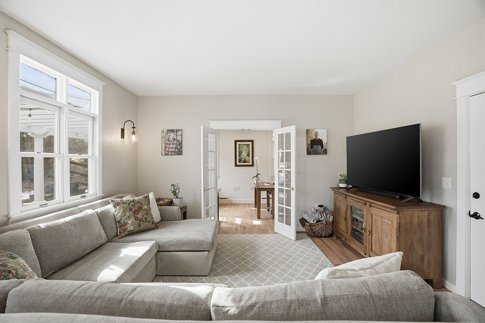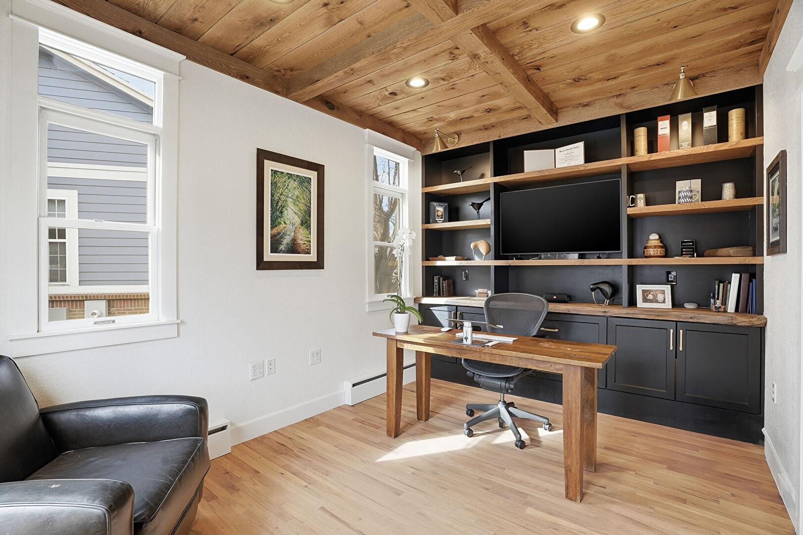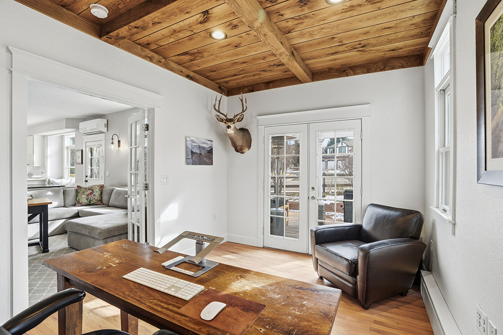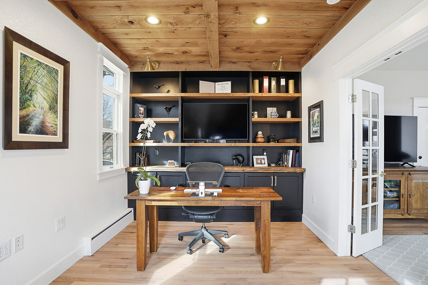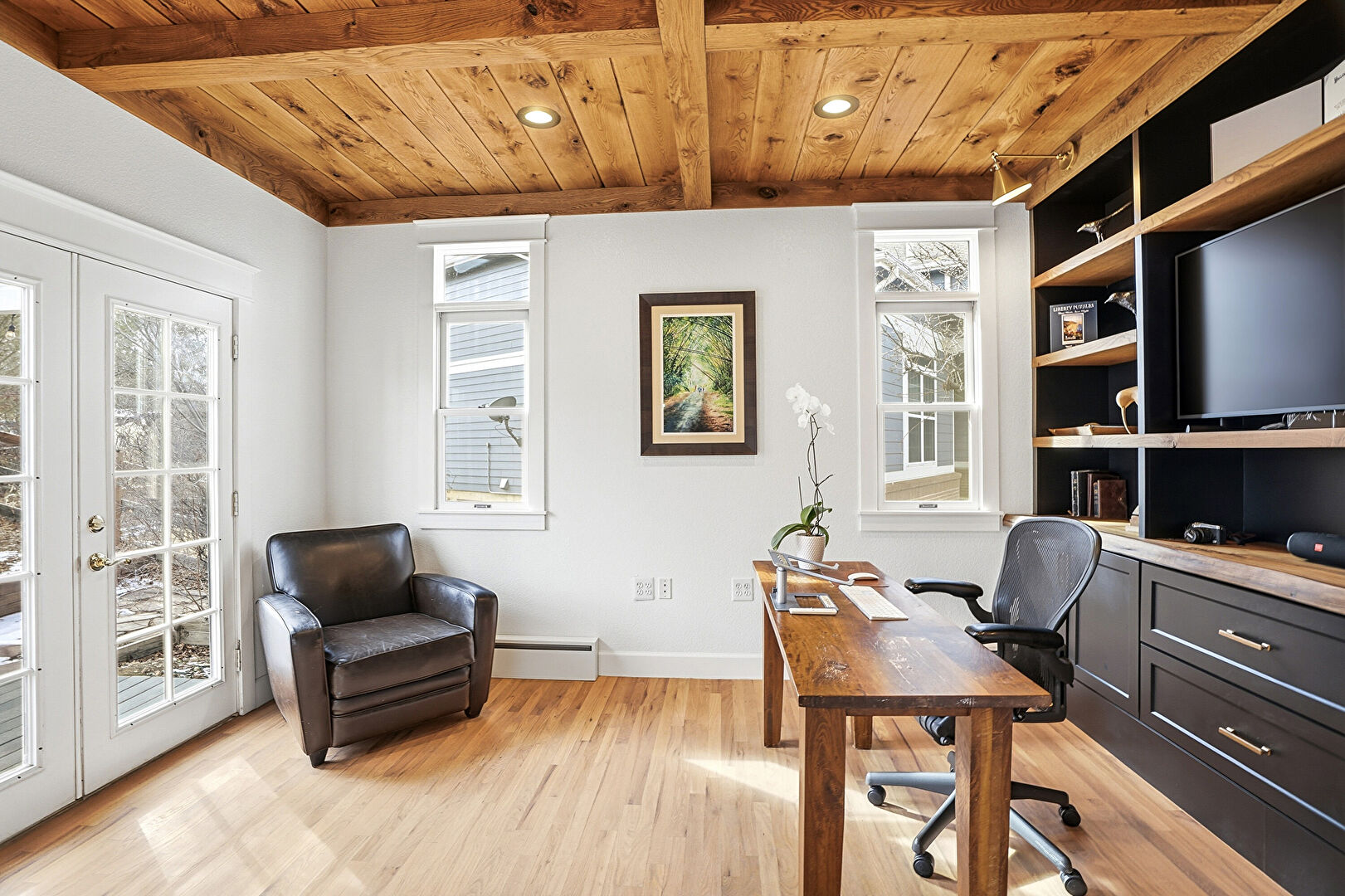 Baseboard Radiator, Baseboards Wall, Beamed Ceiling, Built In Shelves, Drywall, French Doors, Natural Light, Office Area, Recessed Lighting, Smoke Carbon Monoxide Detector, Wall Mounted Ac, Wood Ceiling, Wood Finish Floor, Baseboard Radiator, Beamed Ceiling, Drywall