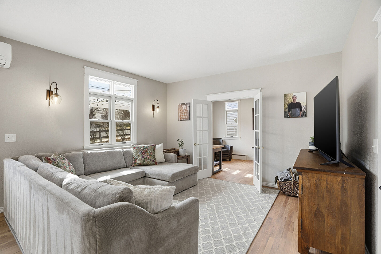 Baseboard Radiator, Baseboards Wall, Drywall, French Doors, Natural Light, Wall Mounted Ac, Wood Finish Floor, Drywall, Natural Light, Office Area