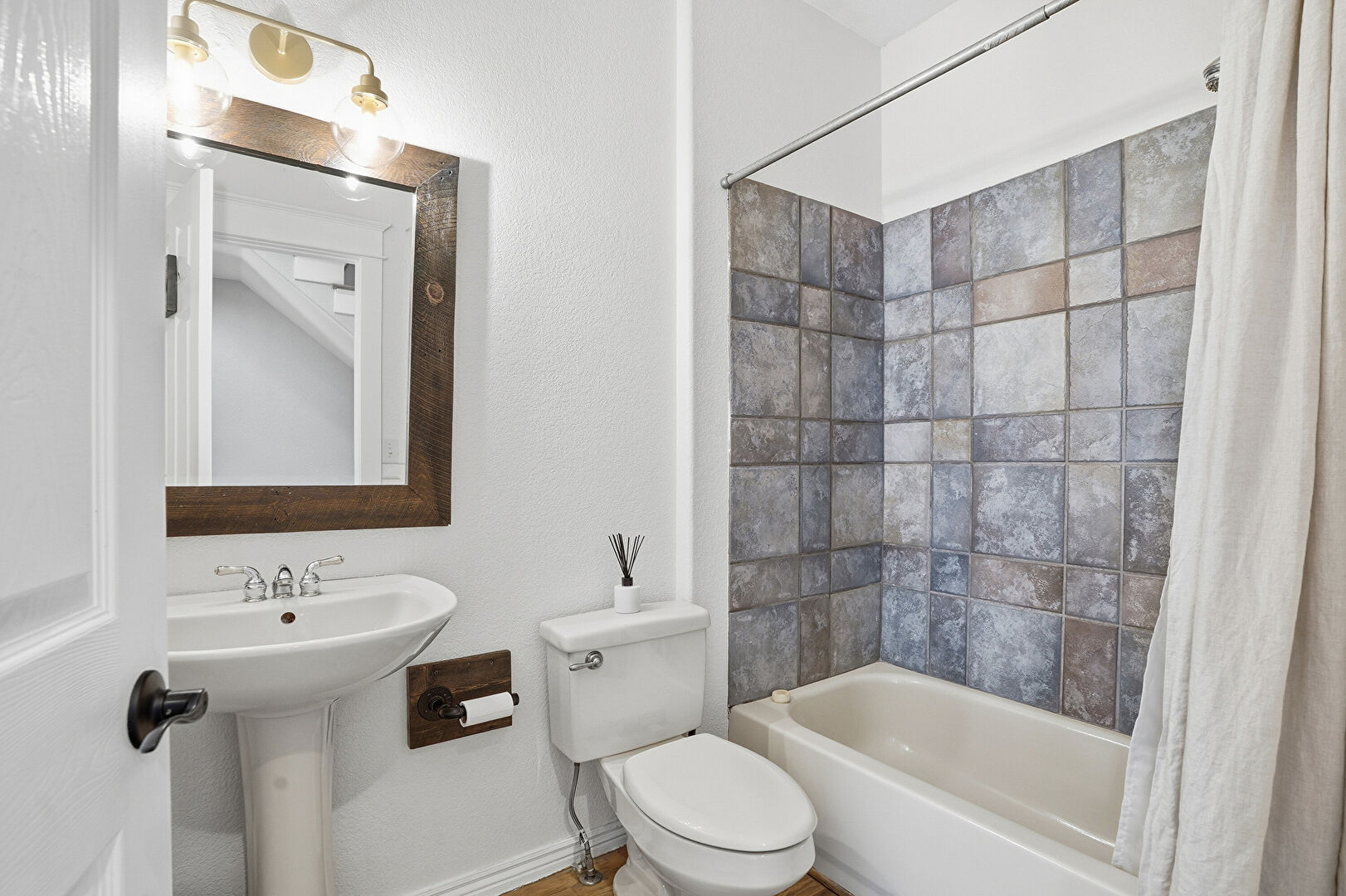 Baseboards Wall, Carpet, Drywall, Full Bathroom, Textured Wall, Vanity, Vent, Wood Finish Floor, Baseboard Radiator, Combined Bath Shower, Natural Light, Textured Wall
