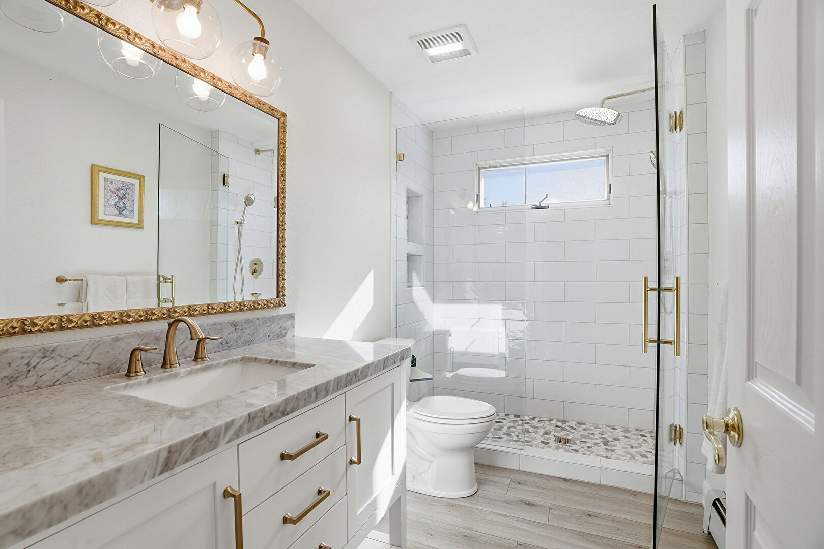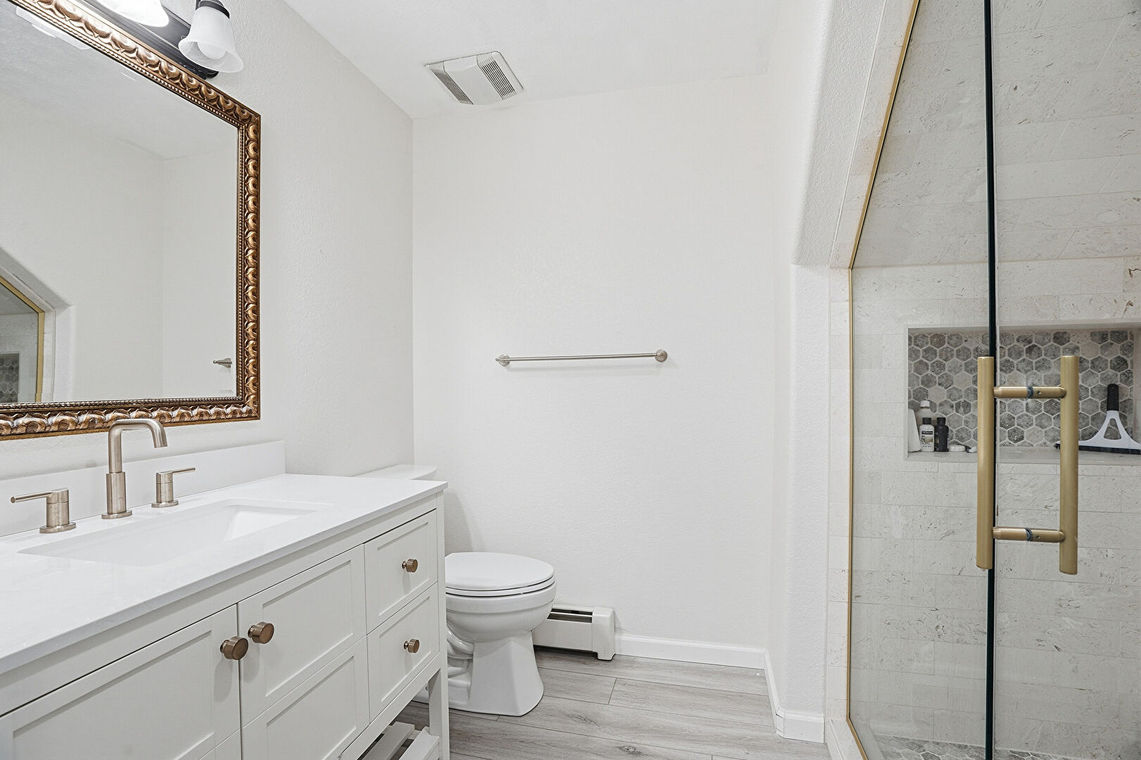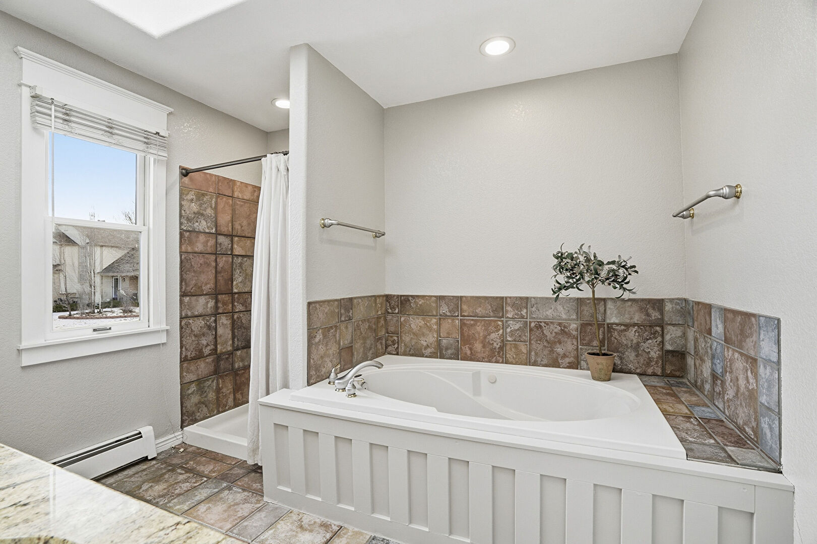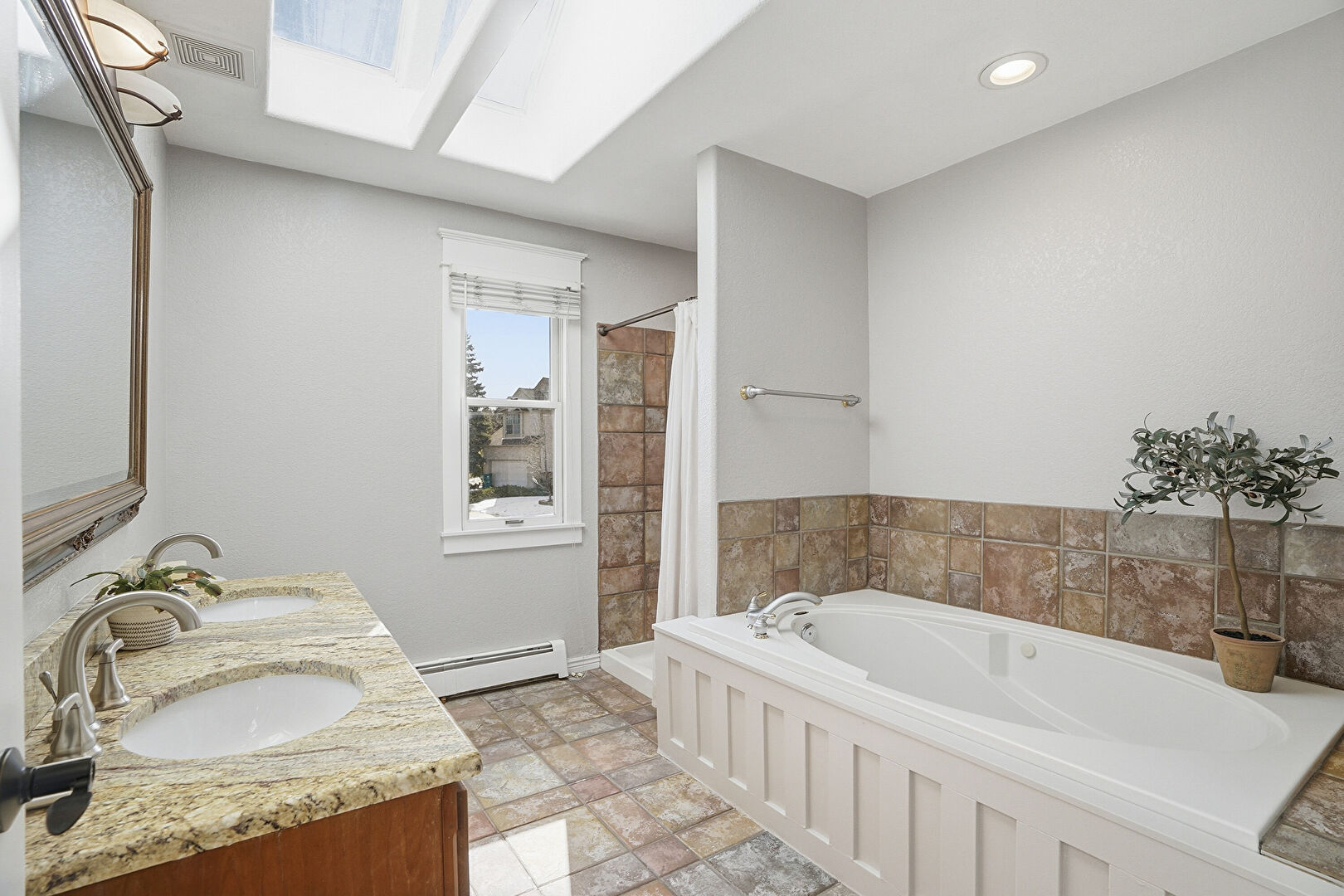 Baseboard Radiator, Baseboards Wall, Double Vanity, Drywall, Ensuite Bathroom, Full Bathroom, Natural Light, Recessed Lighting, Skylight, Stone Finish Floor, Vent, Baseboards Wall, Double Vanity, Full Bathroom