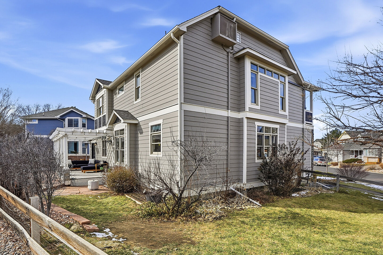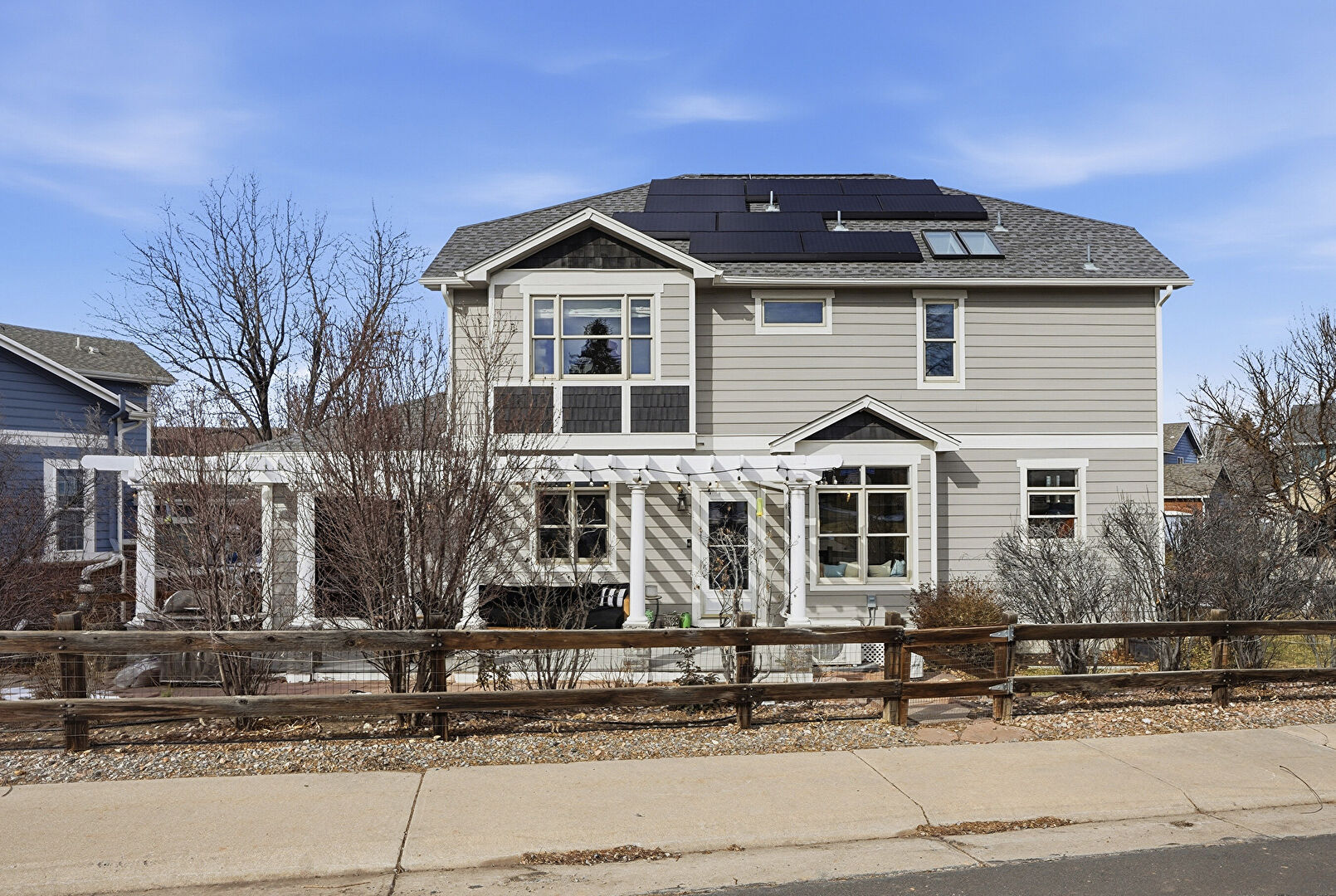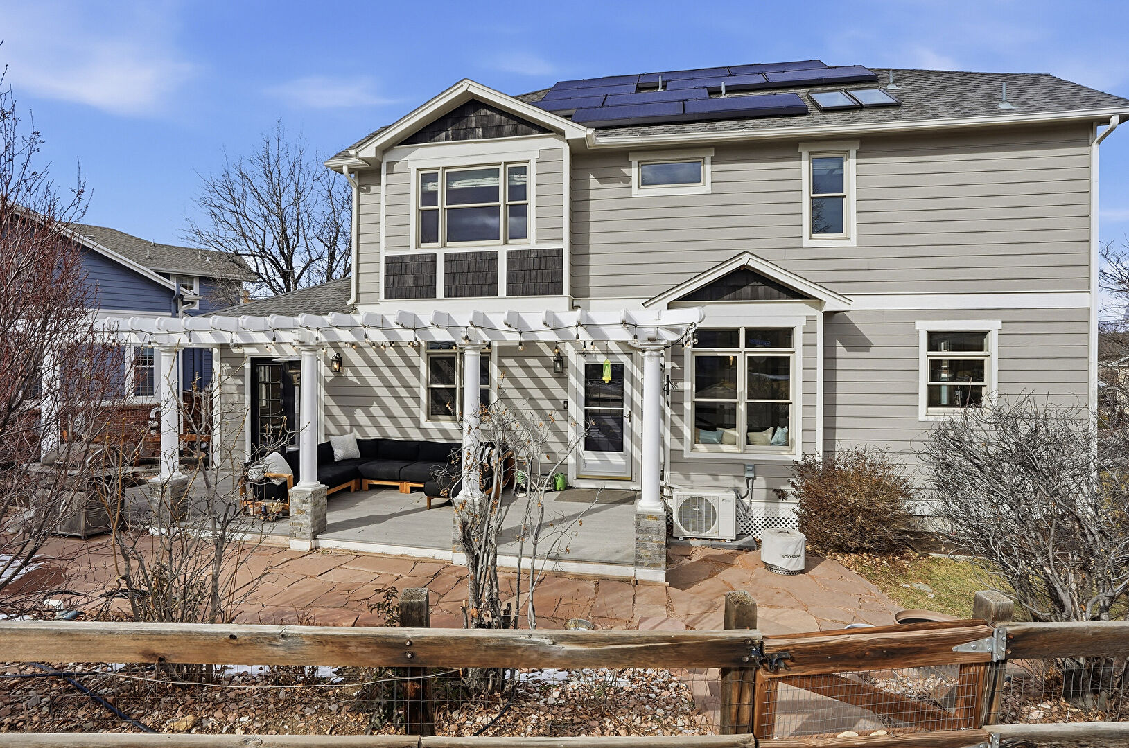 Concrete Foundation, Deck, Downspout, Fence, French Doors, Gate, Grill, Gutters, Horizontal Siding, Lawn, Outdoor Living Space, Patio, Pergola, Shake Shingle Siding, Shingle Roof, Solar Panels, Downspout, Shingle Roof, Split Ac Unit