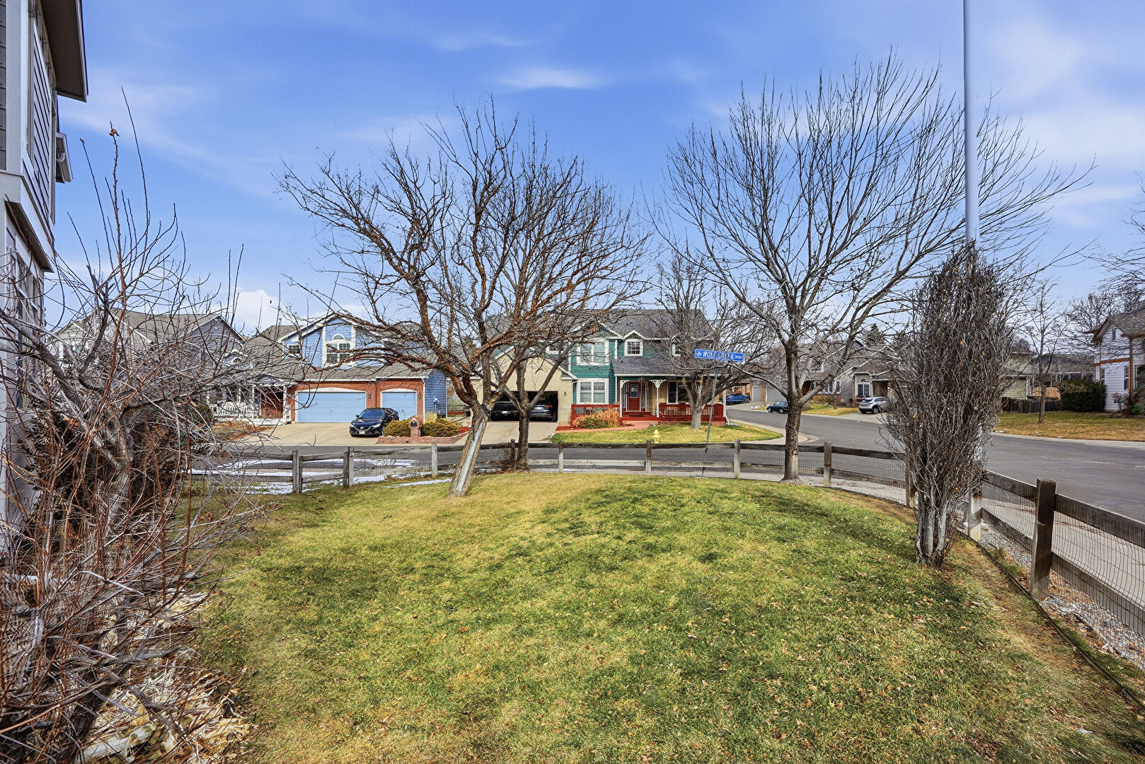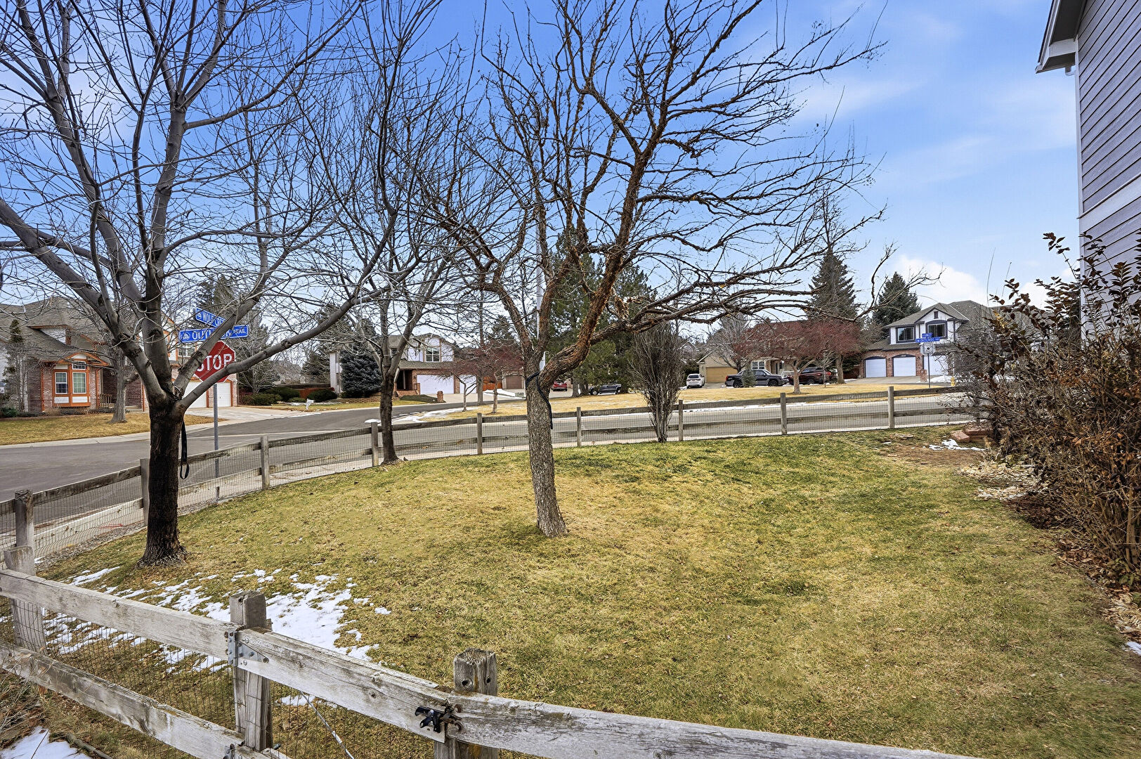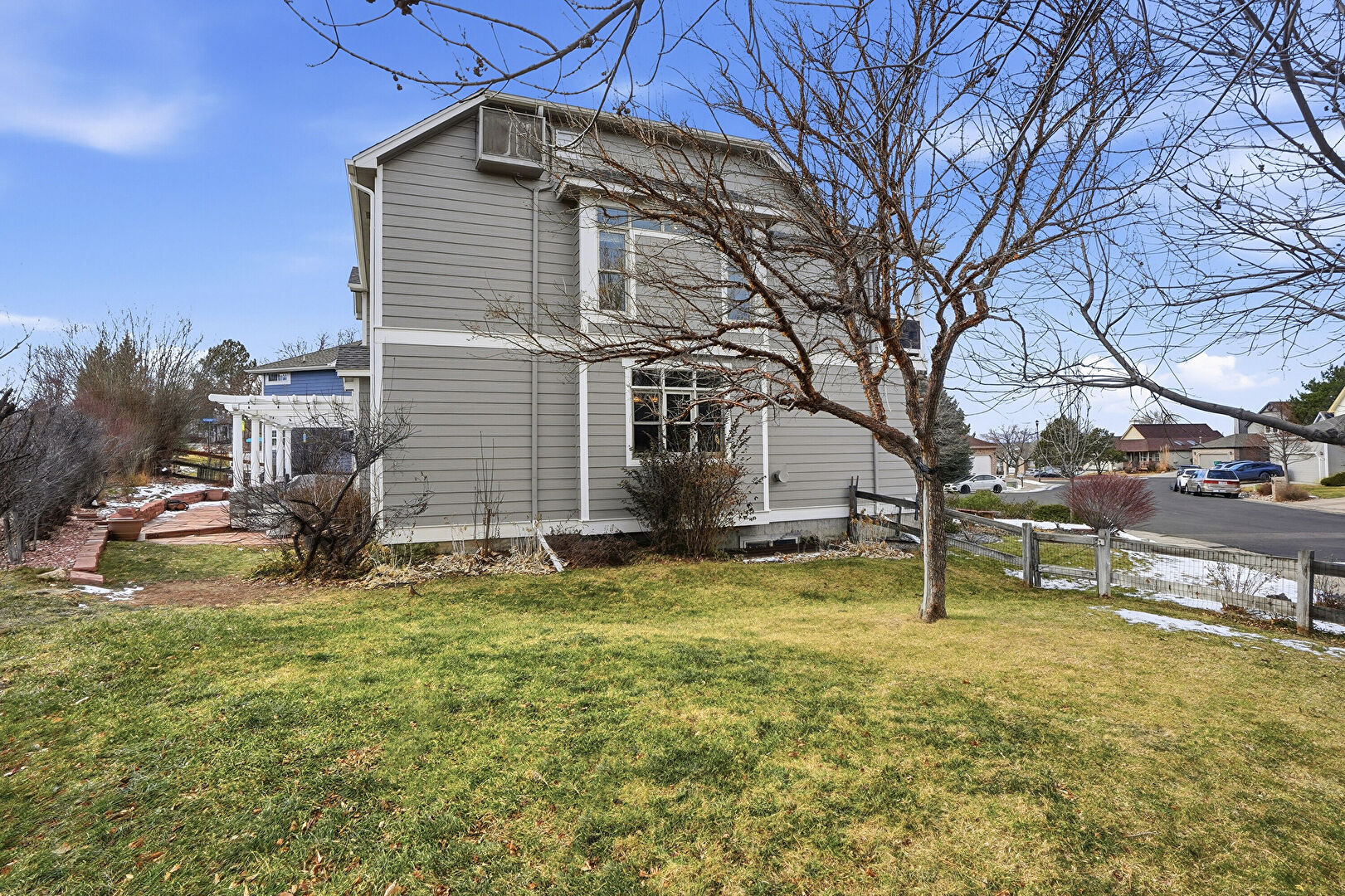 Concrete Foundation, Downspout, Fence, Gutters, Horizontal Siding, Lawn, Deck