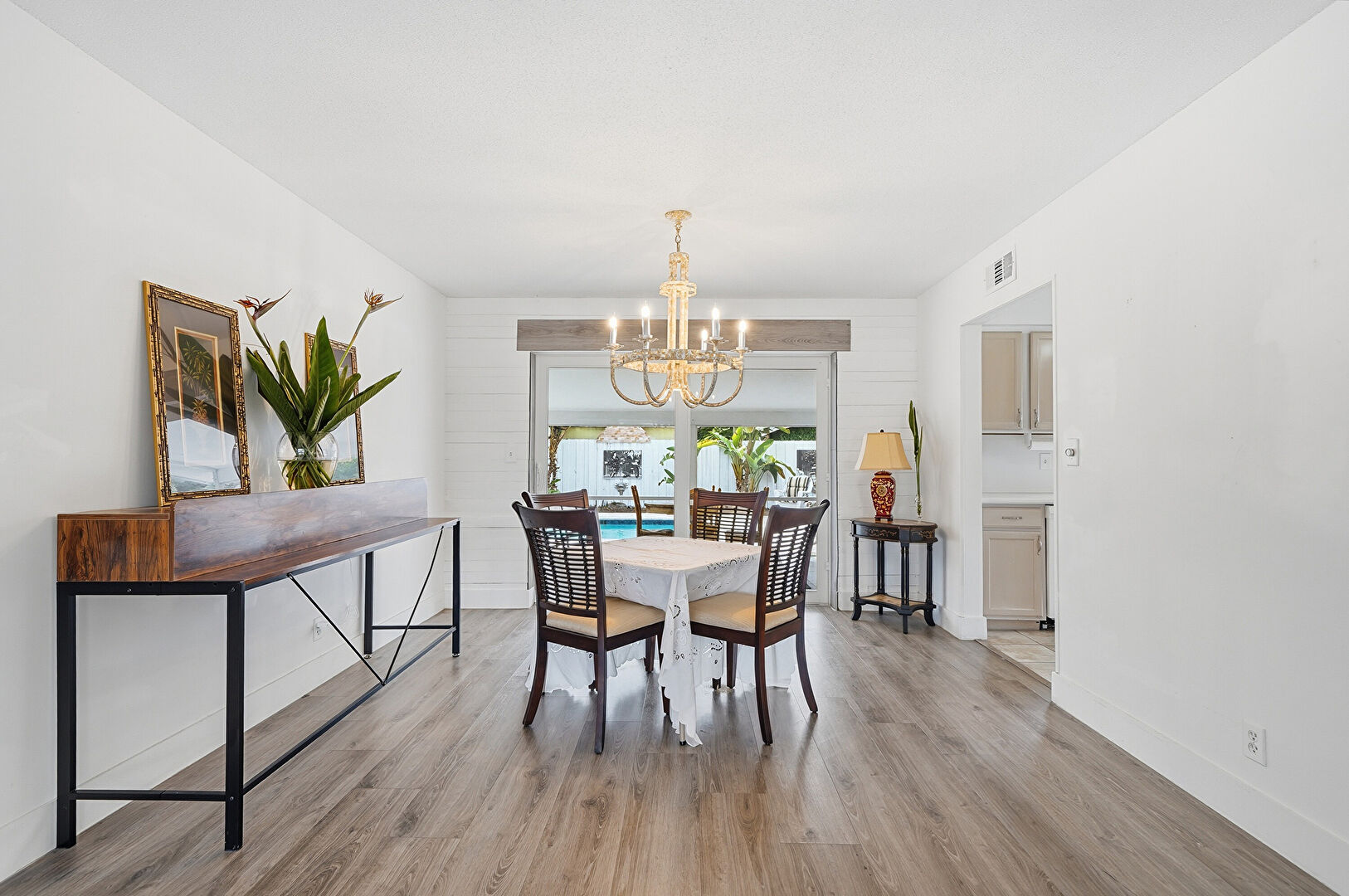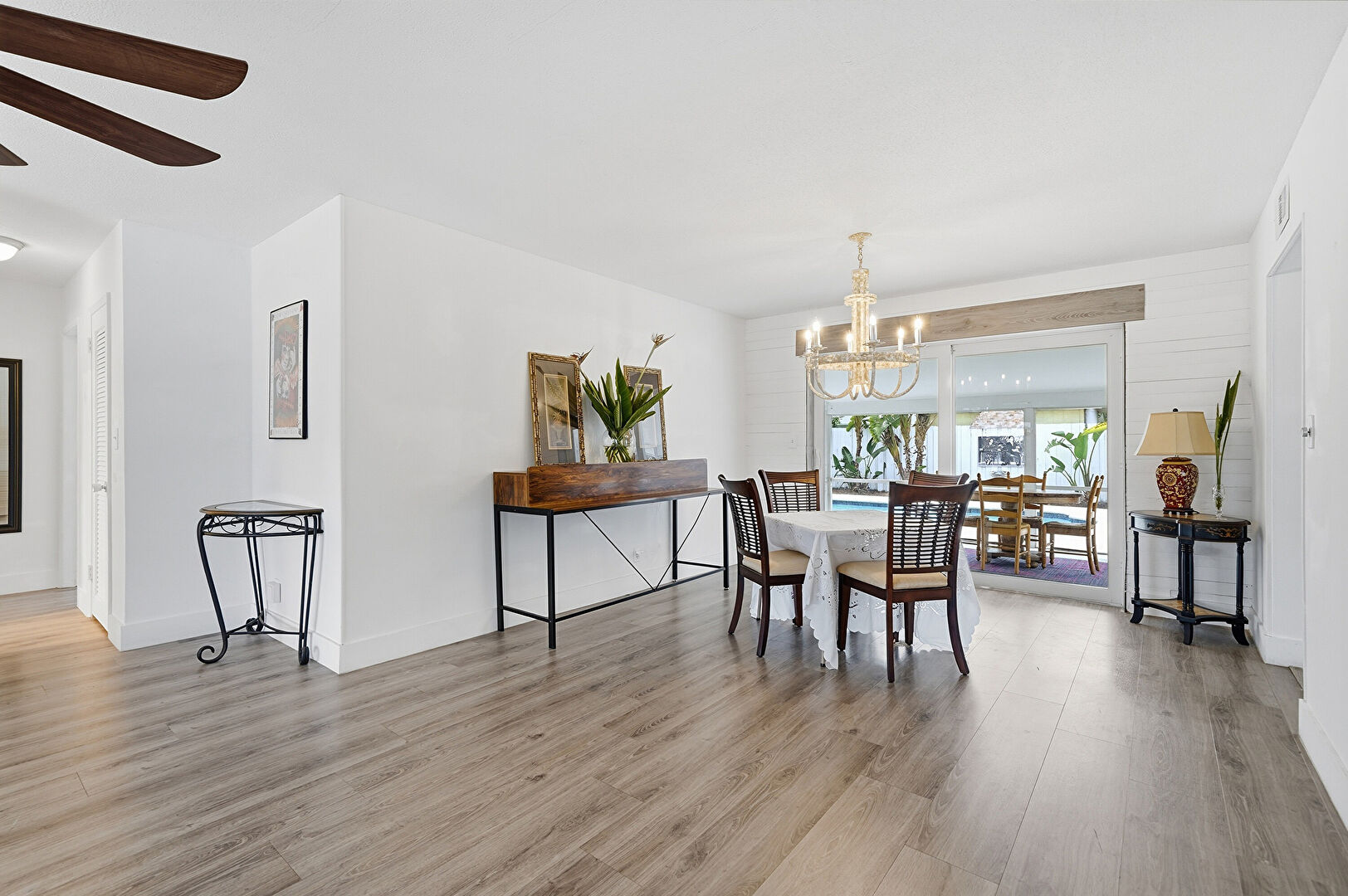Access To Exterior, Baseboards Wall, Ceiling Fan, Drywall, Ensuite Bathroom, Natural Light, Pool View, Vent, Walk In Closet, Wood Finish Floor, Natural Light, Pool View