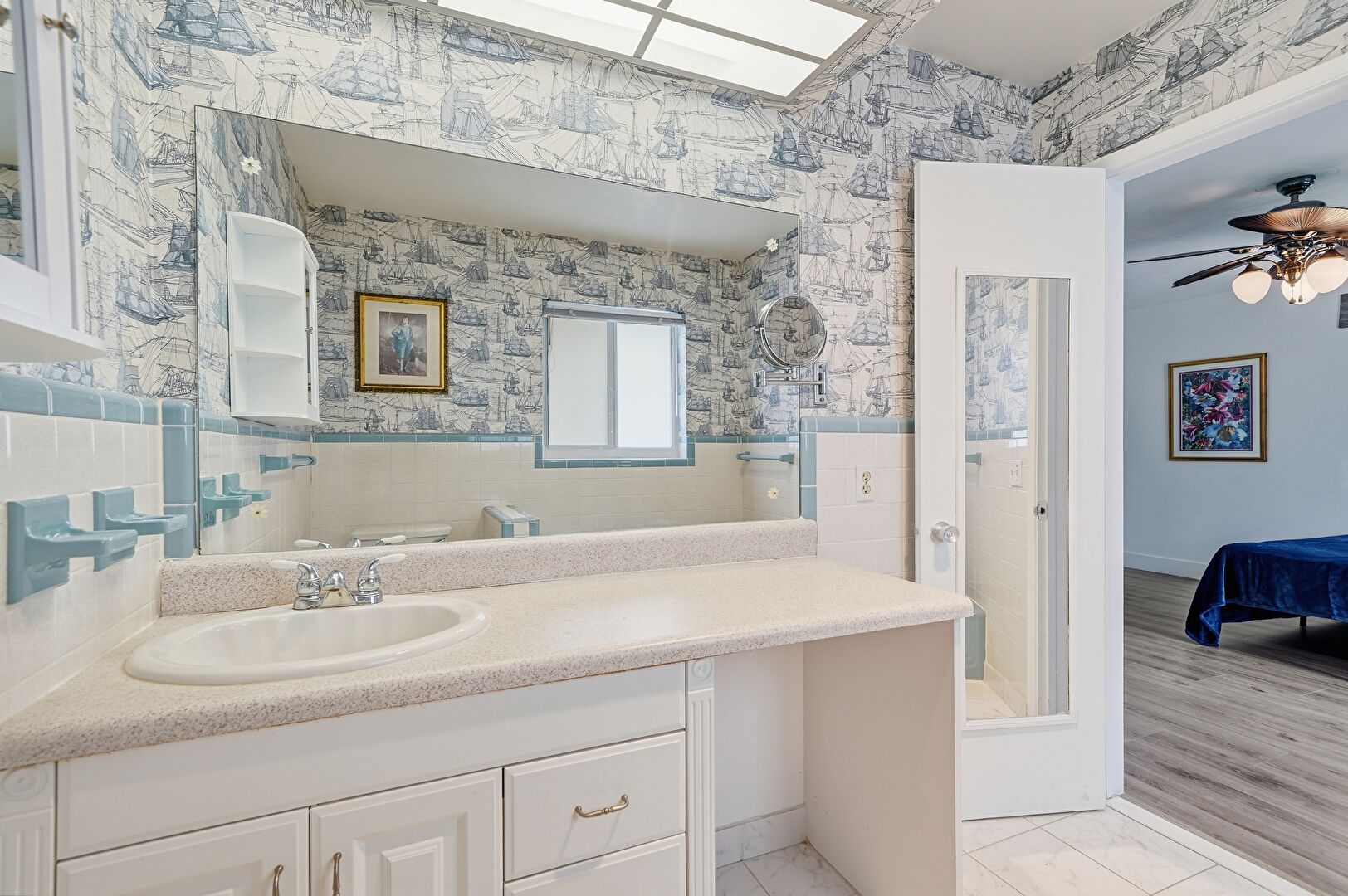 Baseboards Wall, Ceiling Fan, Ensuite Bathroom, Full Bathroom, Marble Finish Floor, Natural Light, Tile Wall, Vanity, Wainscot Wall, Wallpaper Wall, Natural Light, Tile Floor