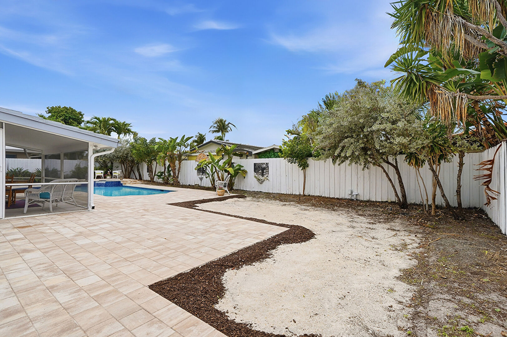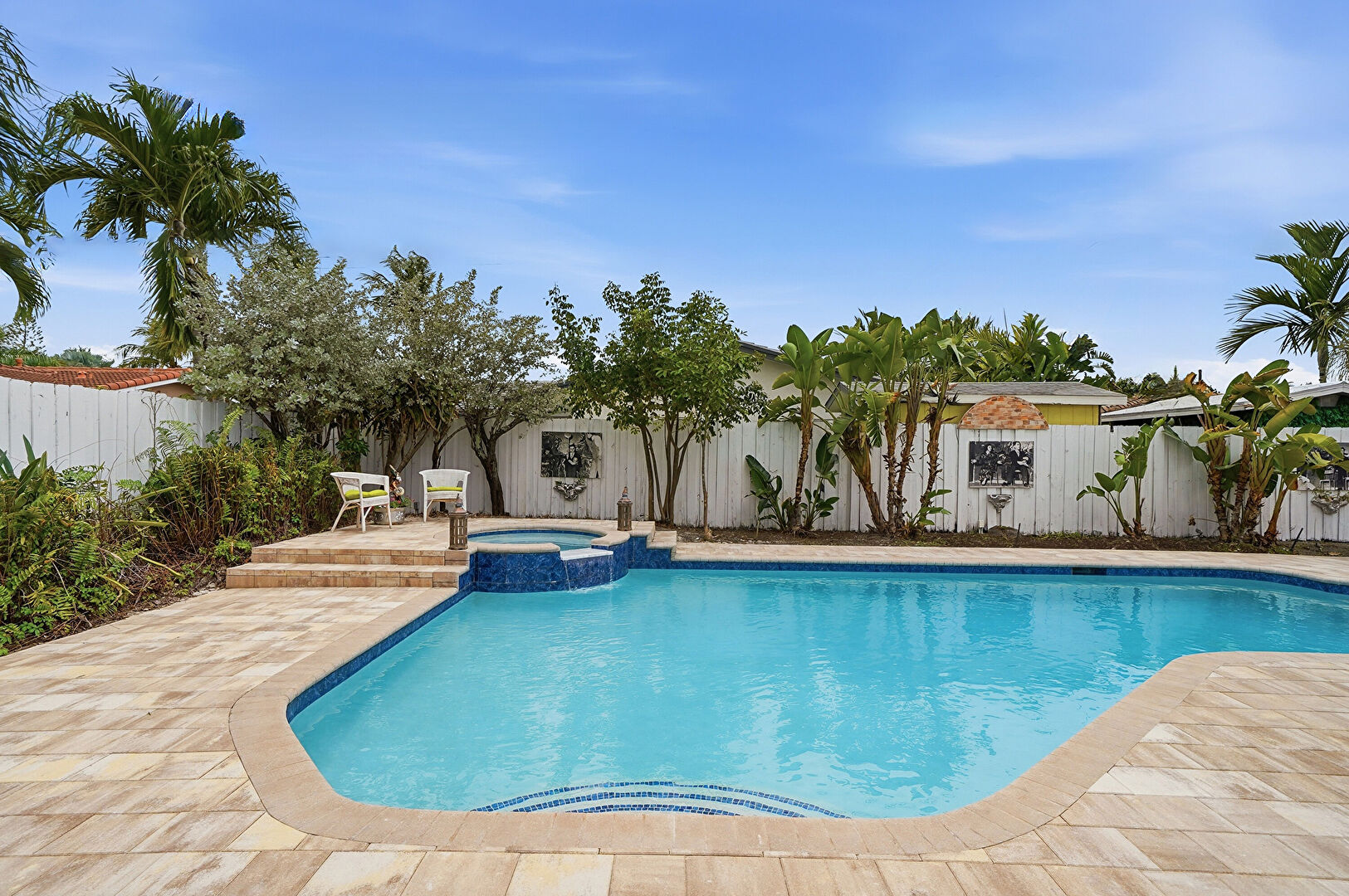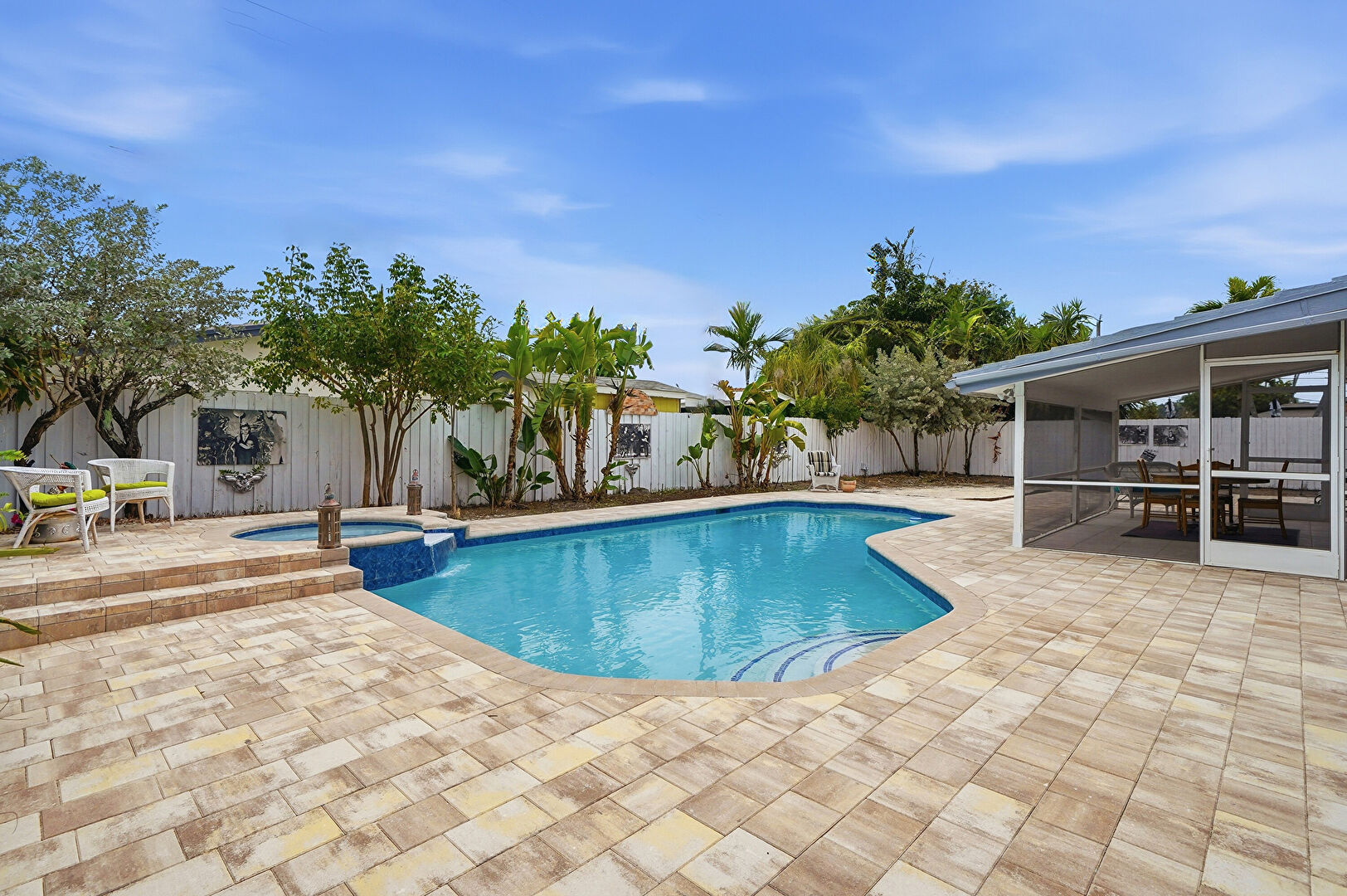 Fence, Outdoor Dining Area, Patio, Pool, Pool Hot Tub Combo, Sunroom, Fence, Grill, Hot Tub, Natural Light, Patio