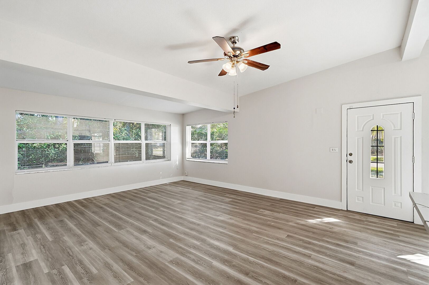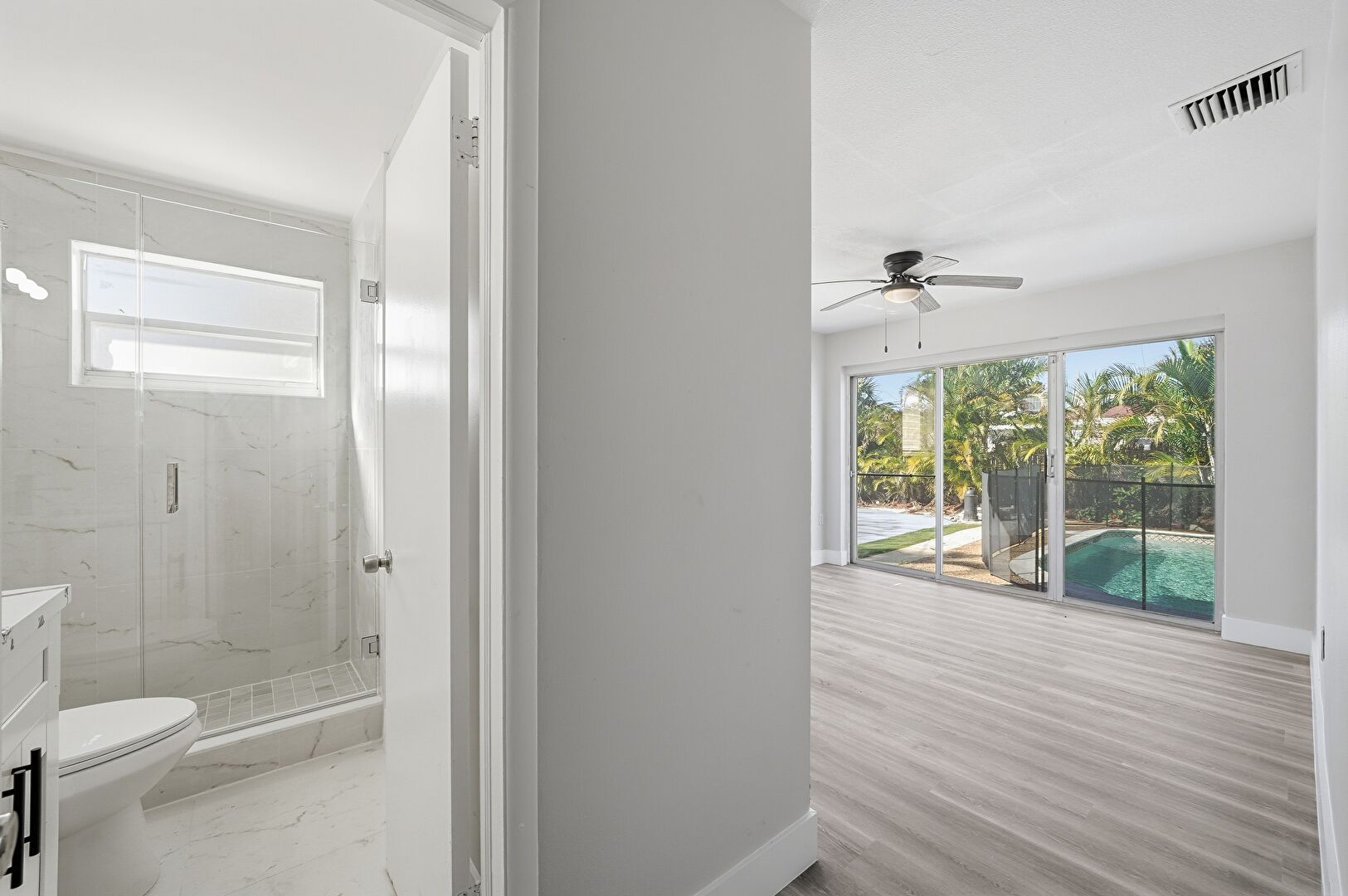Baseboards Wall, Ceiling Fan, Closet, Drywall, Full Bathroom, Natural Light, Sunroom, Vanity, Vent, Wall Mounted Ac, Wood Finish Floor, Baseboards Wall, Ceiling Fan, Natural Light