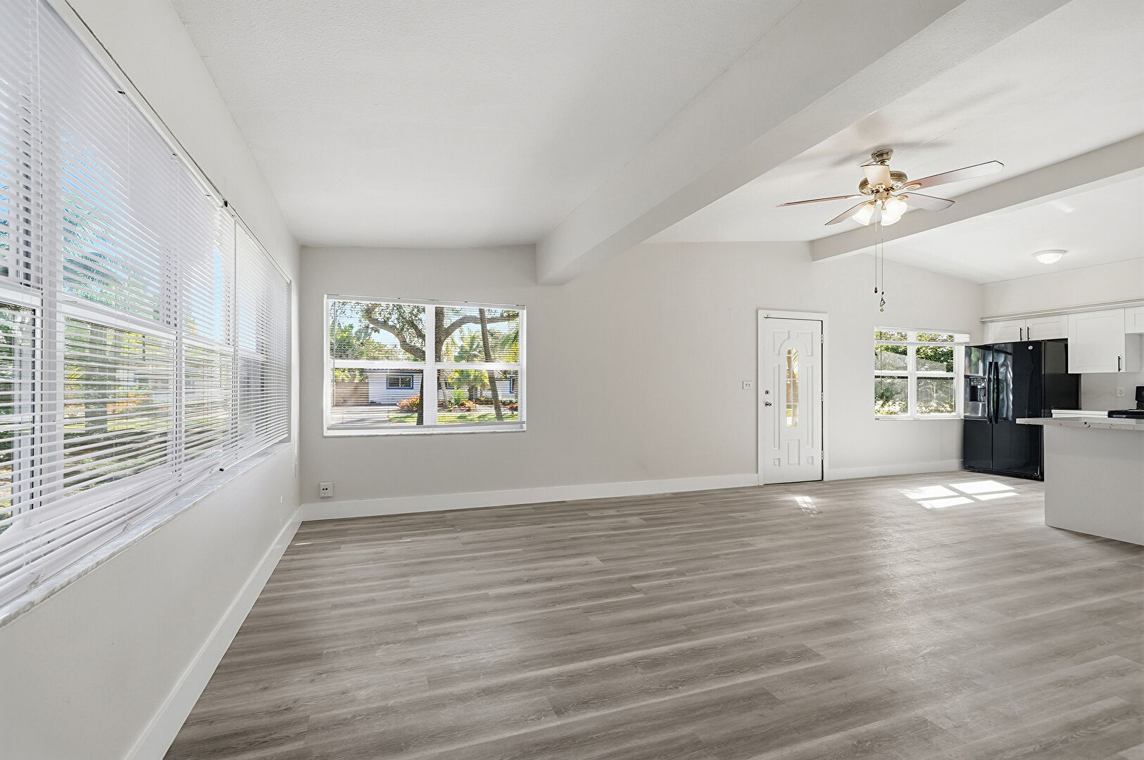 Baseboards Wall, Beamed Ceiling, Ceiling Fan, Drywall, Natural Light, Vaulted Ceiling, Vent, Wood Finish Floor, Beamed Ceiling, Ceiling Fan, Natural Light
