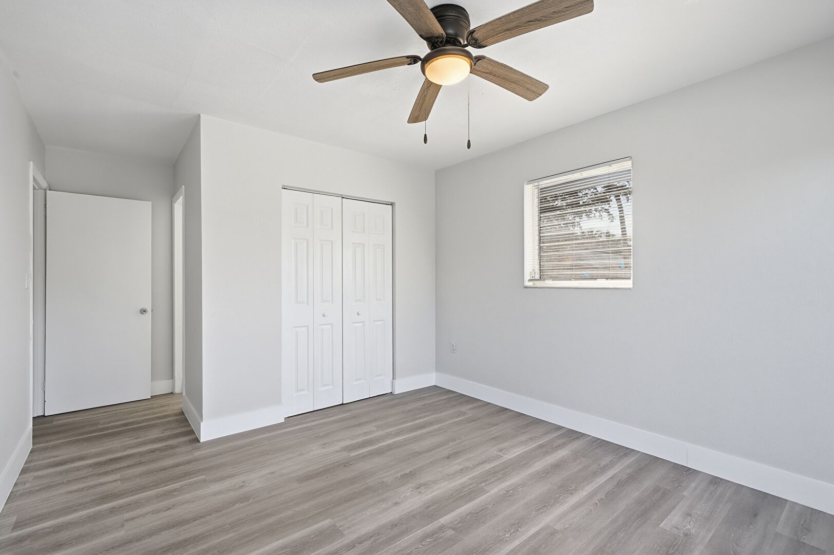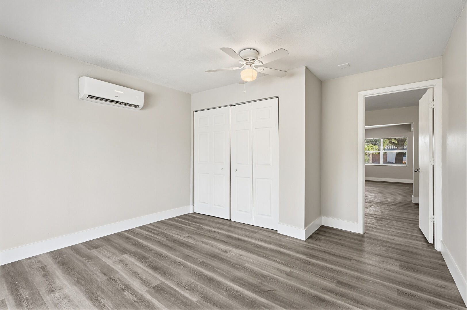 Baseboards Wall, Ceiling Fan, Closet, Drywall, Natural Light, Wall Mounted Ac, Wood Finish Floor, Drywall, Wall Mounted Ac