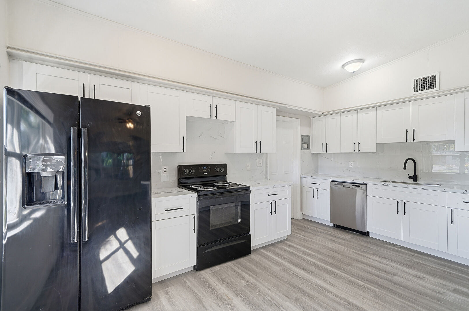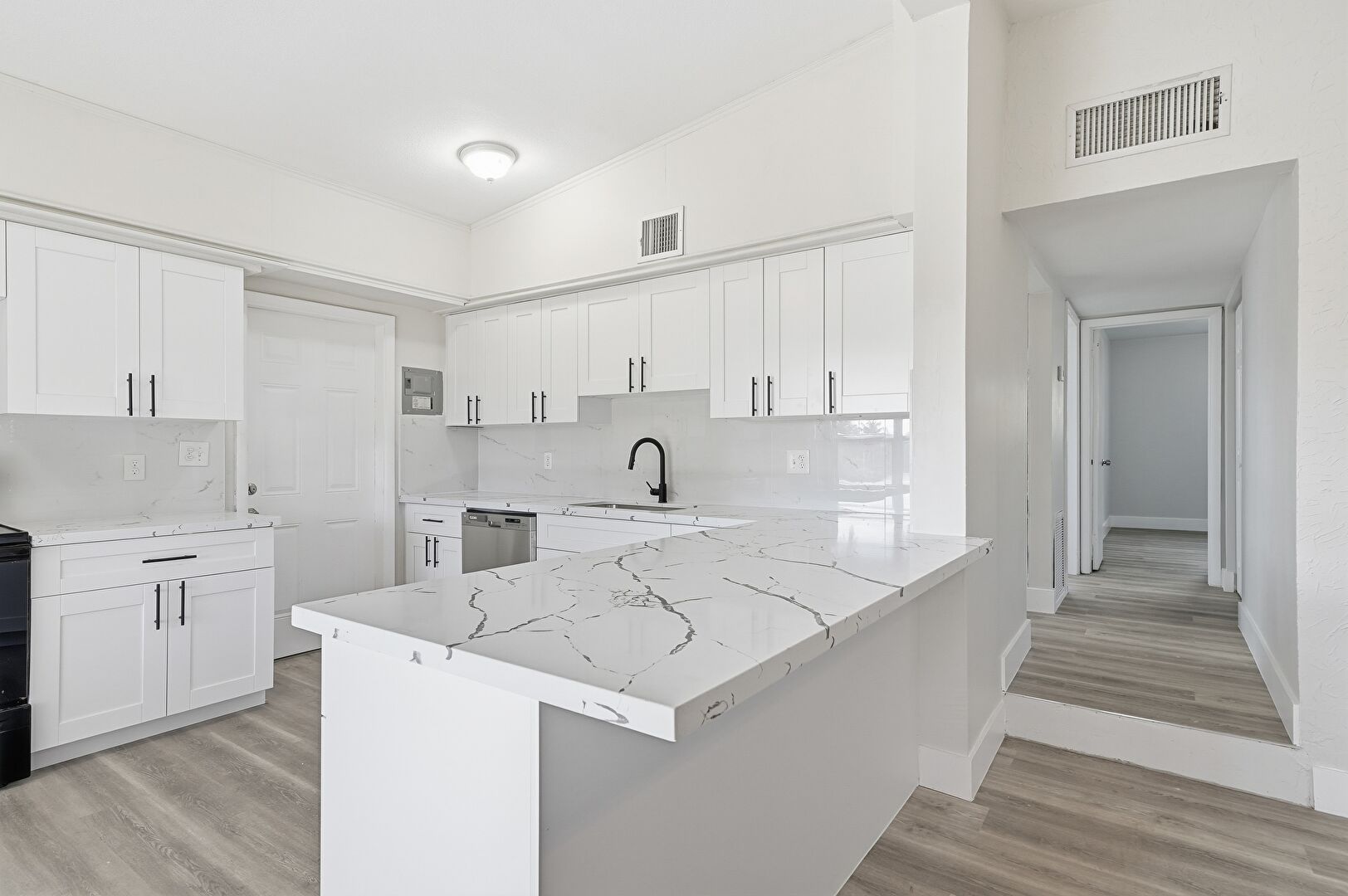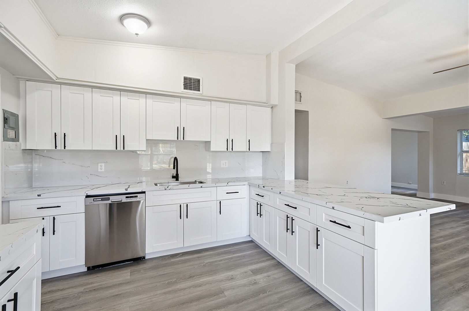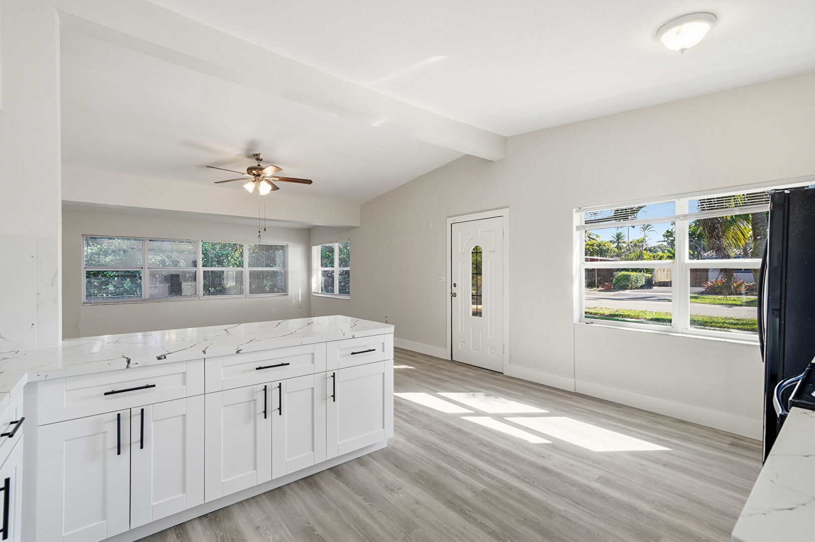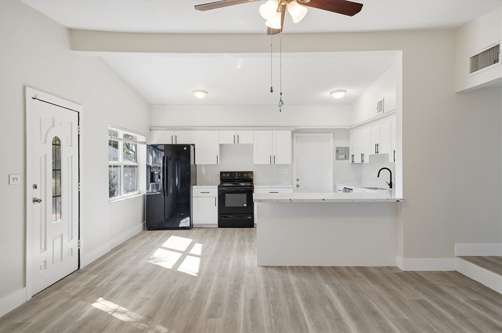 Baseboards Wall, Beamed Ceiling, Cathedral Ceiling, Ceiling Fan, Drywall, High Ceiling, Kitchen Peninsula, Natural Light, Opens To Living Area, Shaker Cabinets, Stone Countertops, U Shaped Kitchen, Vaulted Ceiling, Vent, Wood Finish Floor, Ceiling Fan, Drywall, Kitchen Bar, Natural Light, Stone Countertops, Vent