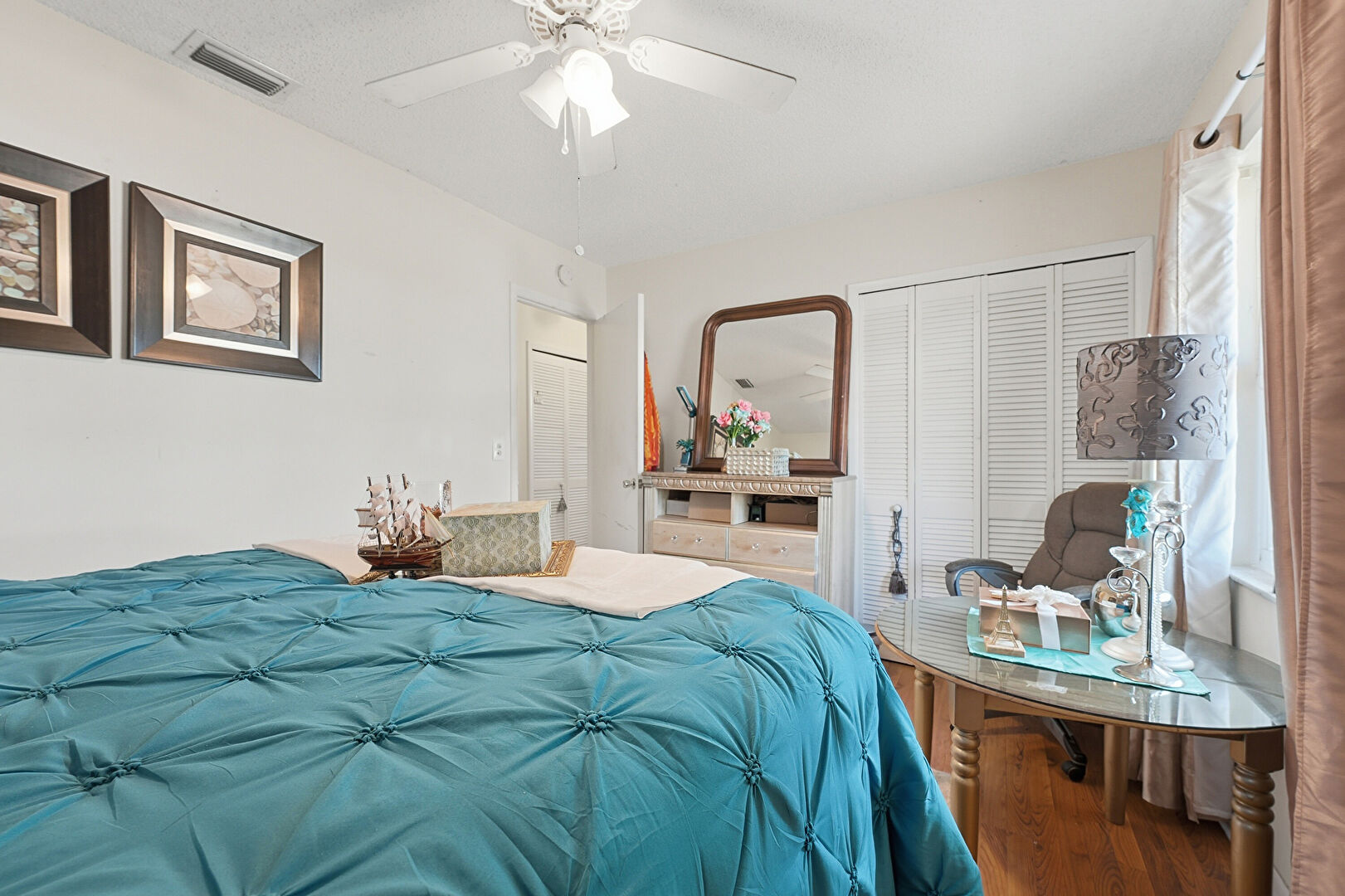 Baseboards Wall, Ceiling Fan, Closet, Drywall, Natural Light, Textured Ceiling, Vent, Wood Finish Floor, Ceiling Fan, Natural Light