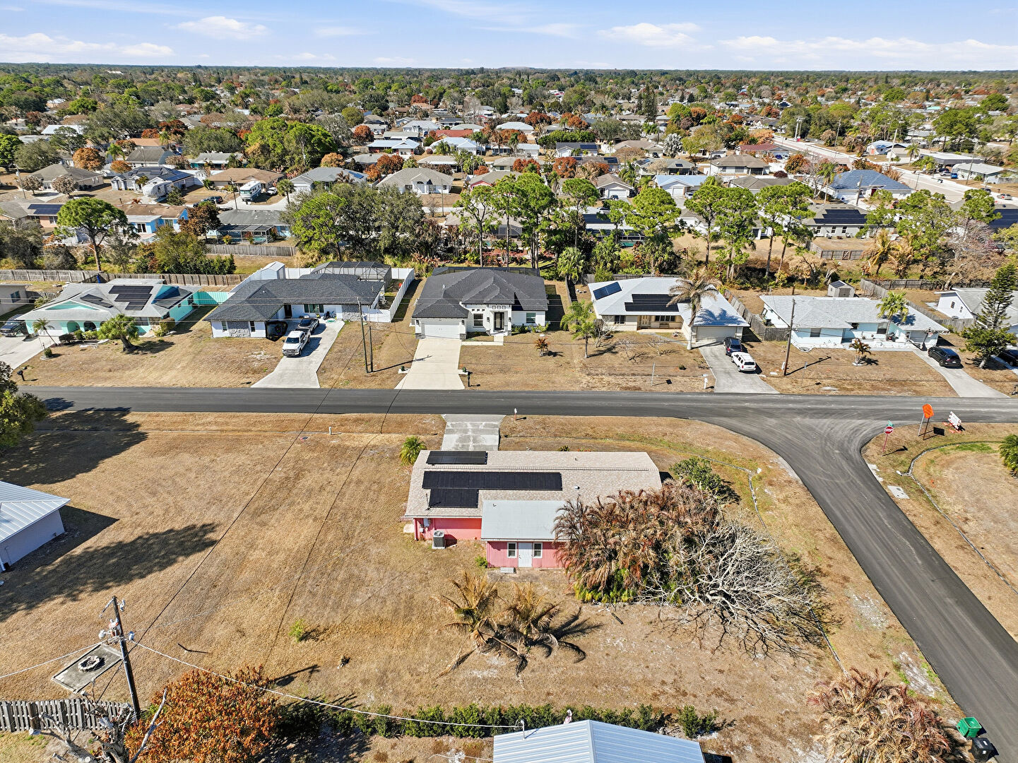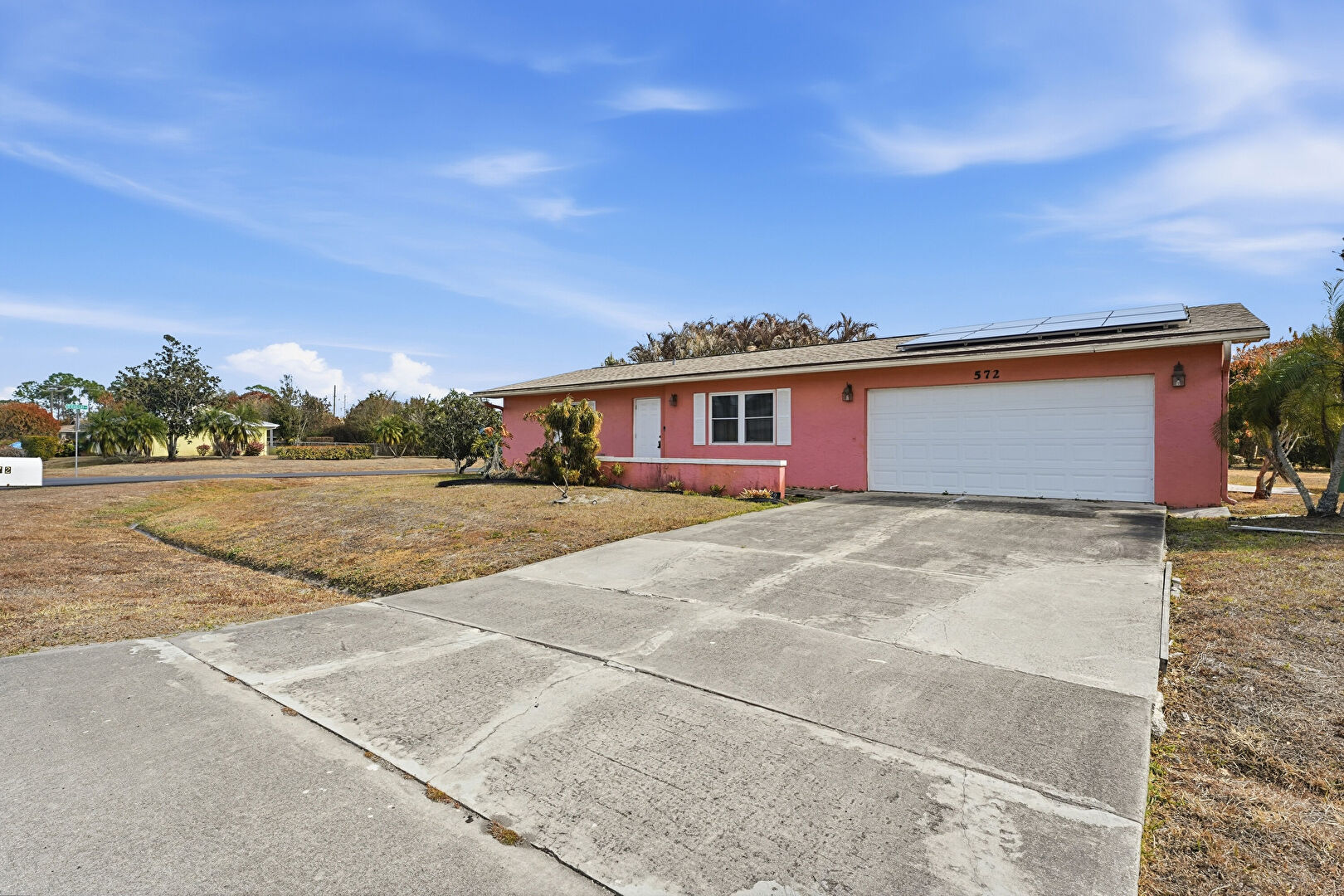 Downspout, Driveway, Fence, Gutters, Lawn, Residential View, Shingle Roof, Solar Panels, Stucco Siding, Woods View, Driveway, Lawn, Solar Panels, Stucco Siding