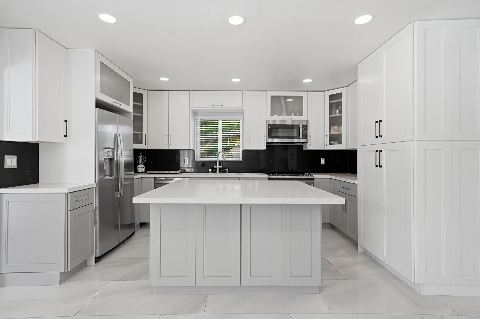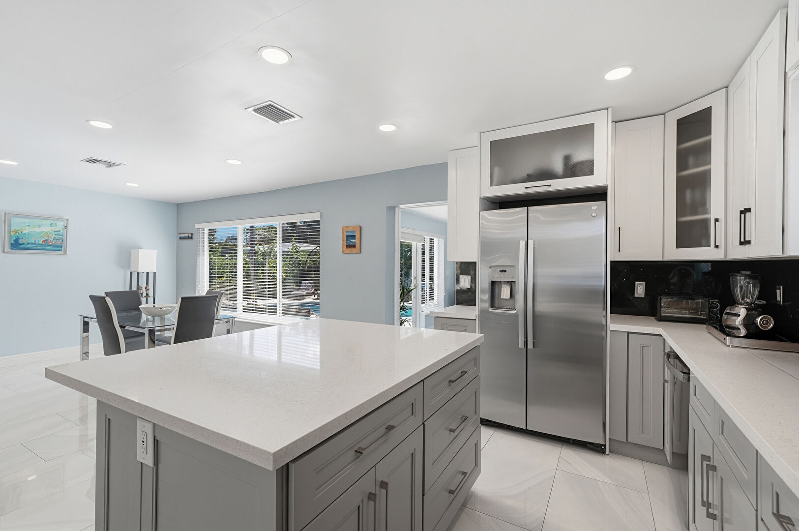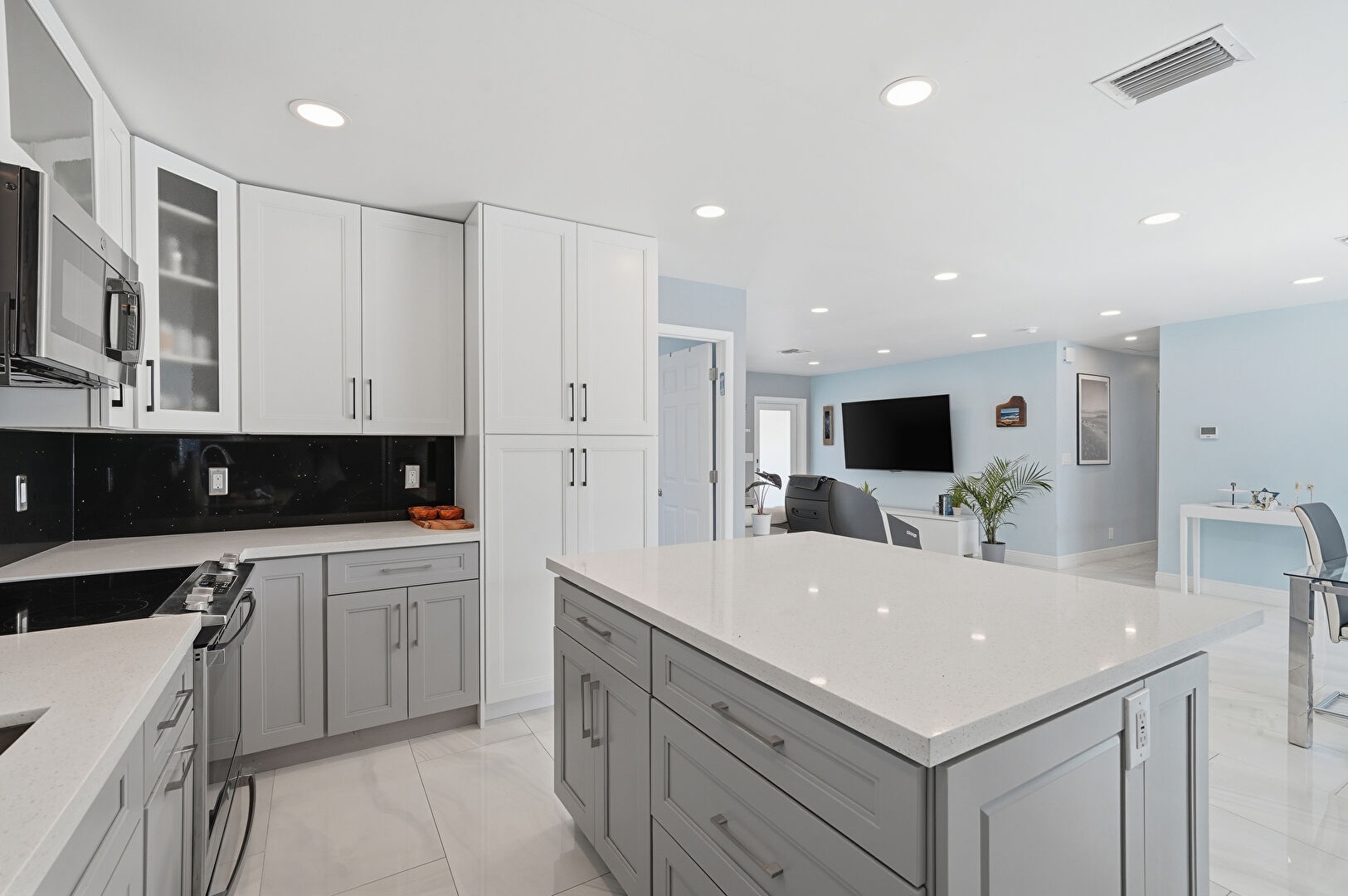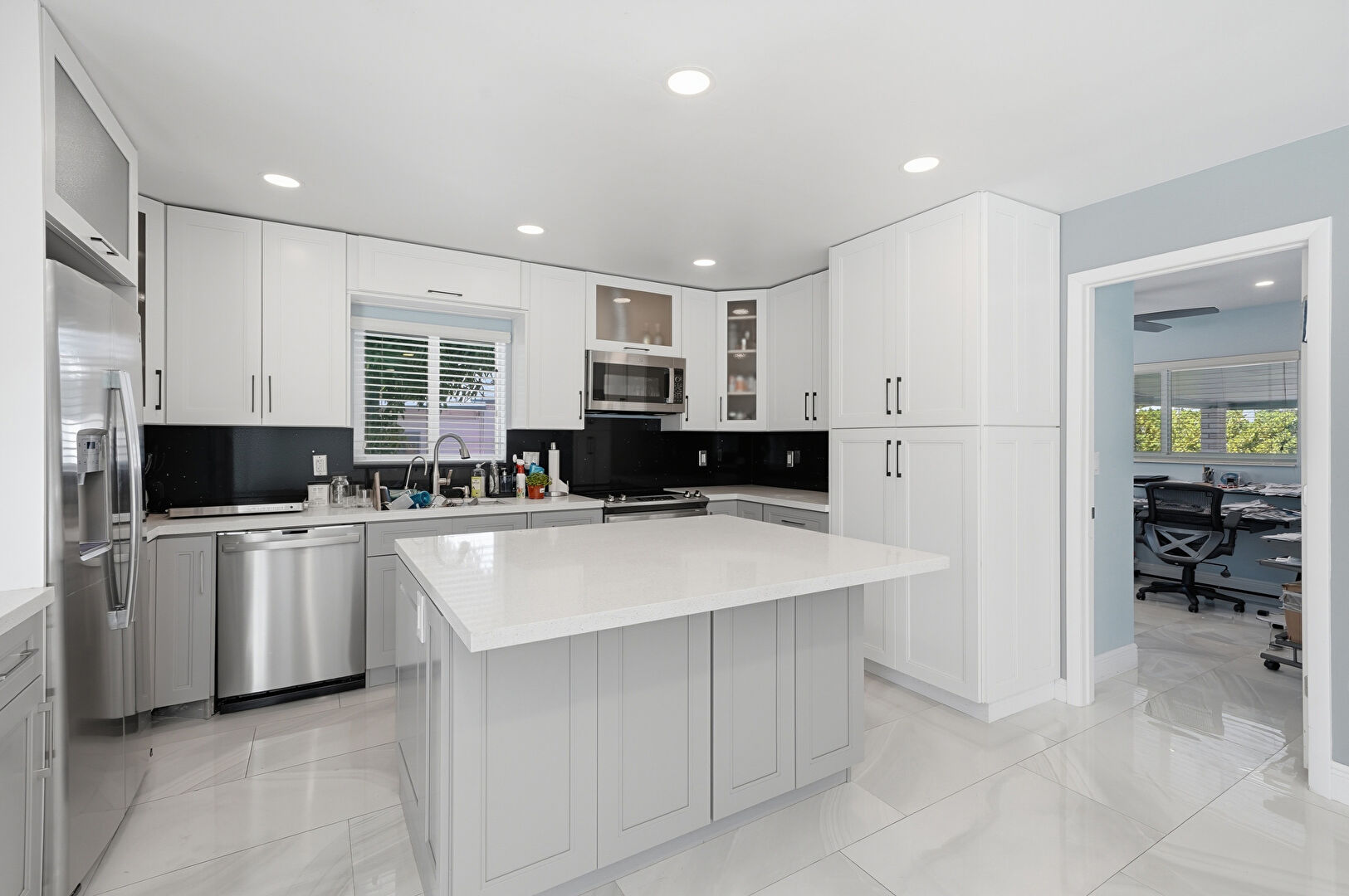 Baseboards Wall, Drywall, Glass Insert Cabinets, Gray Cabinets, Kitchen Island, Marble Finish Floor, Natural Light, Office Area, Opens To Living Area, Recessed Lighting, Shaker Cabinets, Stone Countertops, U Shaped Kitchen, Vent, Kitchen Island, Stone Countertops