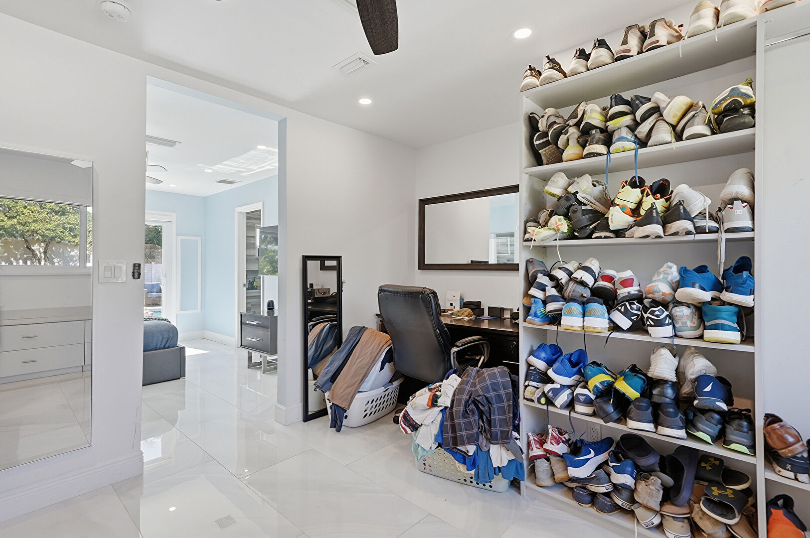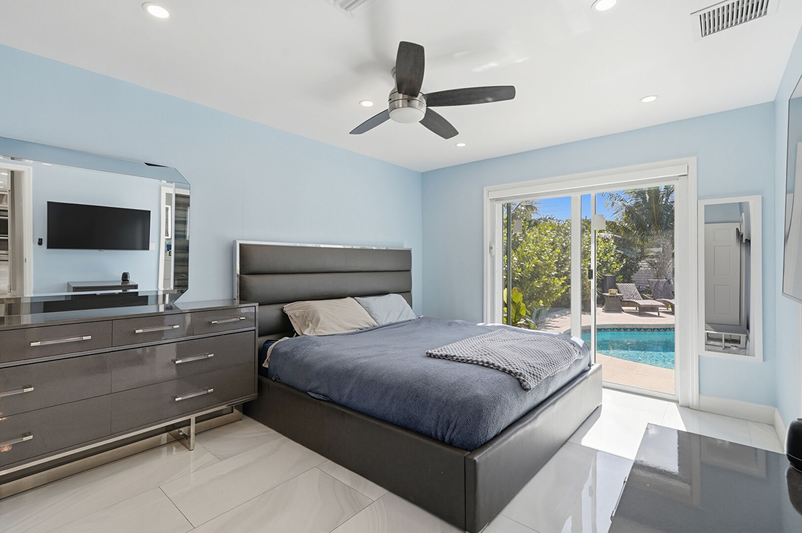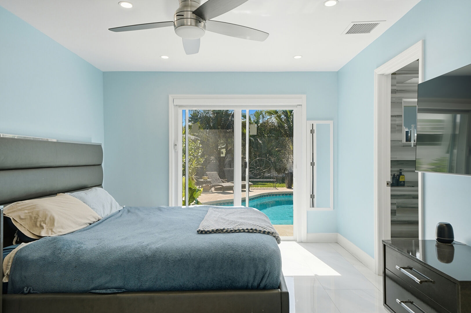 Access To Exterior, Baseboards Wall, Ceiling Fan, Drywall, Ensuite Bathroom, Natural Light, Pool View, Recessed Lighting, Tile Floor, Vent, Walk In Closet, Ceiling Fan, Recessed Lighting