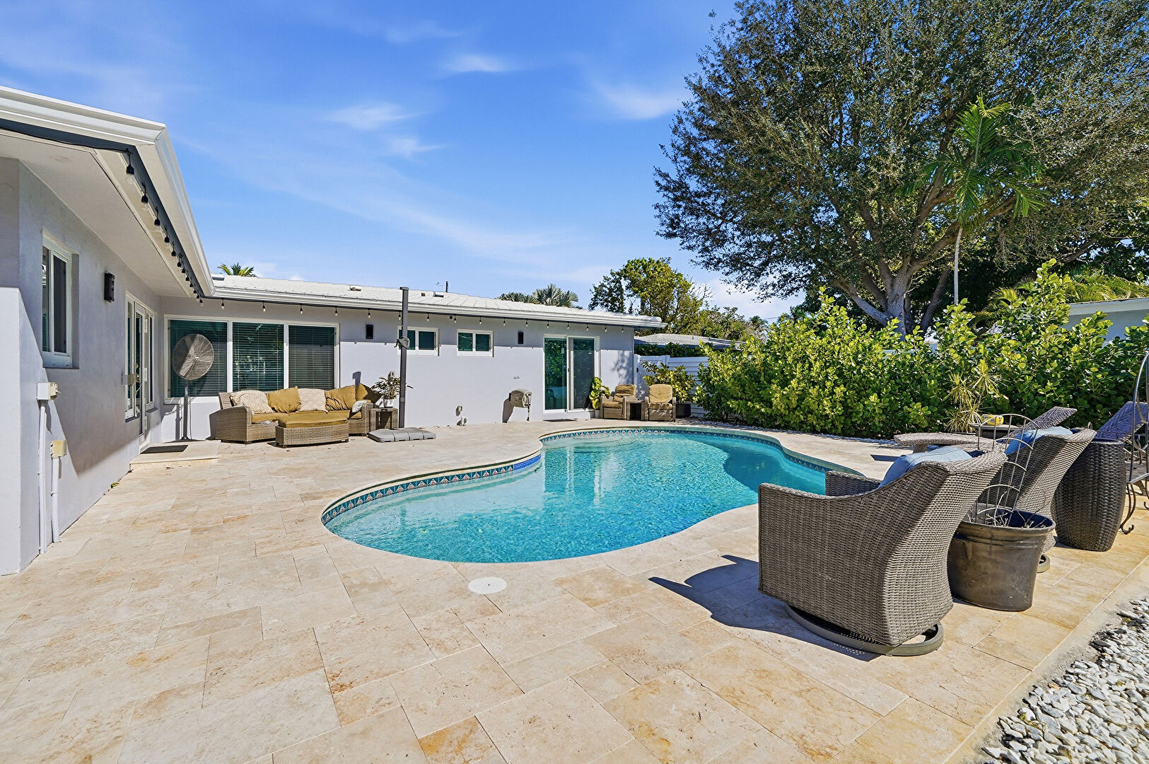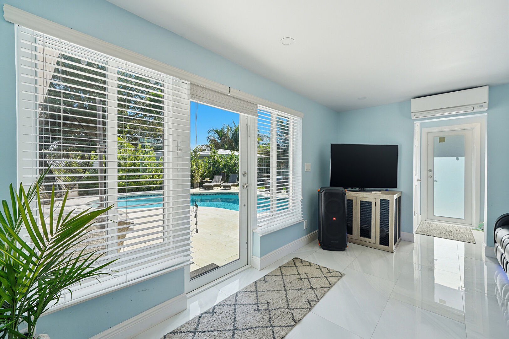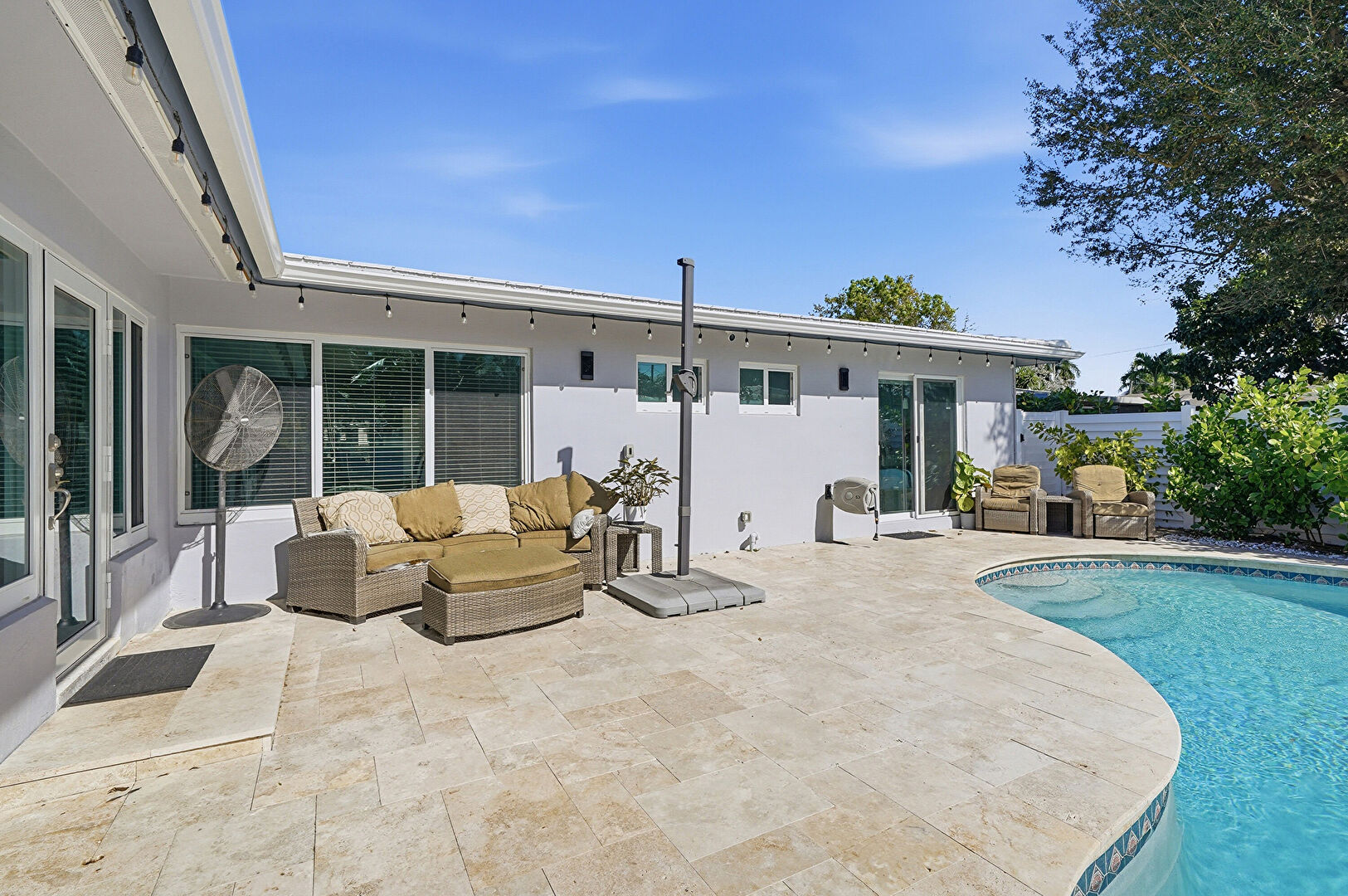 Access To Exterior, Baseboards Wall, Ceiling Fan, Drywall, Ensuite Bathroom, Natural Light, Pool View, Recessed Lighting, Tile Floor, Vent, Walk In Closet, Ceiling Fan, Recessed Lighting